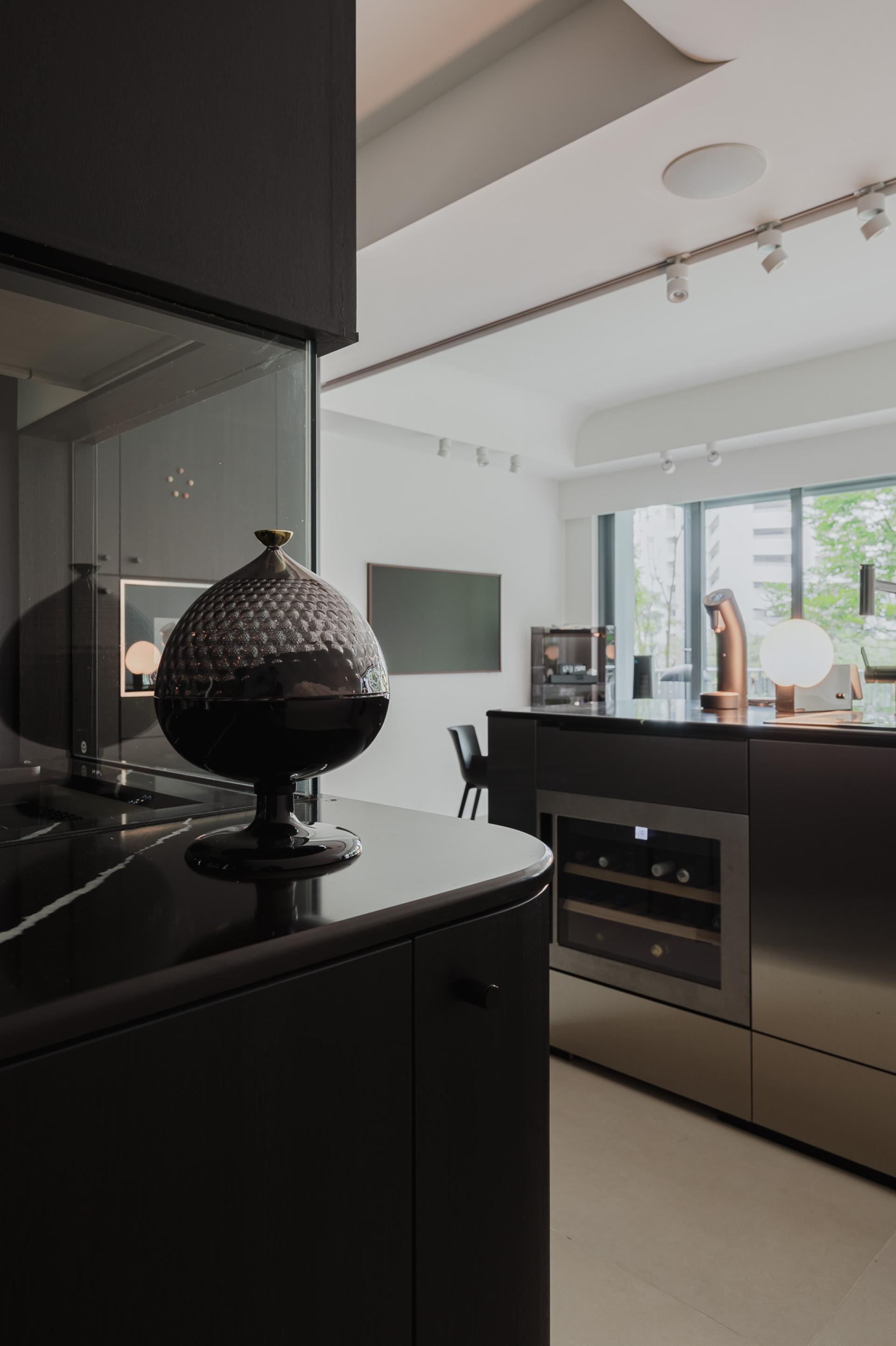 Measuring 1350 sqft, this 4-bedroom executive condominium features curvaceous corners for both safety and aesthetic considerations. The client requested a design that embodies timeless minimalism, cleanliness, and boldness, while fostering a spacious, relaxing atmosphere reminiscent of a villa, with a mysterious, luxurious touch. The space was designed with a monochrome palette of black, white, and cream to maintain a minimalist yet sophisticated vibe, while drawing inspiration from industrial luxury and the mysterious ambiance of submarine steel, old castle valley walls, and vault entrances.