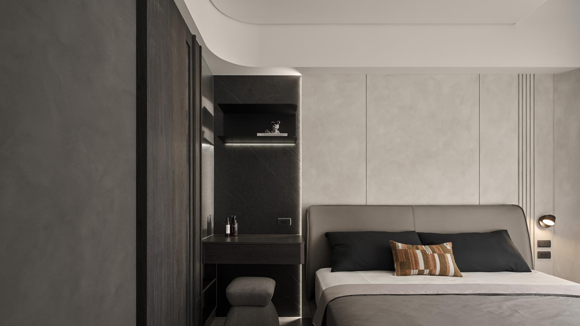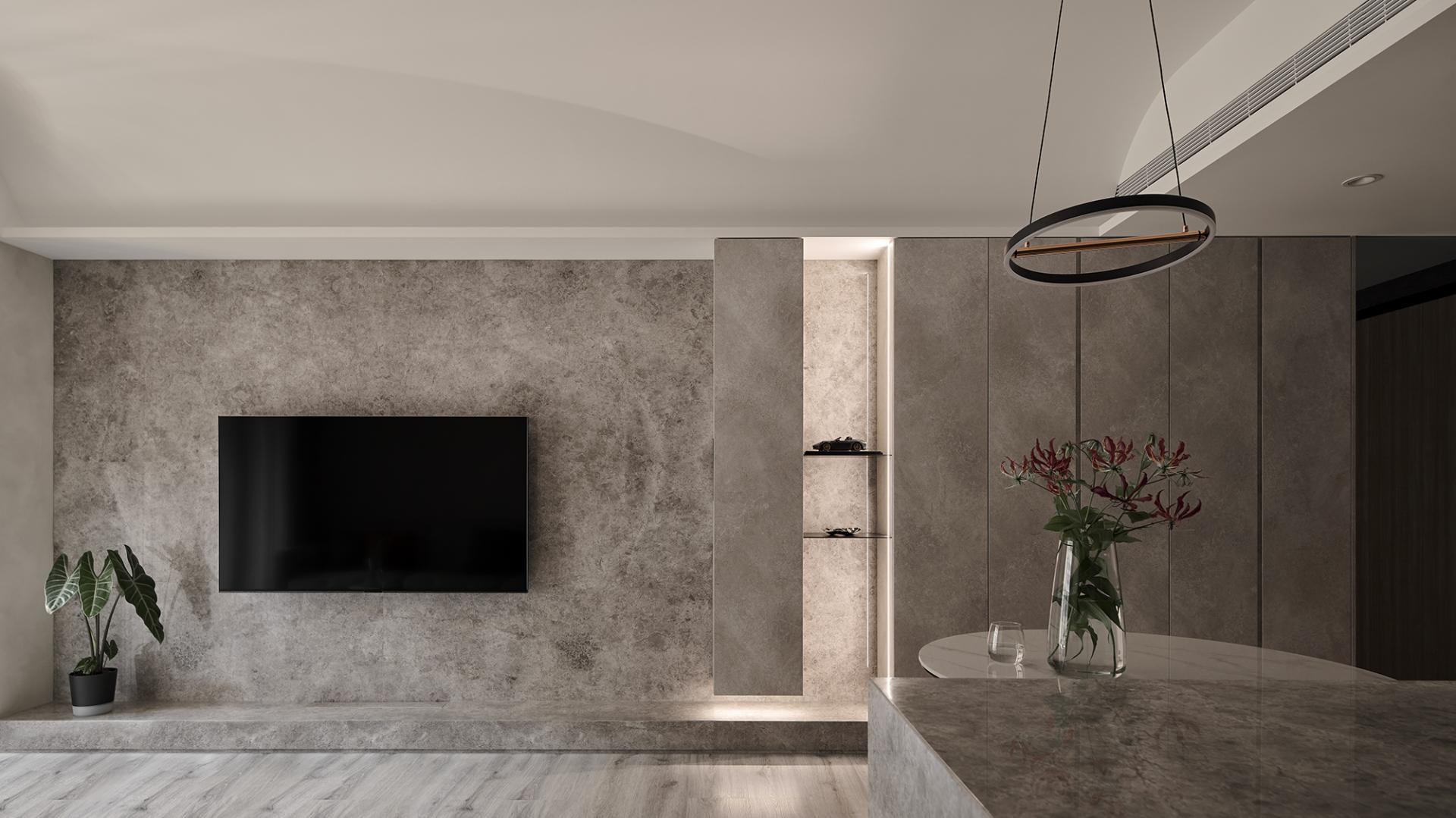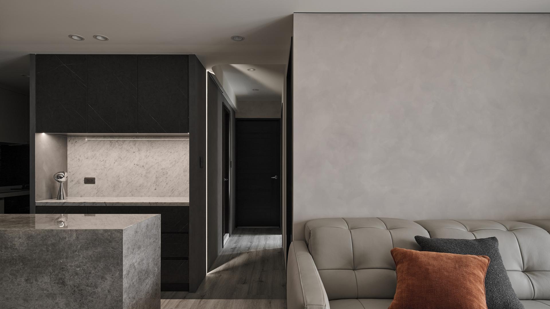 This newly completed apartment in Taoyuan’s Qingpu District was designed for two. The owners had a clear preference for neutral tones—eschewing both the wood-heavy warmth of Japanese interiors and high-saturation colors—in favor of a modern, clean, and refined grey palette. Without removing walls or generating waste, the design centered on functional integration, reorganizing the circulation between the refrigerator, appliance cabinet, and island. Lighting and a curved ceiling were introduced to mitigate beam pressure, allowing this compact layout to feel more expansive, cohesive, and filled with rhythm and order.