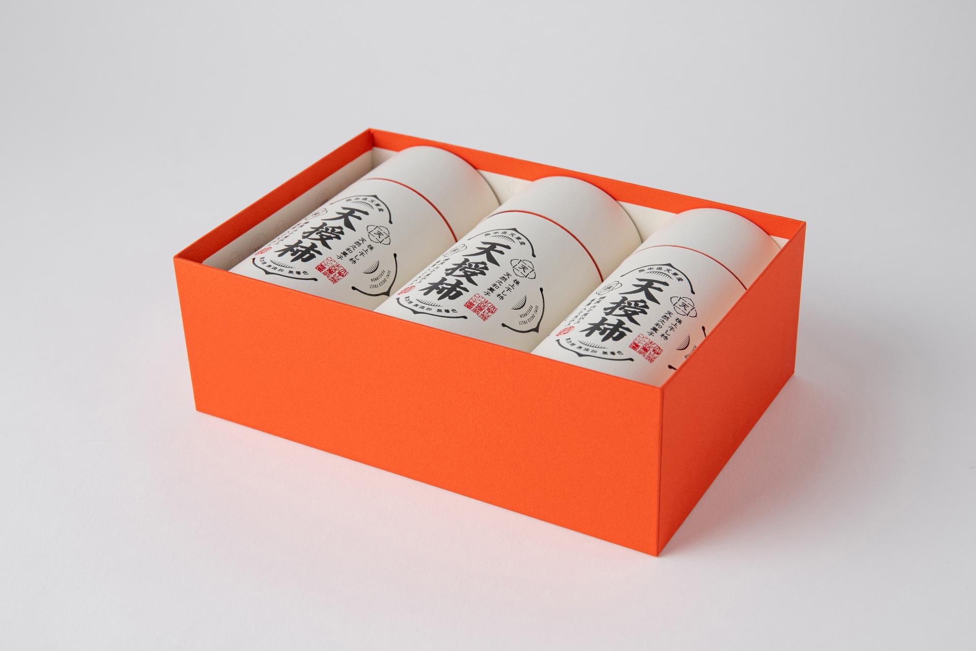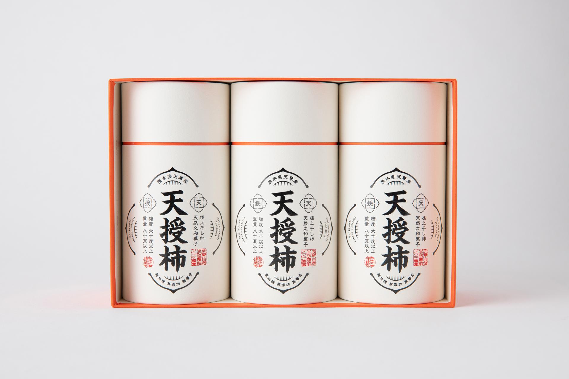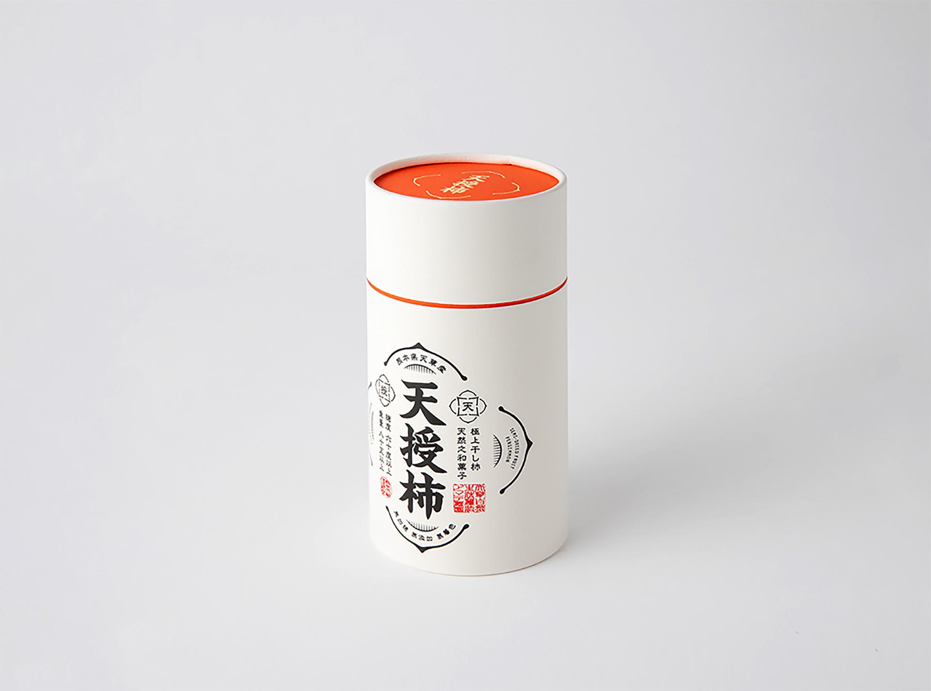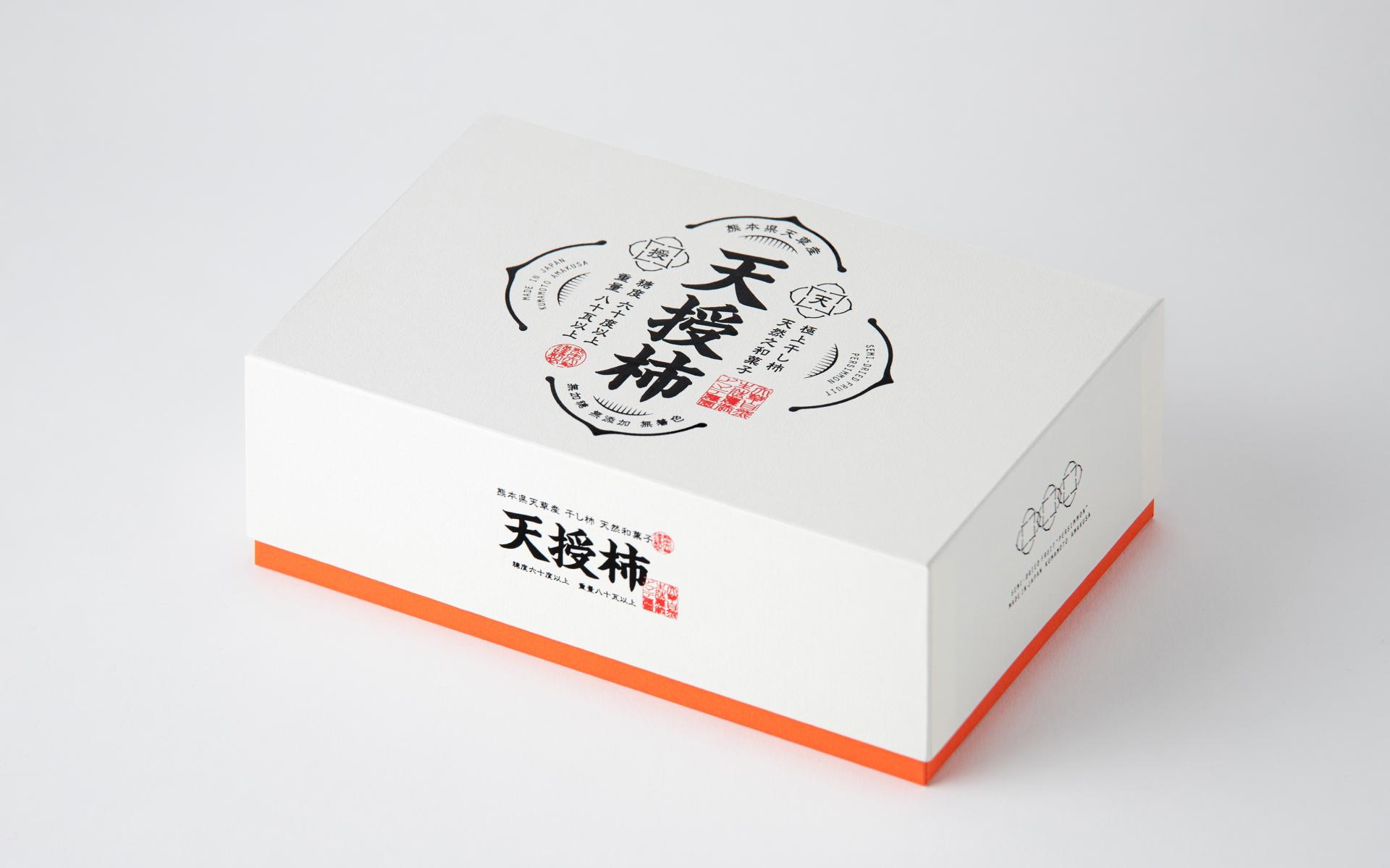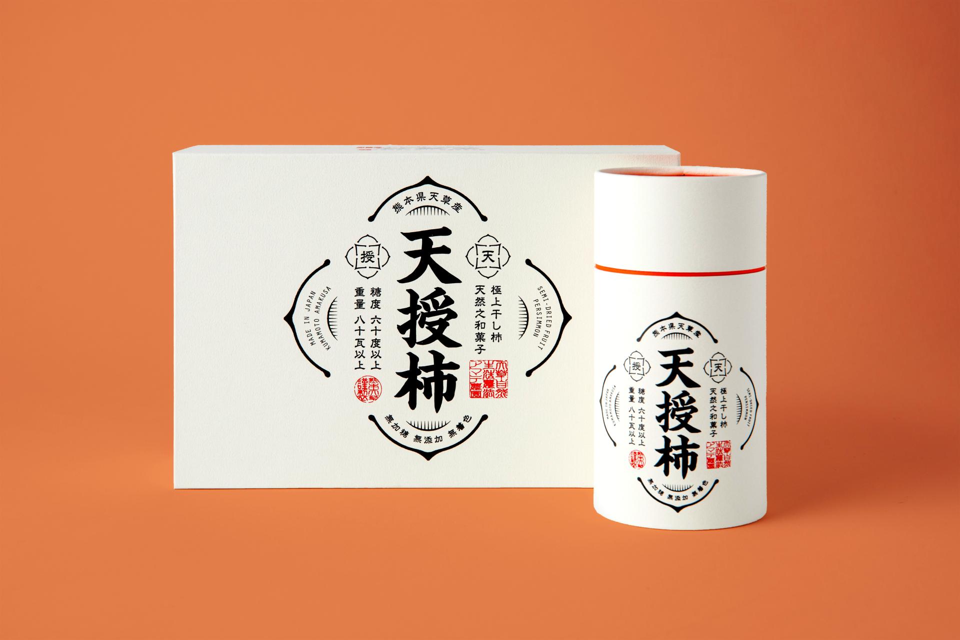 TENJYU-KAKI: The miraculous dried persimmons born by chance in Amakusa City, Kumamoto Prefecture. These one-of-a-kind dried persimmons represent a unique drying method perfected over more than a decade. The defining characteristics—persimmons grown exceptionally large through mutation and the time invested to bring them to market—reflect the craftsman's confidence and dedication. To convey their true value, we chose an upright packaging design. Simple yet powerful, it expresses the essence of craftsmanship.