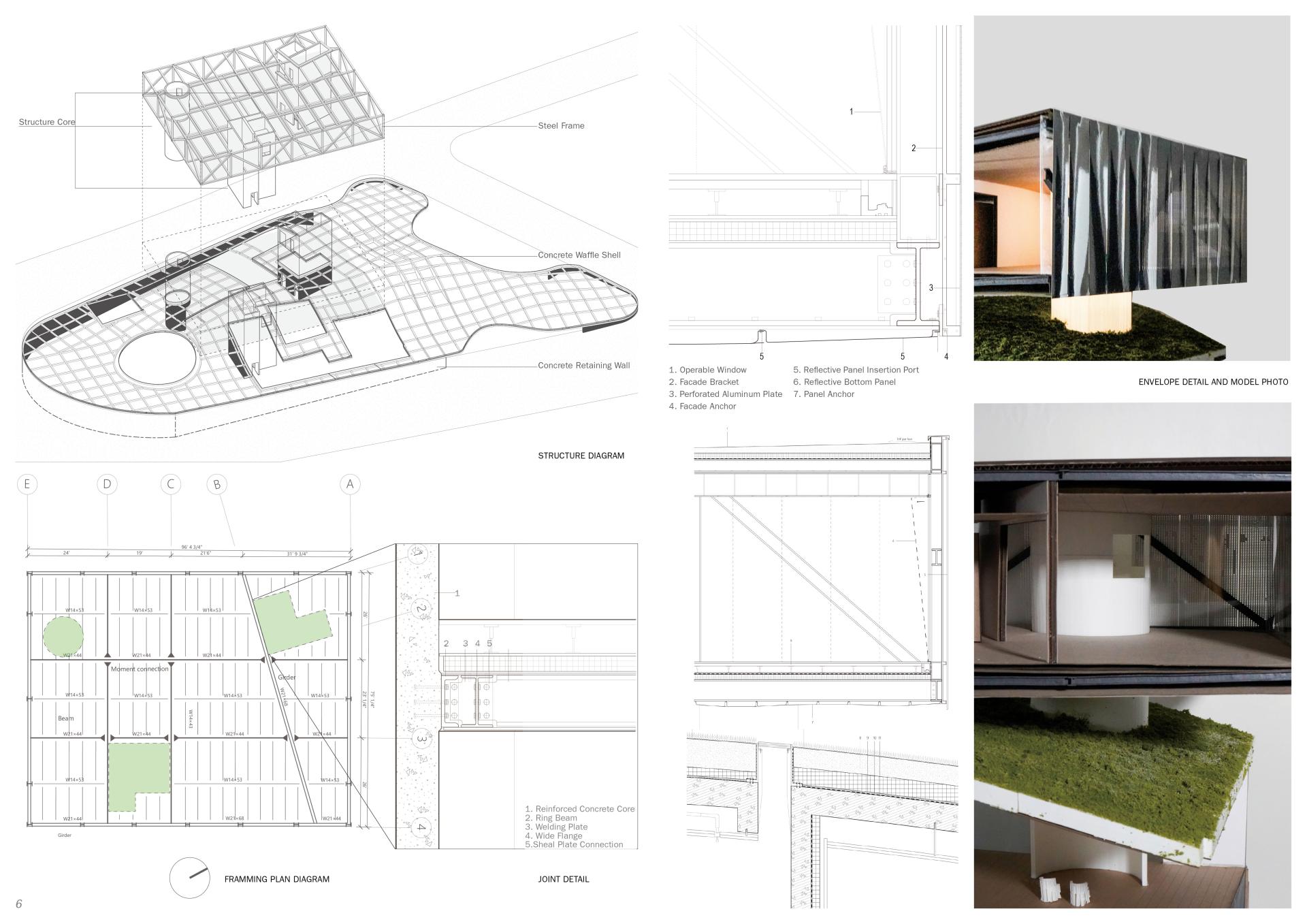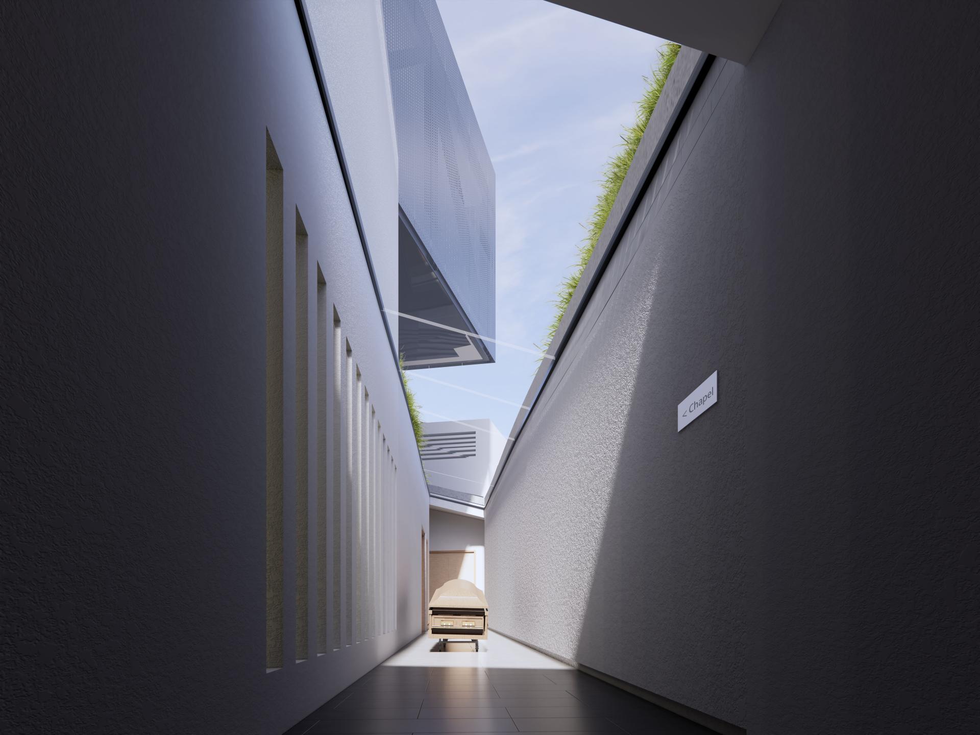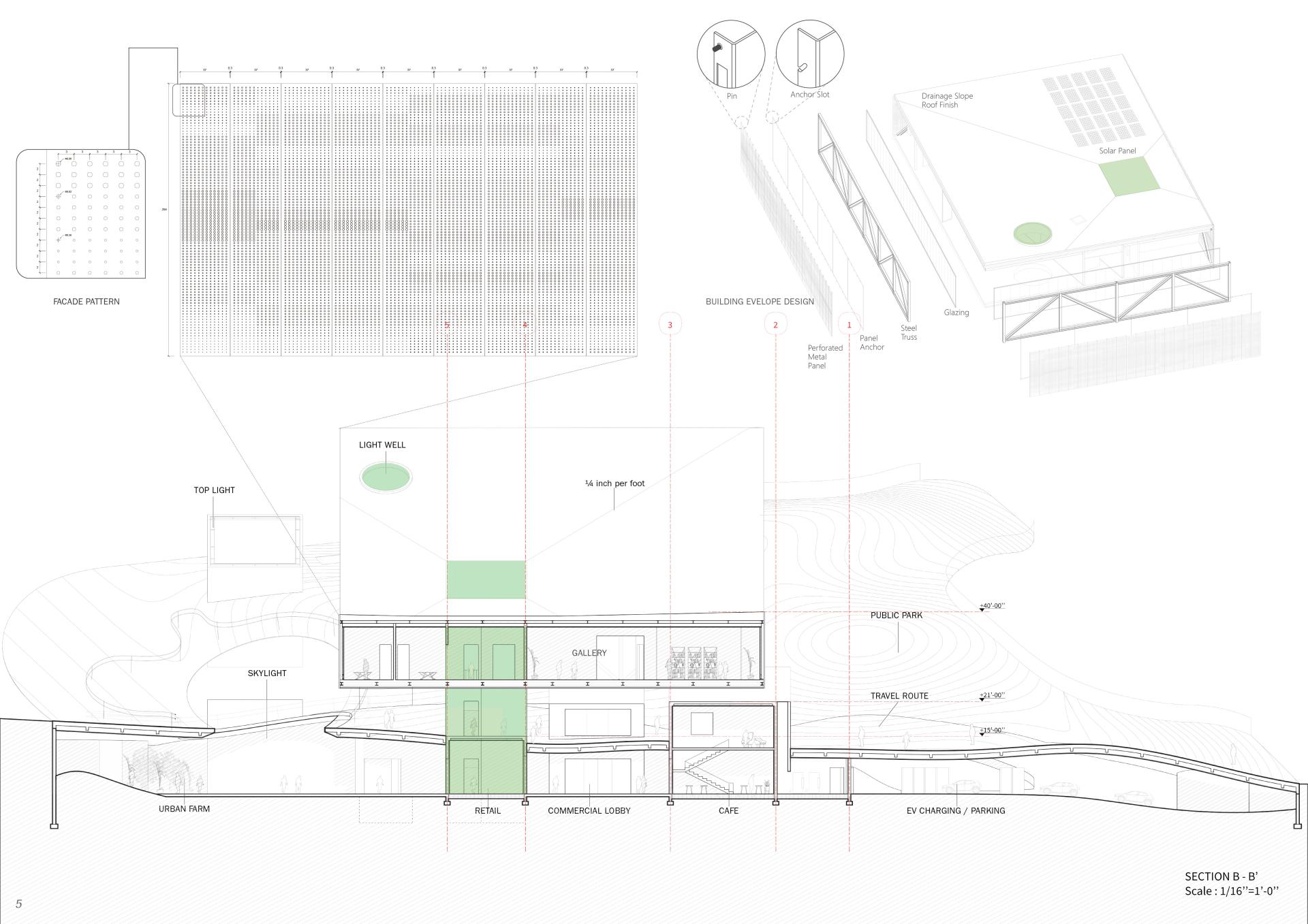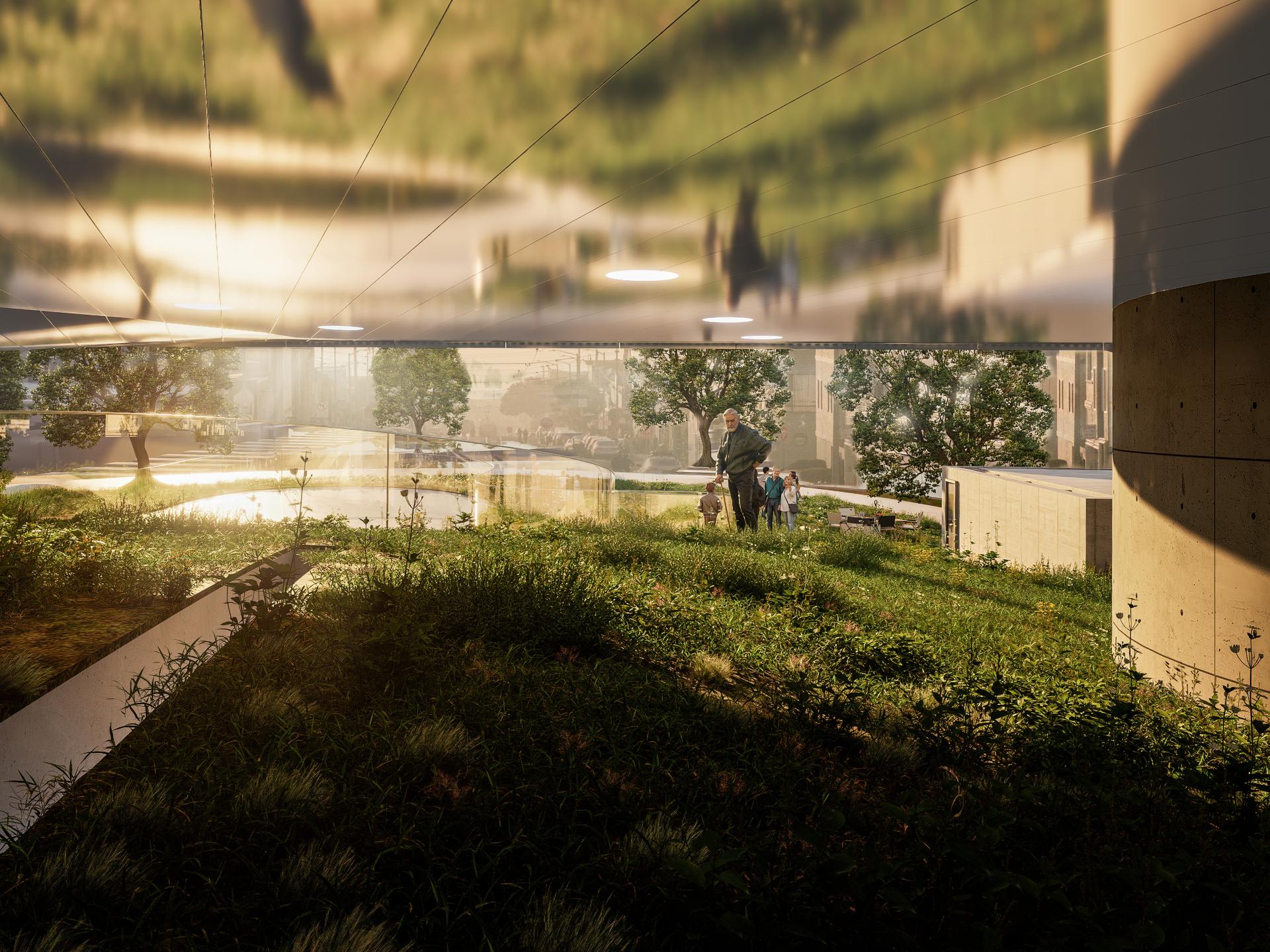 The project’s identity emerges from the juxtaposition of layered realms. At the base, one wing opens directly to the street with cafés and retail, ensuring a lively and accessible edge, while the other contains memorial spaces dedicated to ritual and remembrance, offering quiet contrast. Above them, an urban park stretches across the site, forming a civic terrace where residents can pause, gather, and enjoy open green space within the dense fabric of the Mission. Hovering over this plateau, the lifted structure continues the duality: one side configured for exhibitions and cultural events, the other reserved for ceremonial halls and spaces of reflection. Together, these stacked layers create a civic “sandwich” where commerce and commemoration, vibrancy and silence, coexist within one architectural framework.