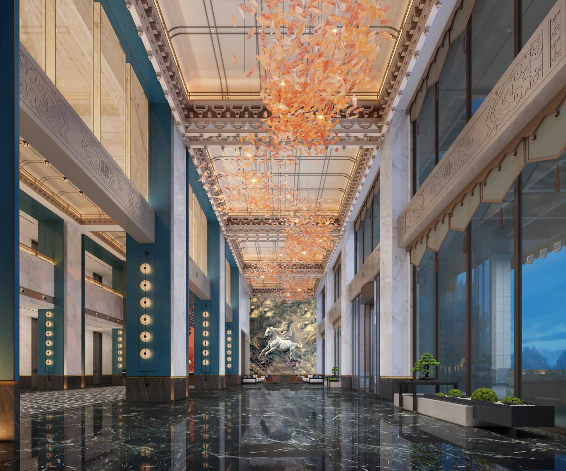 The hotel draws inspiration from multiple sources. The “Xiyi Spirit”—prosperity, openness, green development, and wisdom—informs the spatial tone, while coal as “black gold” inspires the primary palette of black and gold. Shuozhou’s equestrian culture is reflected in galloping horse reliefs, while Yingxian’s wooden pagoda is reinterpreted through abstracted “dougong” details. Suozi patterns, once used in armor, symbolize resilience and continuity, while motifs from ancient architecture, folk legends, and local crafts enrich the design narrative.