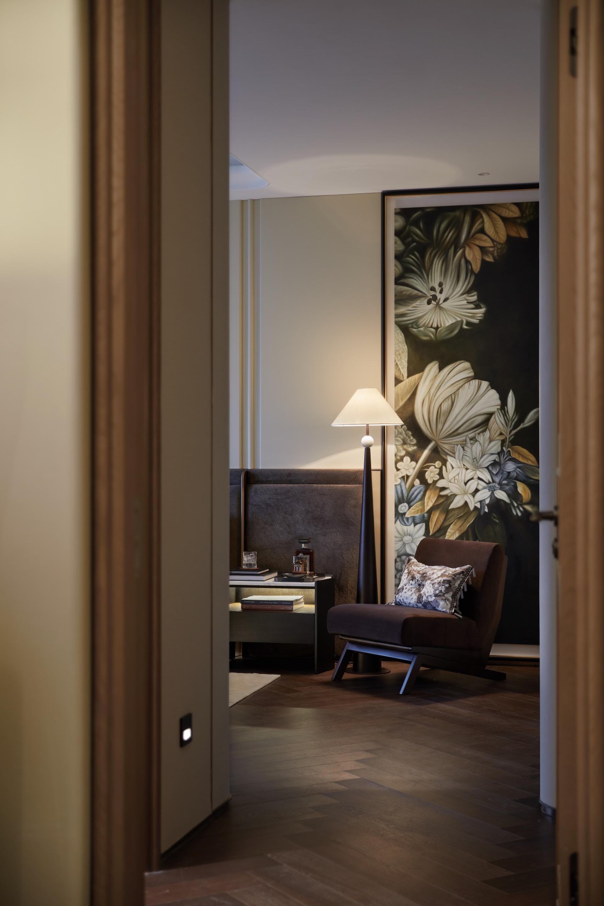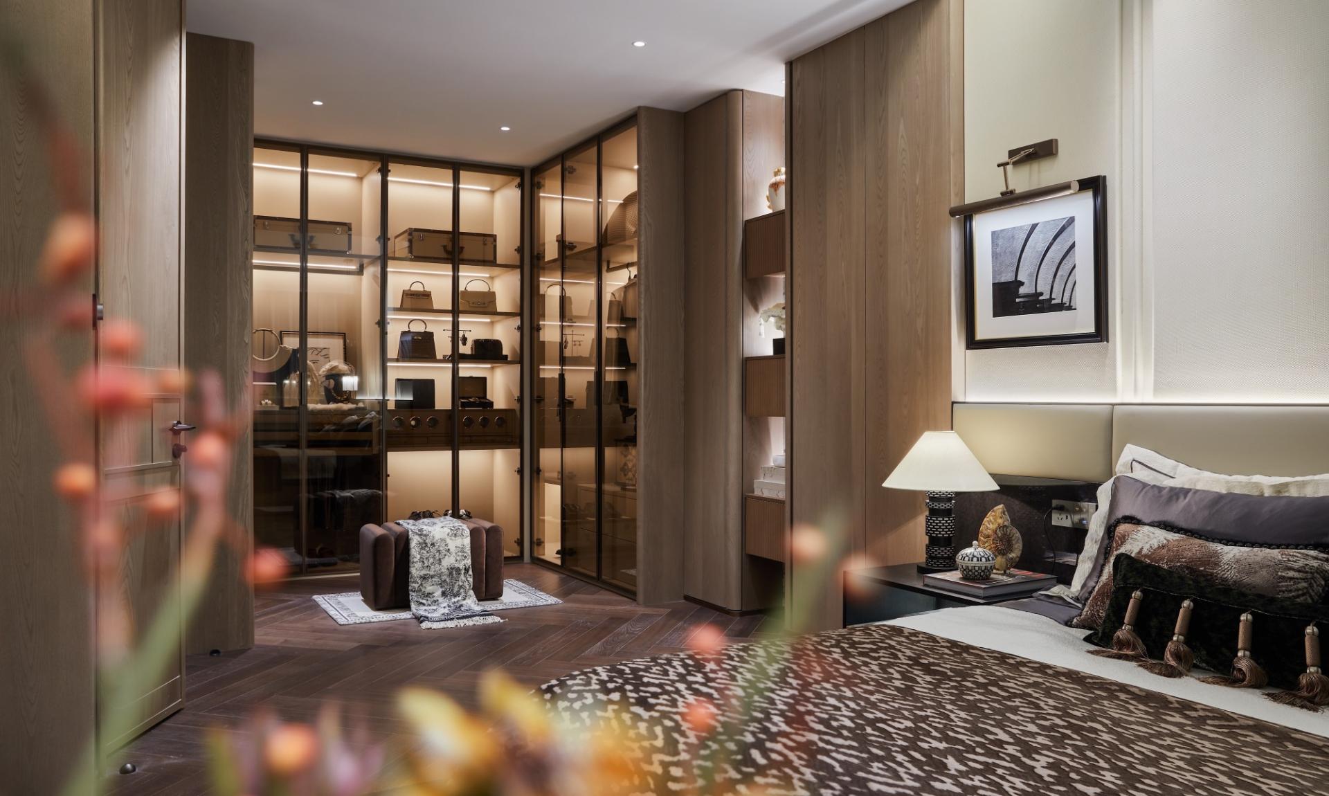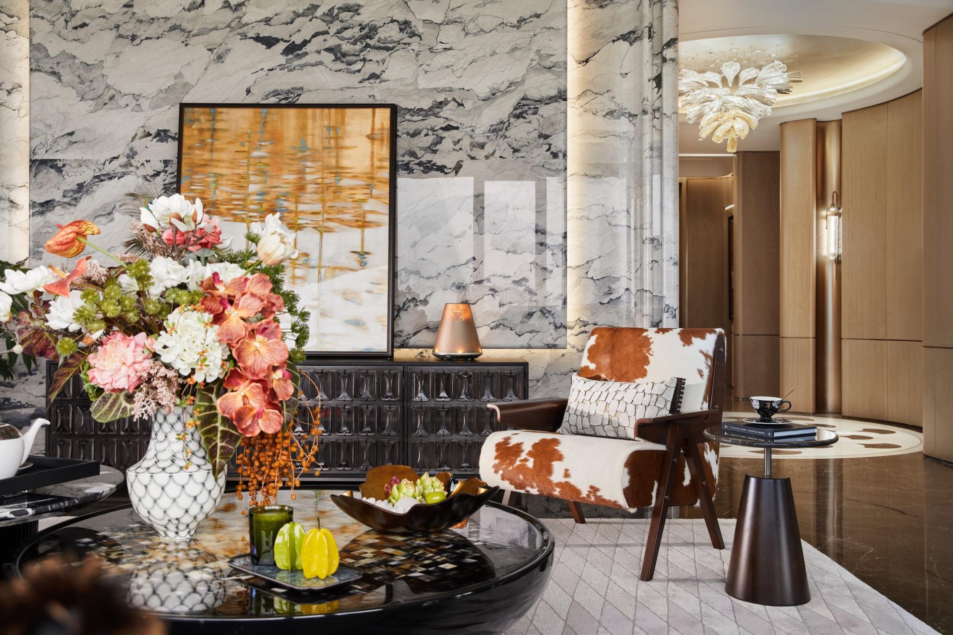 The journey home begins with a private elevator hall, establishing an exclusive "second foyer." Custom double-leaf Ginkgo-patterned armored doors and a "Stone Fortune" sculpture greet residents with auspicious symbolism. The dual-entry foyer interprets Eastern philosophy through square and circular motifs: lacquer artwork adorns the rectangular space, while silver-foiled ceilings and radiating ginkgo floor patterns echo above and below, accented by a "Blooming Prosperity" glass installation symbolizing growth and wealth.