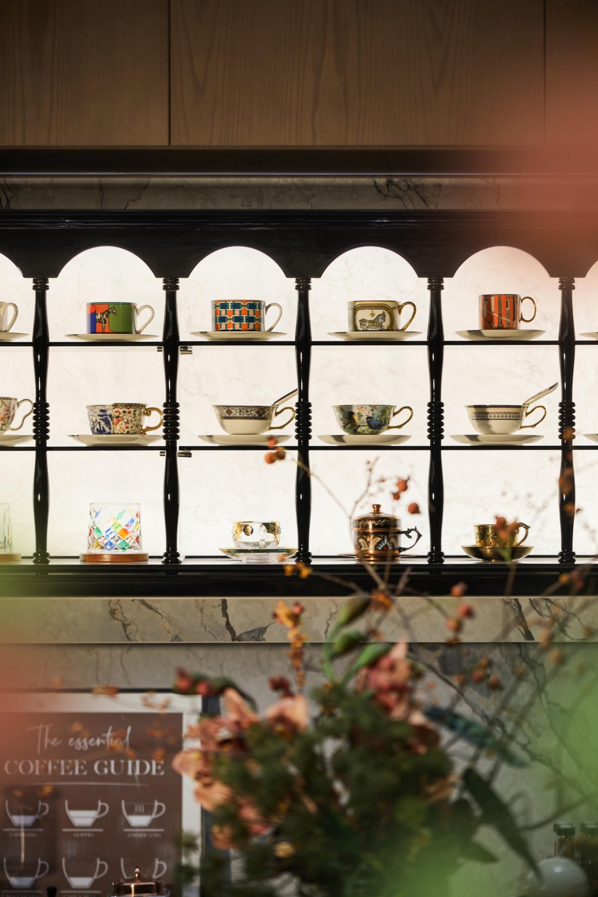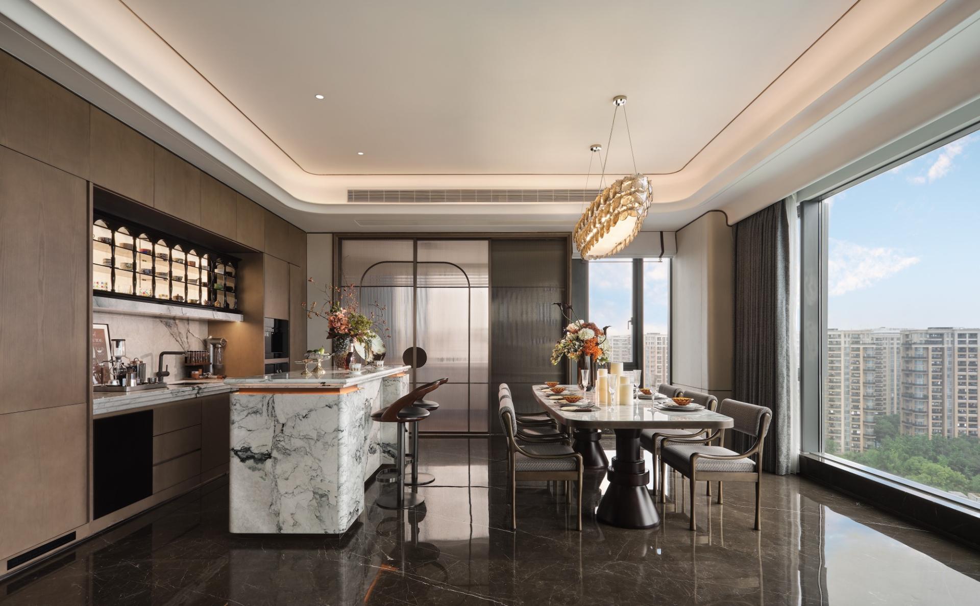 Ivan Cheng’s original butterfly-patterned cabinet reflects Zhuangzi’s dream of metamorphosis. The multifunctional tearoom merges Zen tranquility with contemporary luxury via backlit display cases, velvet chairs, and concealed lighting. In the dining area, molten-glass ginkgo-nut chandeliers anchor Art Deco tableware, while the curved kitchen island fosters social interaction alongside curated coffee rituals.