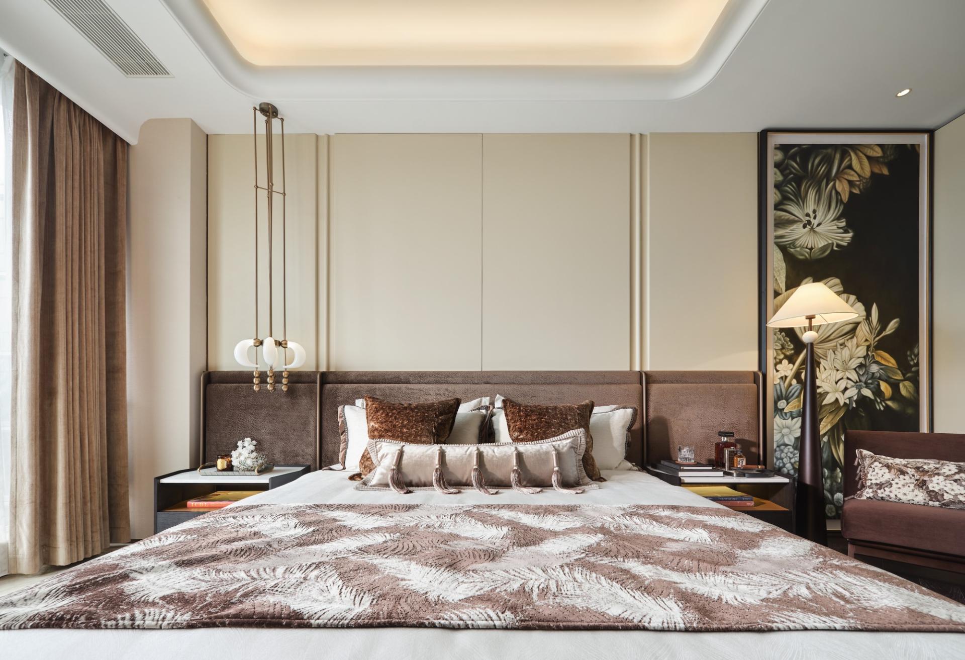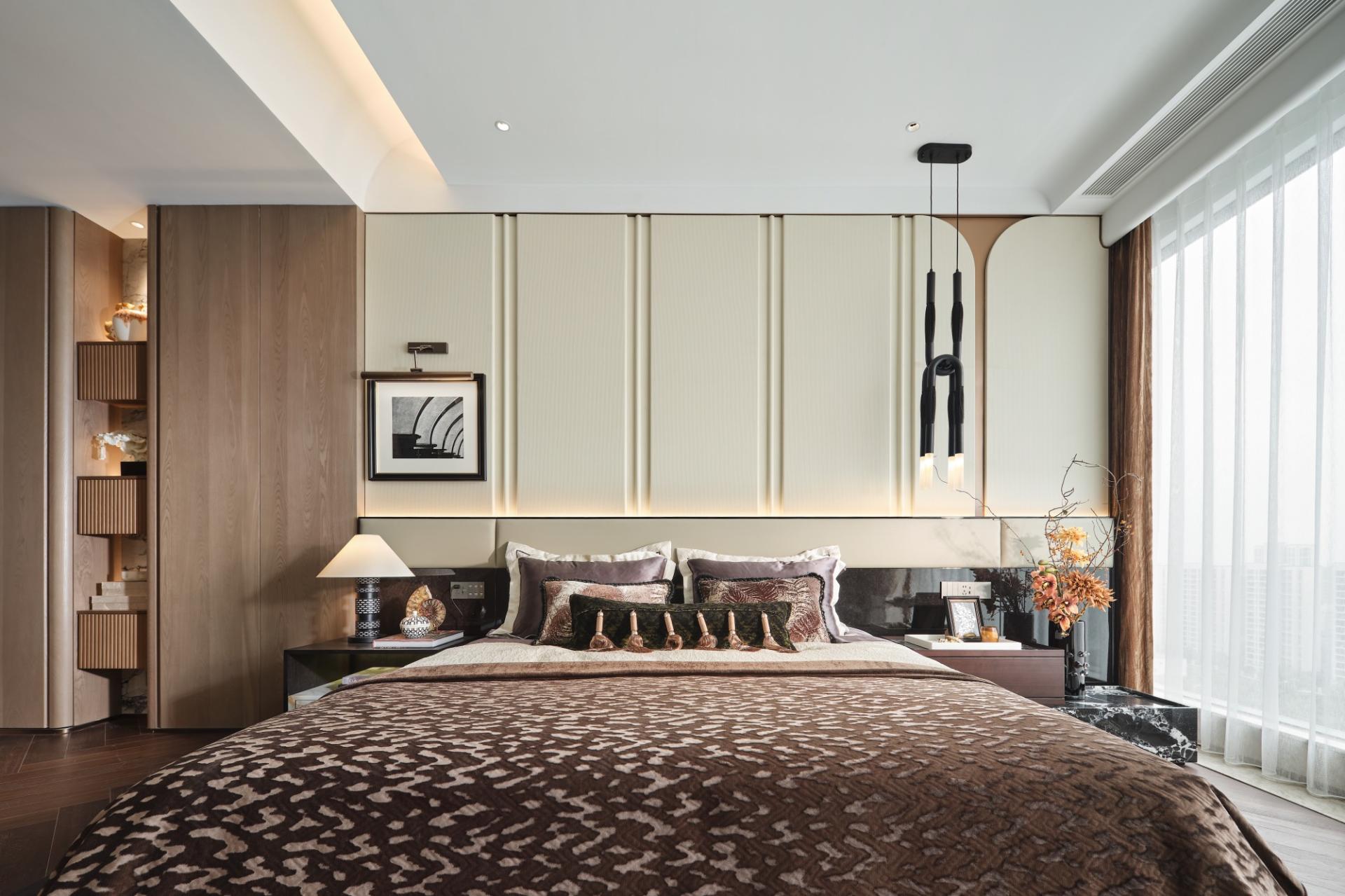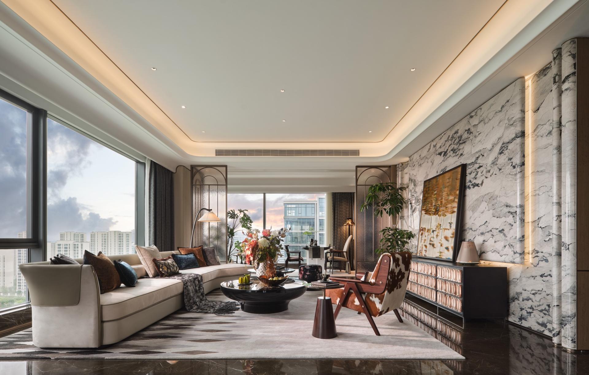 Living areas draw inspiration from Wong Kar-wai’s cinematic palette, blending beige-grey and brown bases with gradients of orange, coffee, and green for dramatic flair. Textural contrasts—leather sofas, mohair chairs, Art Deco rugs, and black stone tables—create a modern gallery-like atmosphere. A curved ceiling beam evoking phoenix pavilion roofs seamlessly divides living and dining zones while preserving 270-degree views.