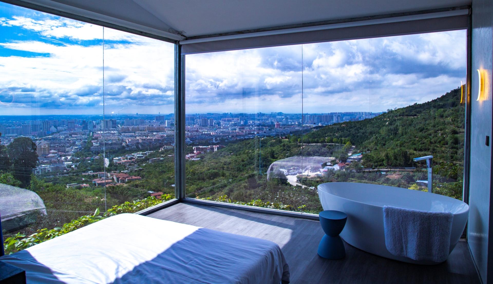 A café, lobby and lounge, outdoor pool, inner courtyard, and viewing decks—every corner framed by a landscape. The café and several rooms overlook the whole city.