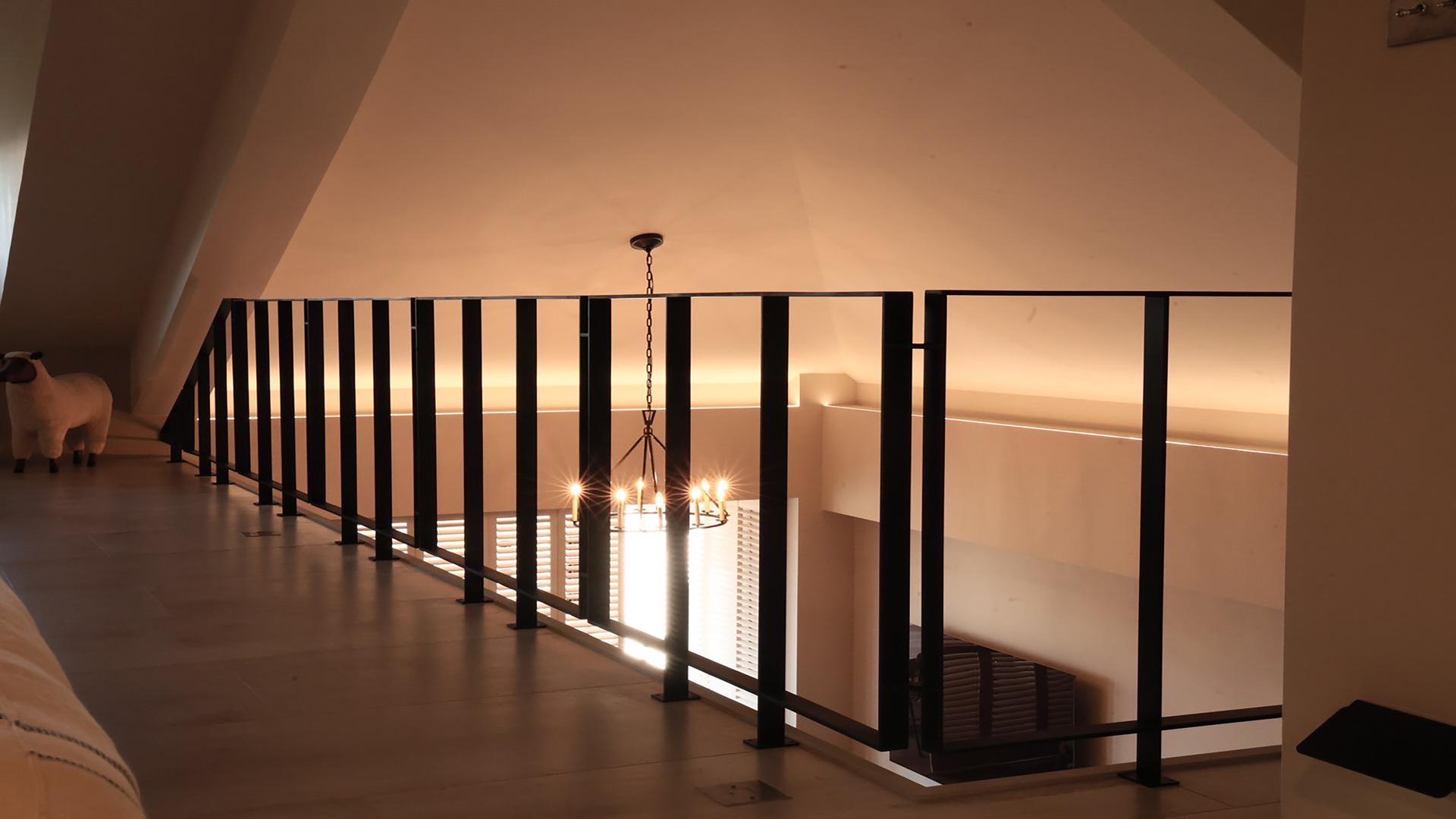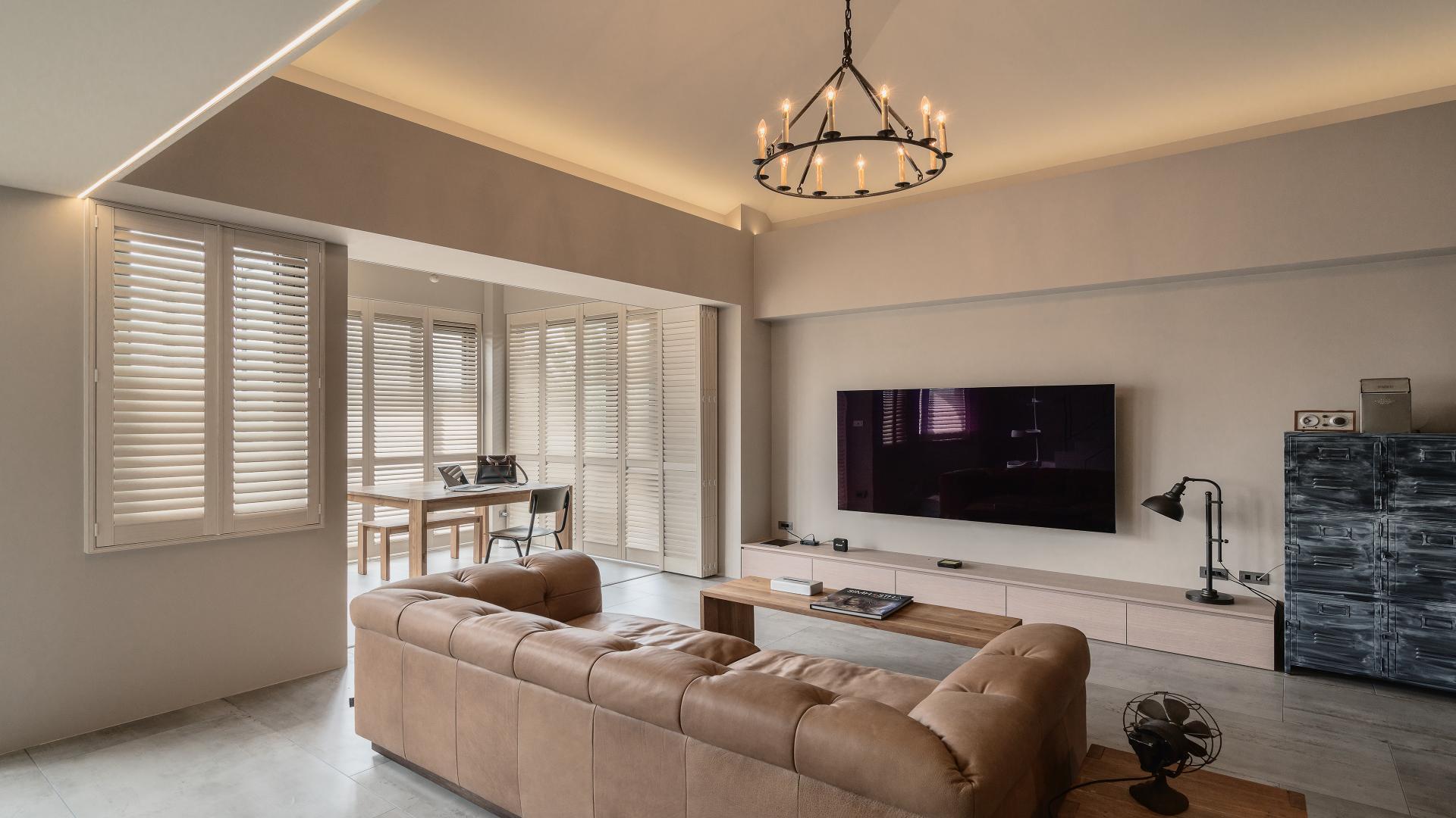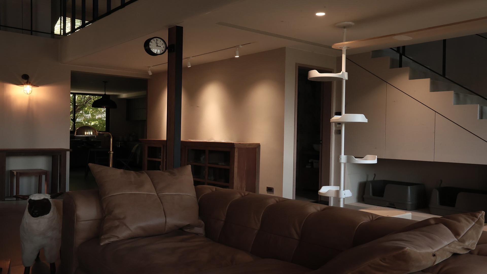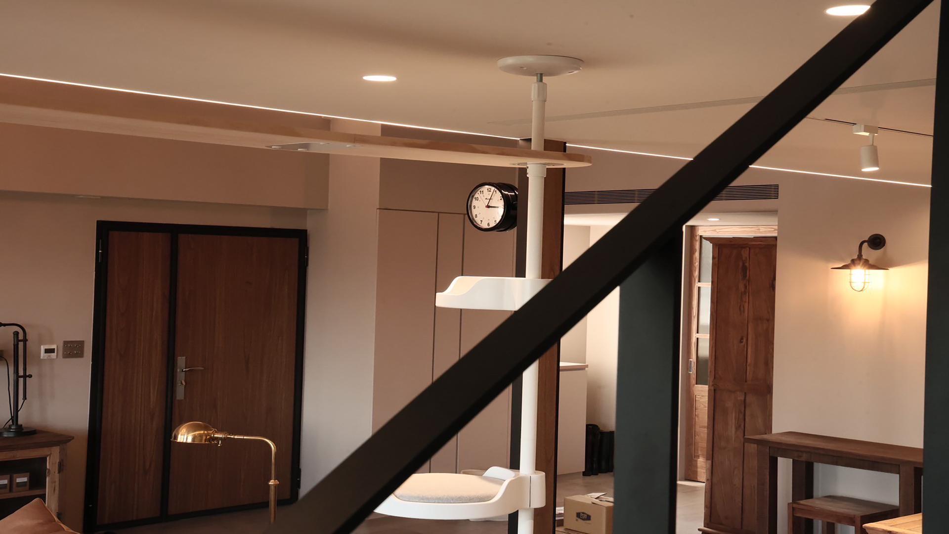 Spatially, the design emphasizes both efficiency and poetry. The staircase, composed of black steel handrails and glass balustrades, not only circulates vertically but also incorporates hidden storage, such as a built-in litter box, offering smart solutions for compact homes. Multi-source lighting—pendant lamps, wall sconces, and LED edge lights—interacts with filtered daylight through blinds, creating dynamic shadows that function as both illumination and emotional catalyst. Sliding doors blur the boundary between indoors and outdoors, enhancing natural ventilation, daylight, and therapeutic ambiance.