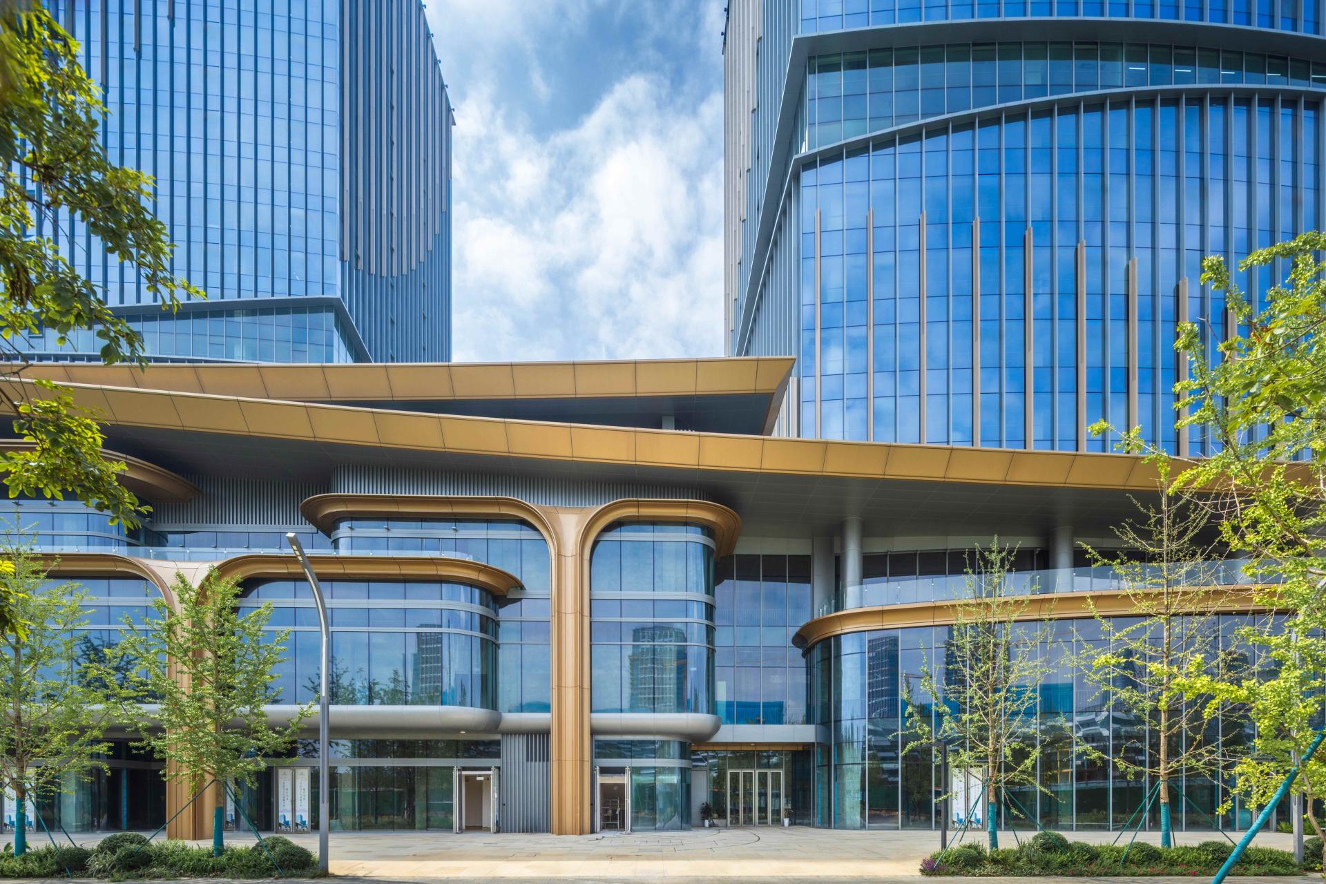Three distinctive clusters define the project’s character. The “Riverside Hill” interprets flowing waters with terraced forms and panoramic river views. The “Forest Island” integrates layered greenery, ecological courtyards, and immersive retail environments inspired by mountains and wetlands. The “Future Realm” presents a striking high-rise composition, where golden fissures and ginkgo-inspired motifs symbolize prosperity, rooted in cultural heritage yet reaching toward the future.