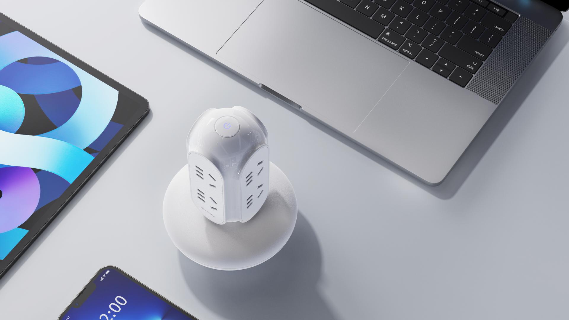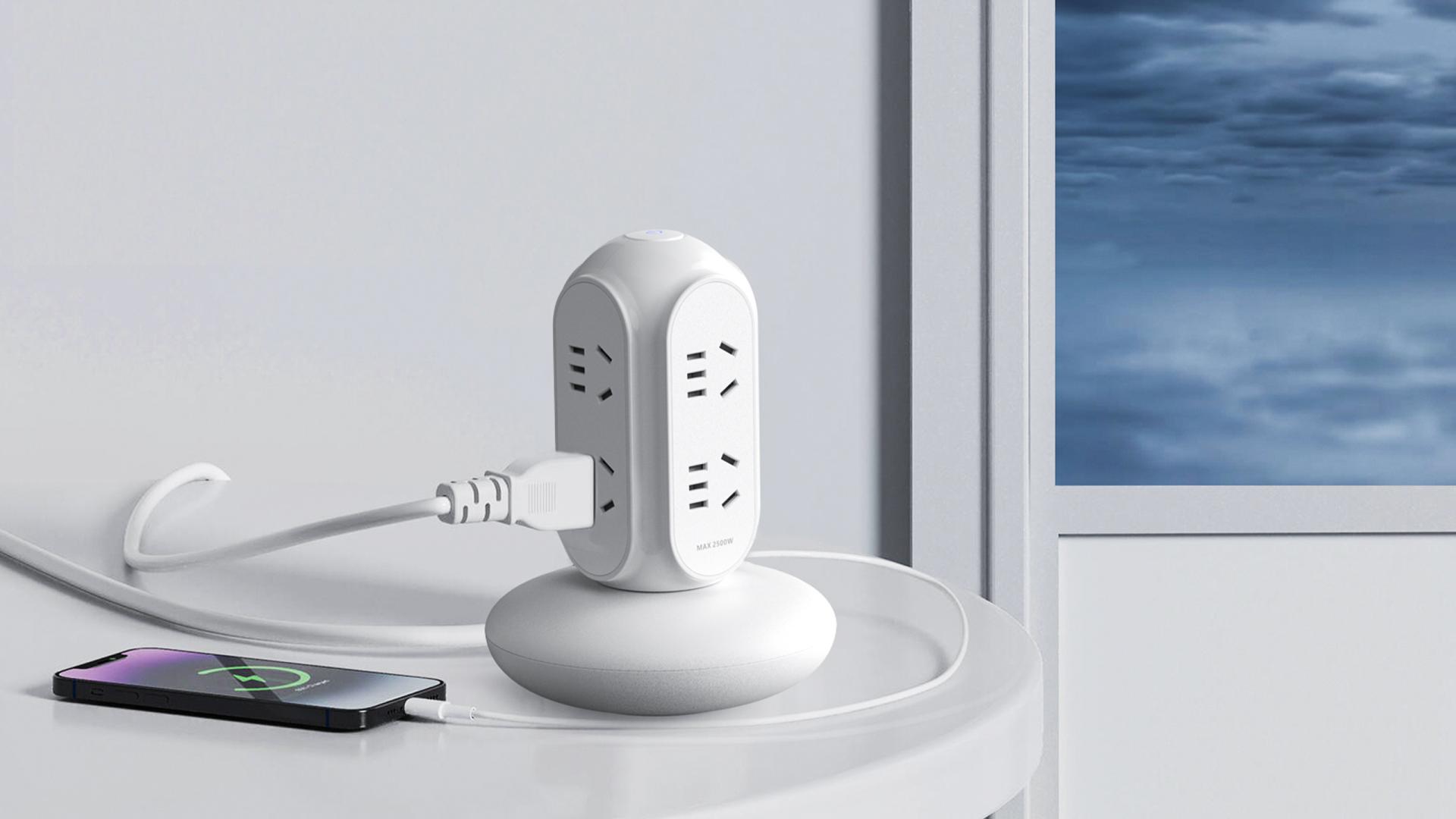 Vertical Structure: The innovative vertical structure consolidates all sockets on the tower's body, allowing cables to droop orderly, and eliminating the need for tangled cables. This prevents cables from sprawling messily in all directions. This layout not only creates a light and tidy visual appearance but also physically minimizes its footprint.