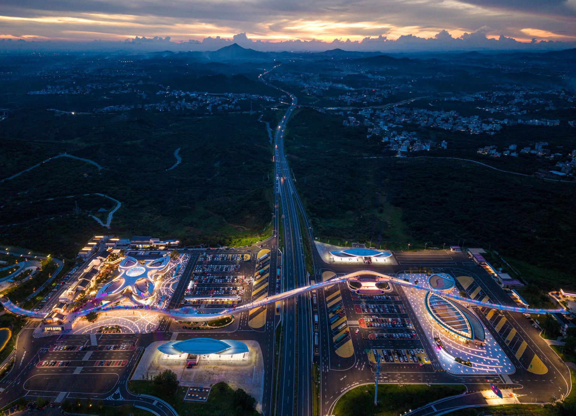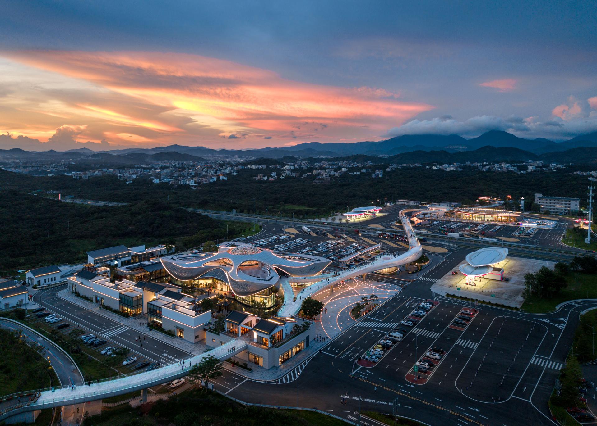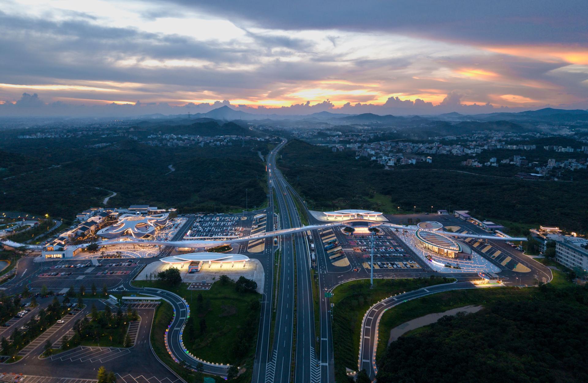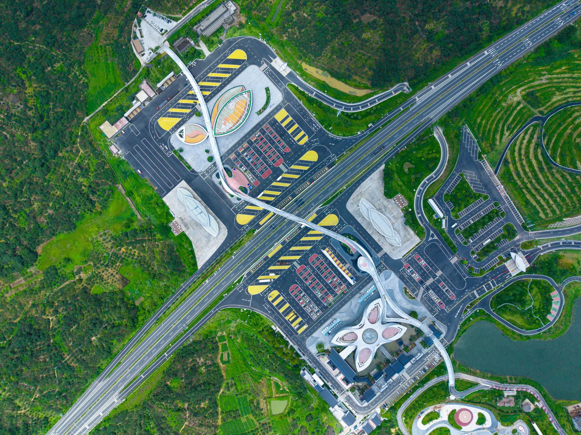 The Baiqiao Expressway Service Area of the Baotou–Maoming Expressway is a distinctive service area in the coastal mountainous region of southern China, and the surrounding villages are famous for producing lychees, but the level of economic development is low and there are no good public facilities. By adding a 600-meter-long aerial bridge, the service area not only connects the service areas on both sides of the expressway but also further links to the villages outside the service area. It achieves improvements in three aspects: first, optimizing the functional configuration of the service areas on both sides, without the need to provide two sets of identical facilities, realizing complementarity and forming distinctive functions respectively; second, residents of surrounding villages can enter the service area to share cultural, commercial, and technical facilities, enhancing public resources in the vicinity; third, travelers on the expressway can reach the towns and villages on both sides to visit and consume, promoting local economic development.
