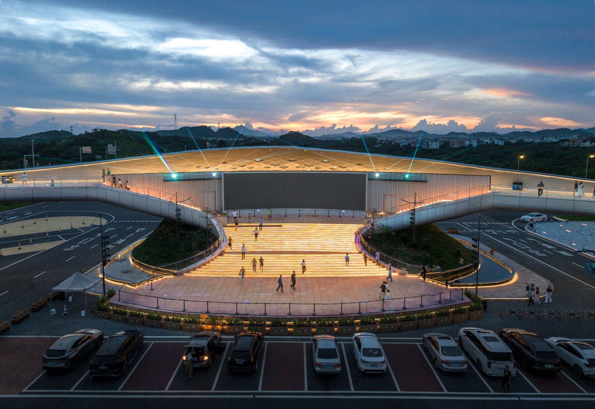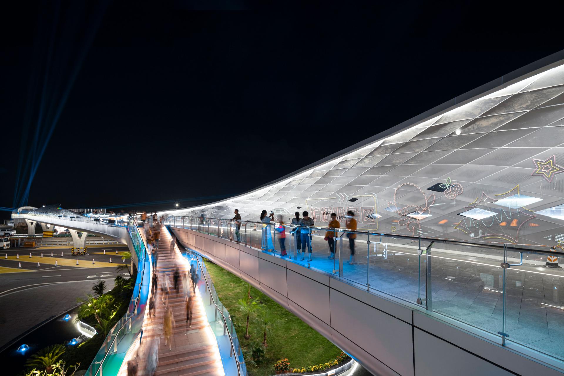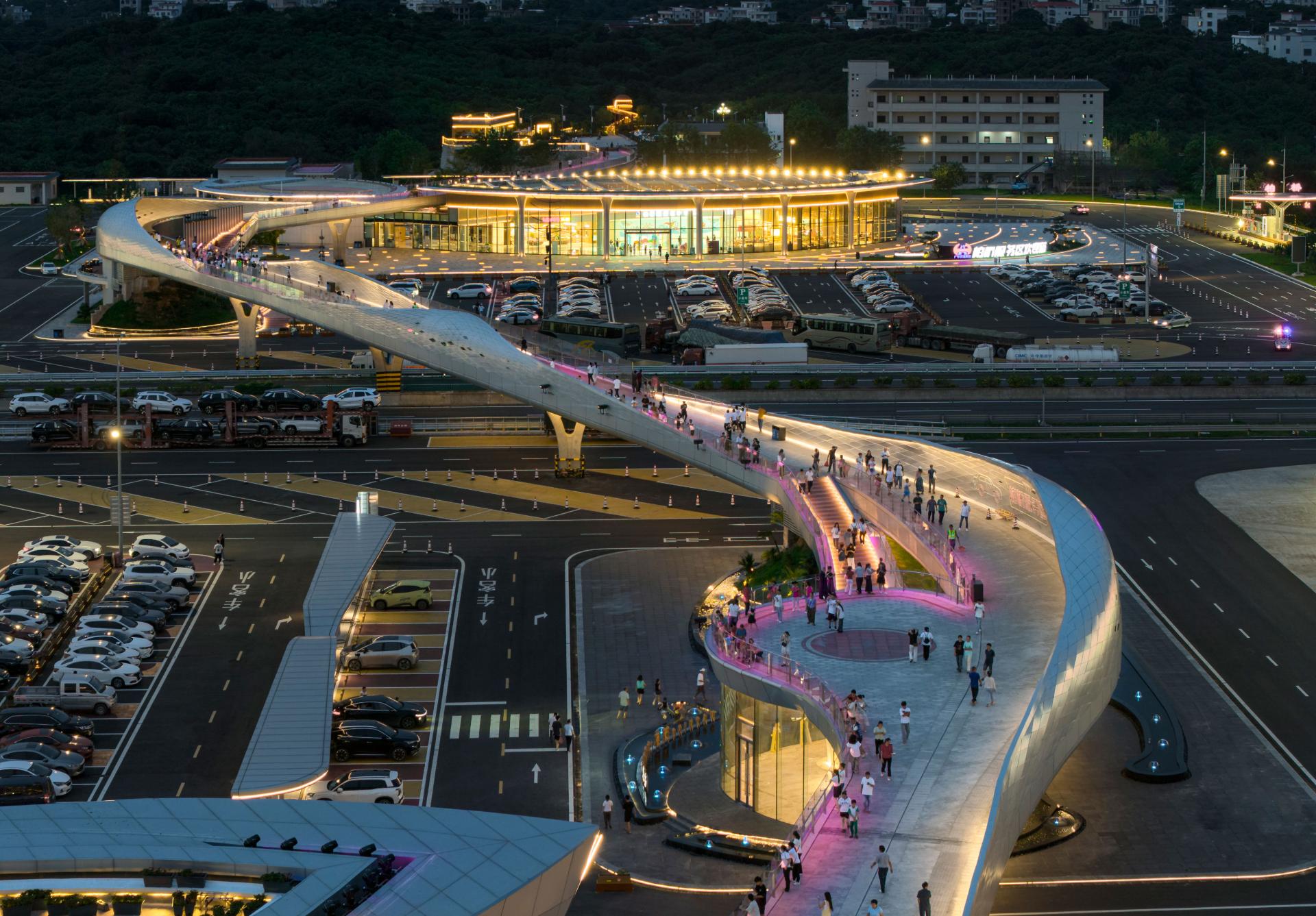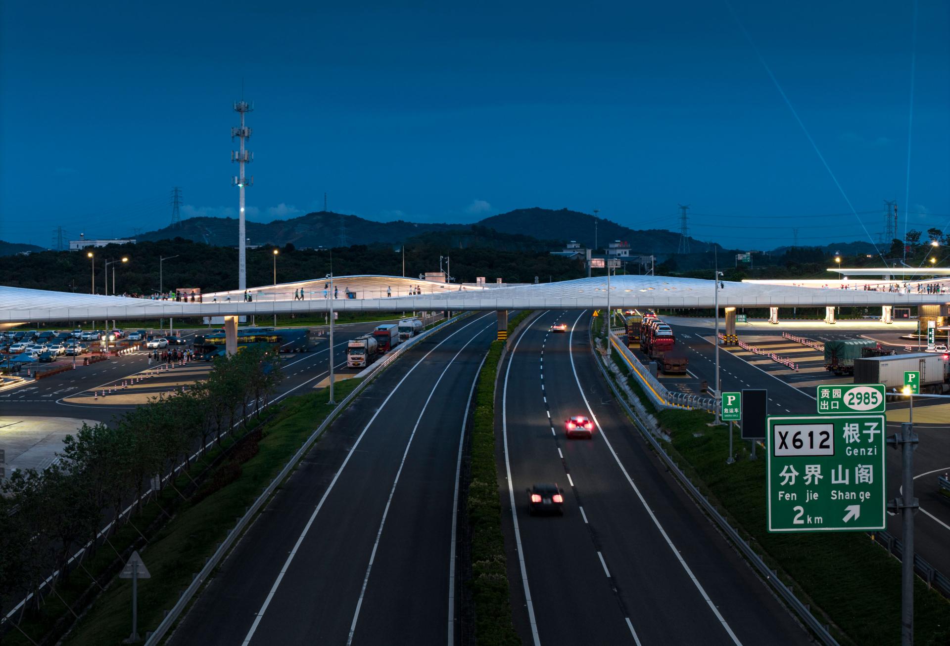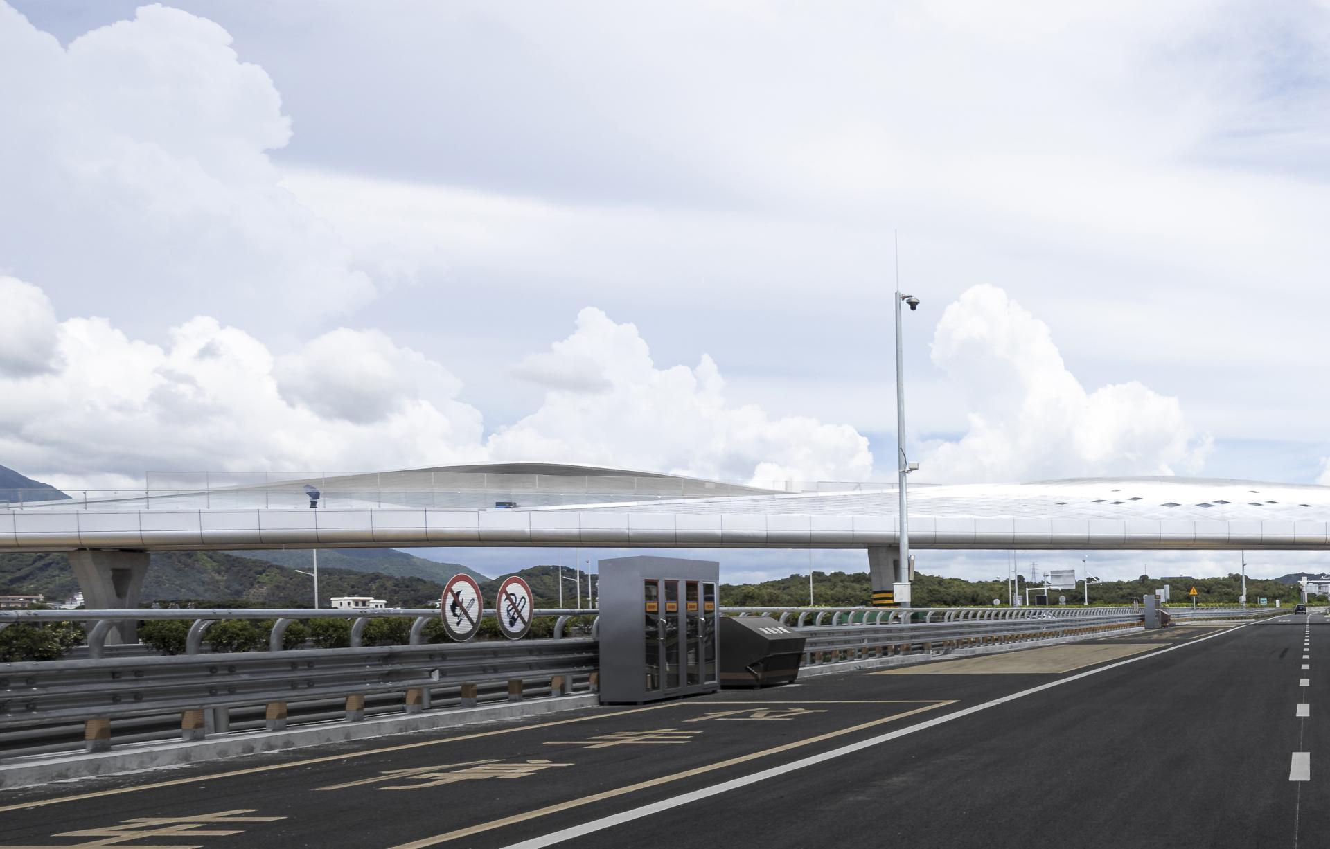 The Baiqiao Expressway Service Area of the Baotou–Maoming Expressway is a distinctive service area in the coastal mountainous region of southern China, and the surrounding villages are famous for producing lychees, but the level of economic development is low and there are no good public facilities. By adding a 600-meter-long aerial bridge, the service area not only connects the service areas on both sides of the expressway but also further links to the villages outside the service area. It achieves improvements in three aspects: first, optimizing the functional configuration of the service areas on both sides, without the need to provide two sets of identical facilities, realizing complementarity and forming distinctive functions respectively; second, residents of surrounding villages can enter the service area to share cultural, commercial, and technical facilities, enhancing public resources in the vicinity; third, travelers on the expressway can reach the towns and villages on both sides to visit and consume, promoting local economic development.