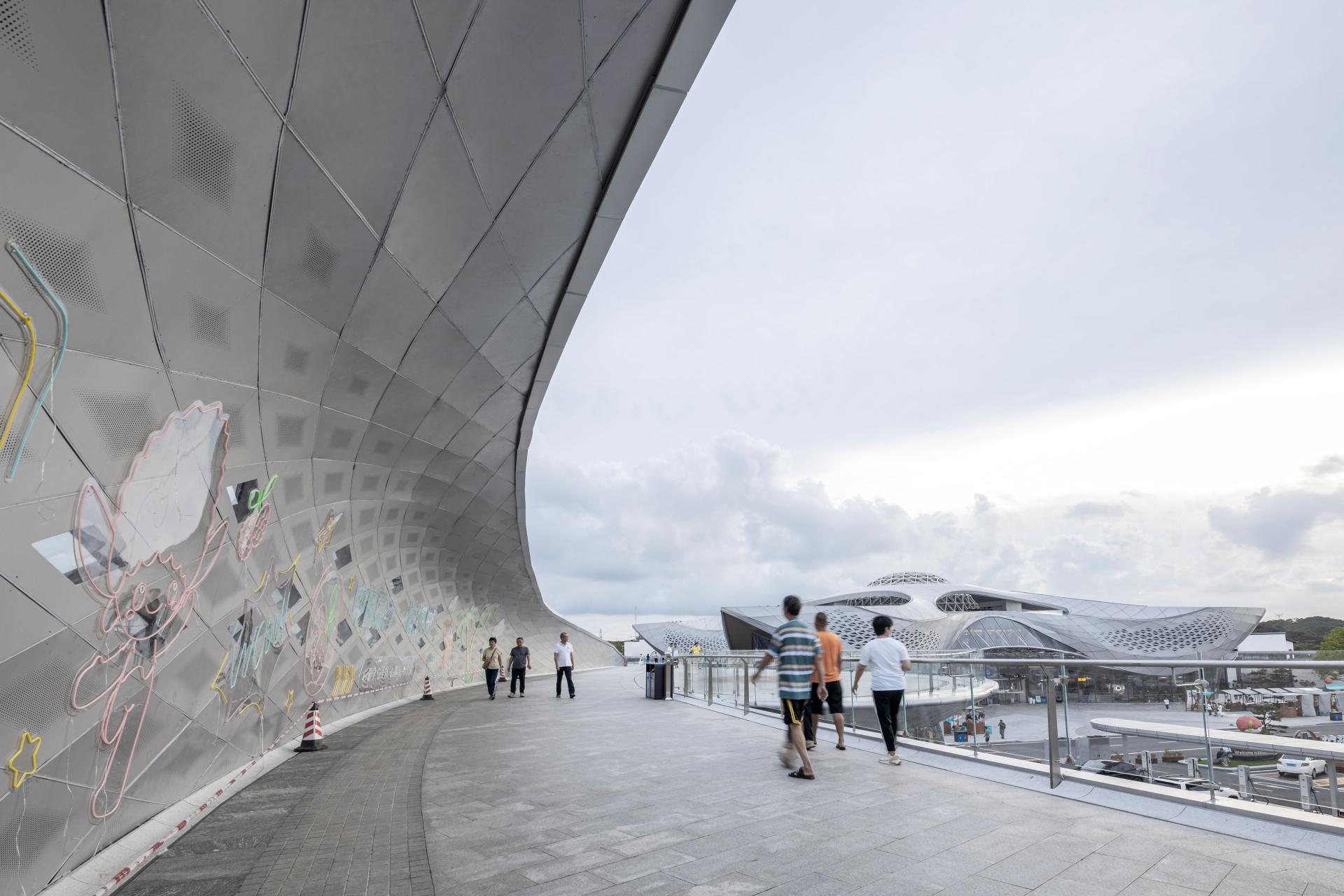 The pedestrian bridge in this project takes the branches of the lychee tree as the design concept, with branches long and graceful, small twigs bearing abundant fruits, and fruits clustering in groups on the larger branches. The bridge has a total length of 600 meters and an average width of 6 meters, with the elevation adopting an expansive wavy surface, echoing the undulating mountains around it, and forming a distinctive landscape image on the expressway. The bridge connects the main buildings of the service areas on both sides, and in order to avoid monotony, multiple enlarged nodes are arranged in the middle—the north side features a rural revitalization stage, which can provide surrounding performances and a drive-in cinema; the south side features a city exhibition hall, used to display the abundant fruits and rural specialties of the region, improving visibility and promoting economic consumption.