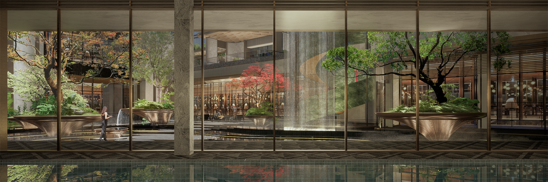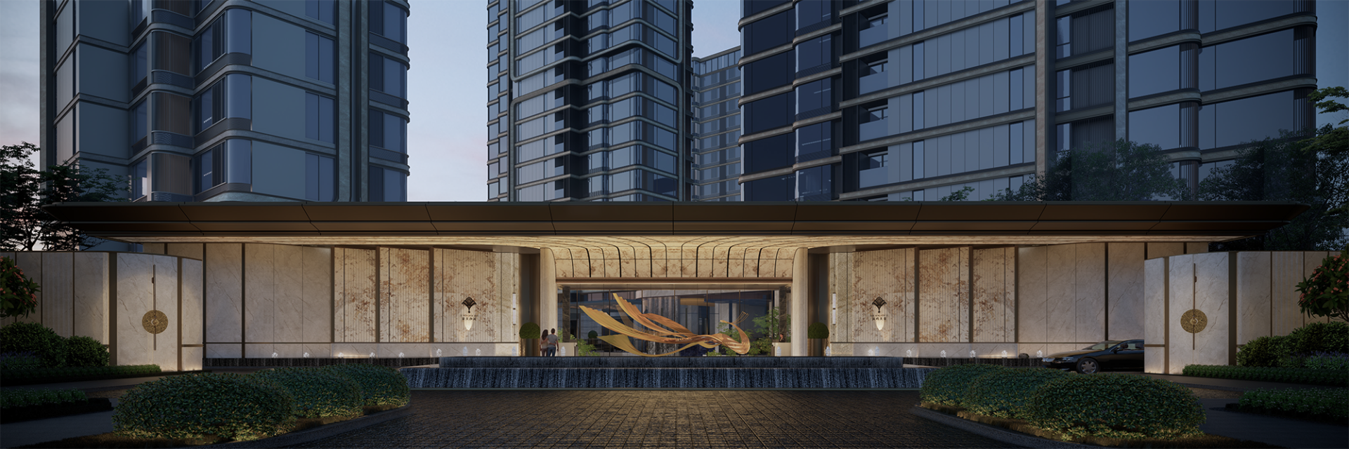 Fucuo · Fengming Tianxi Residence in Fuzhou adopts the phoenix as its defining cultural symbol. Inspired by the legend of Dan Mountain, the design reinterprets the phoenix’s form, colors, and narrative into a luxurious spatial language. Rooted in modern Oriental aesthetics, the palette blends rich gilded gold, glazed red, and jade tones to evoke nobility and vitality. Materials such as veined glazed glass, color-shifting lighting, natural marble, and wooden grilles are meticulously crafted to emulate the layered textures and interplay of light and shadow characteristic of phoenix feathers.