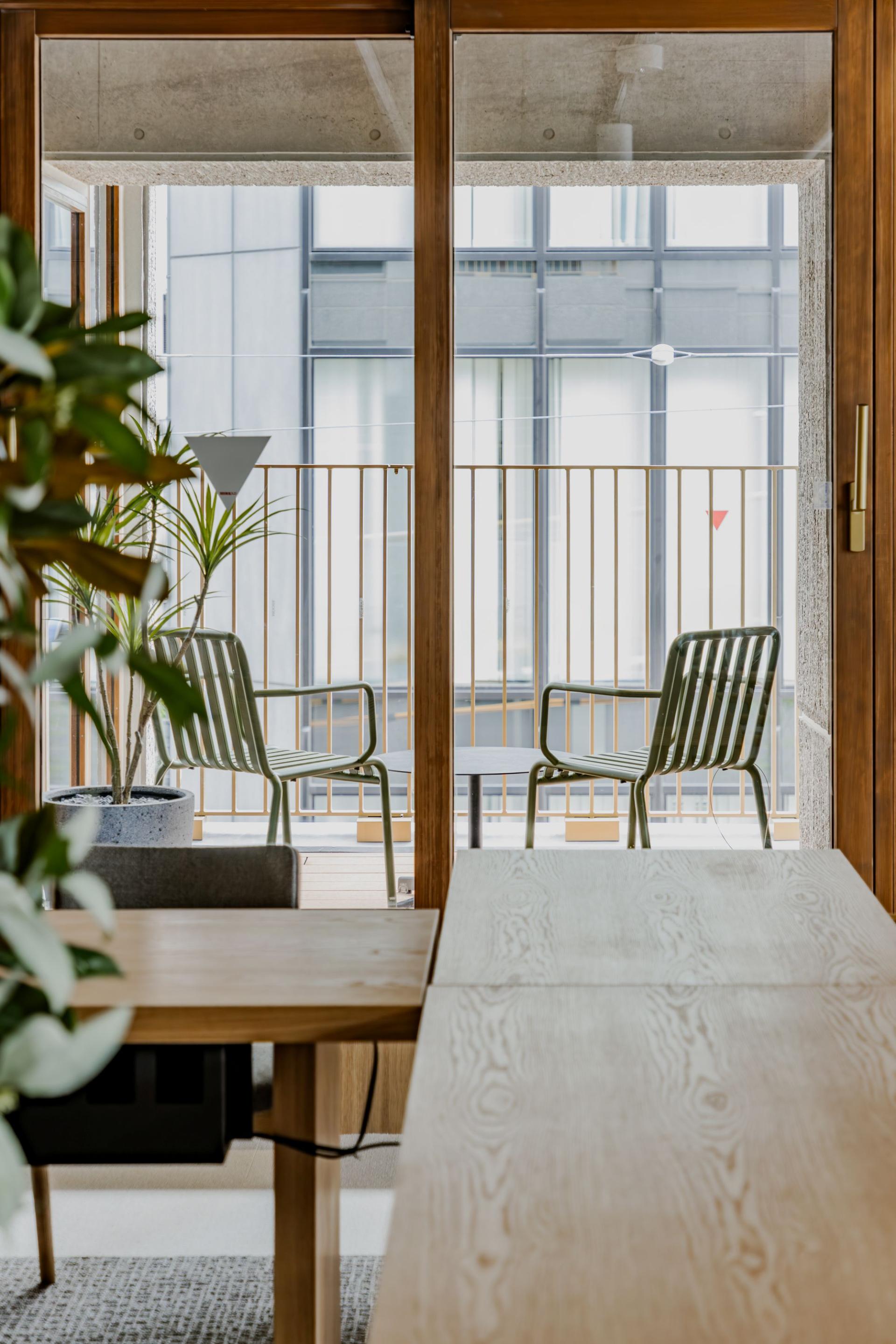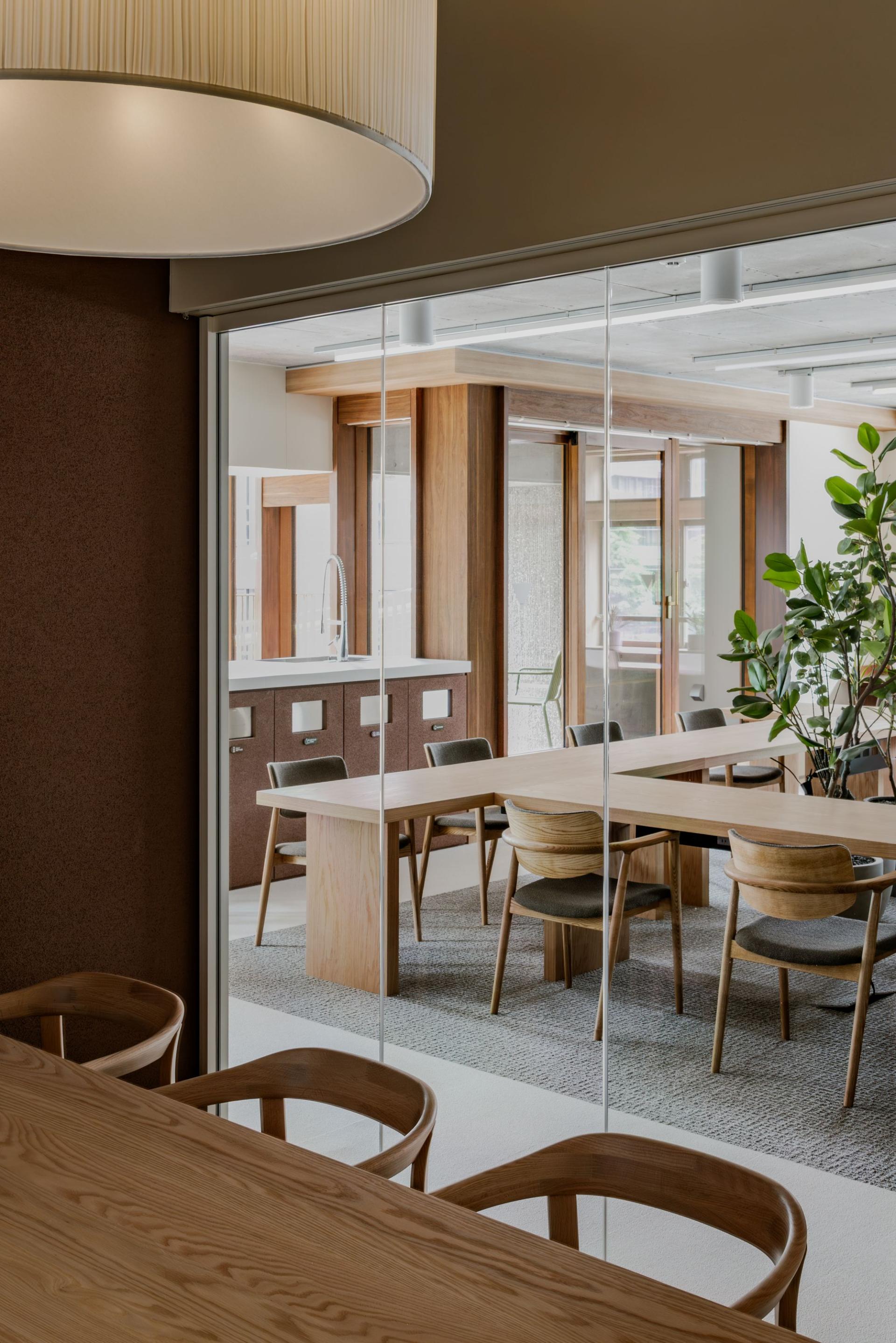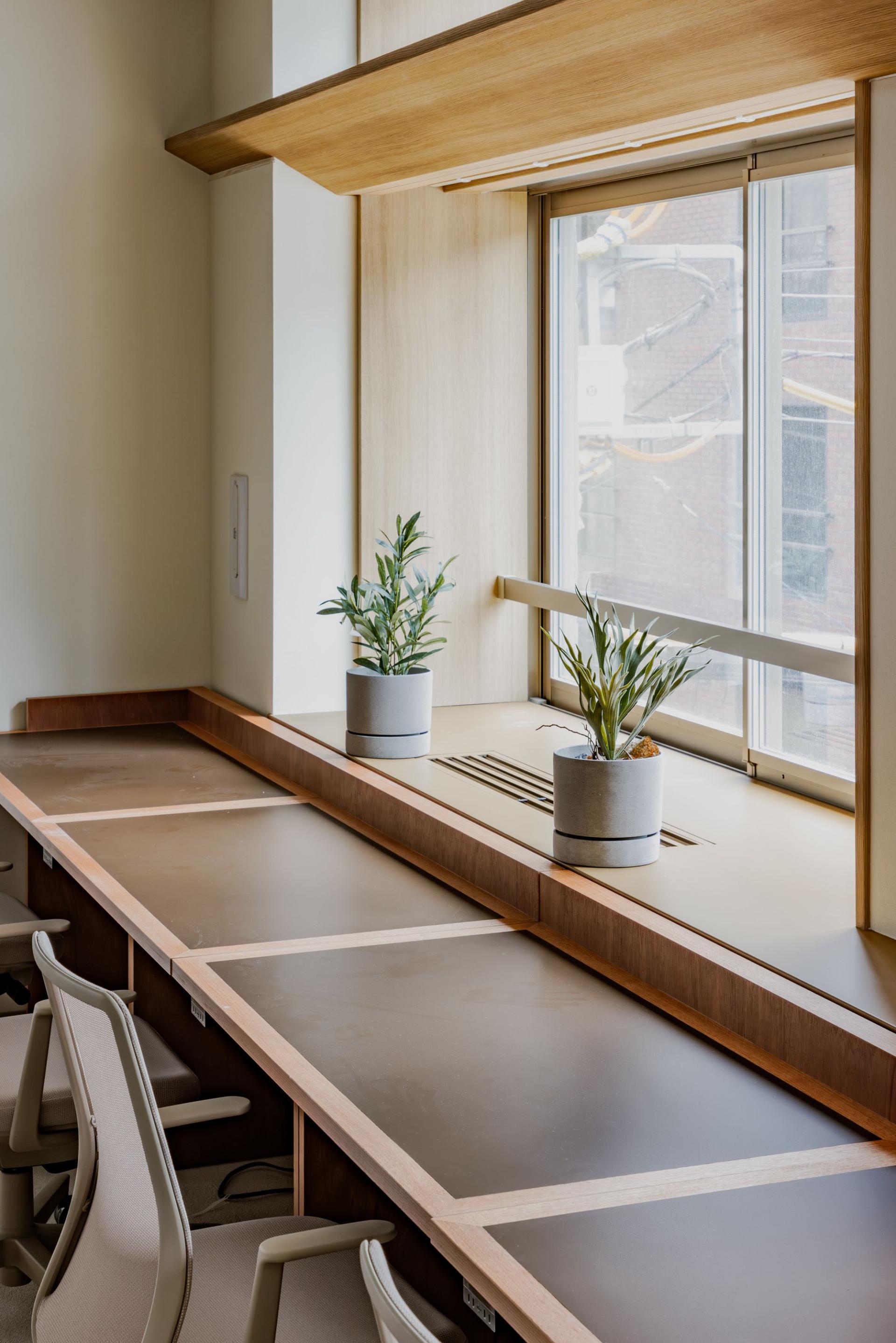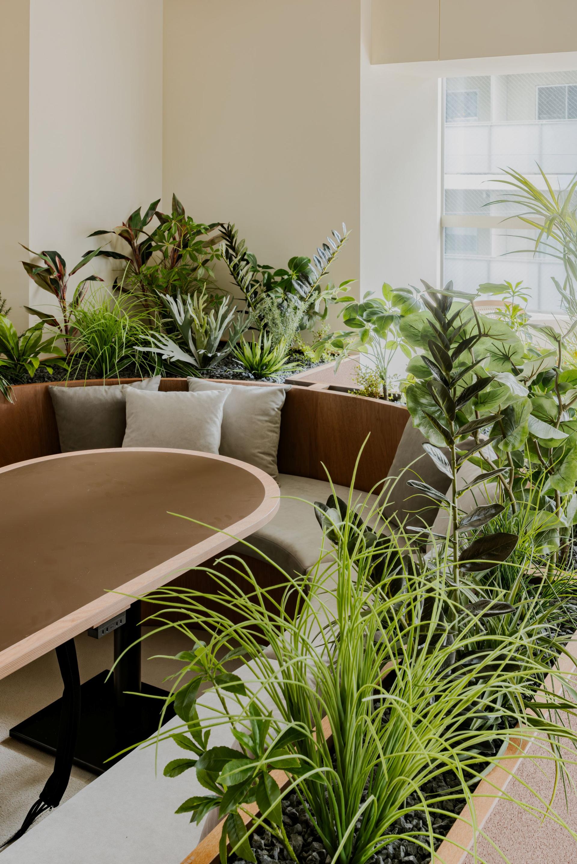 In Japan's narrow, elongated residential spaces, the courtyard served as a “floating natural painting in the city” – a tranquil space ensuring ventilation and light within confined structures. On the 3rd-floor office level, every desk position is designed to offer a view filled with greenery. This carries forward the courtyard's spatial element of allowing greenery to be felt even within compact spaces.