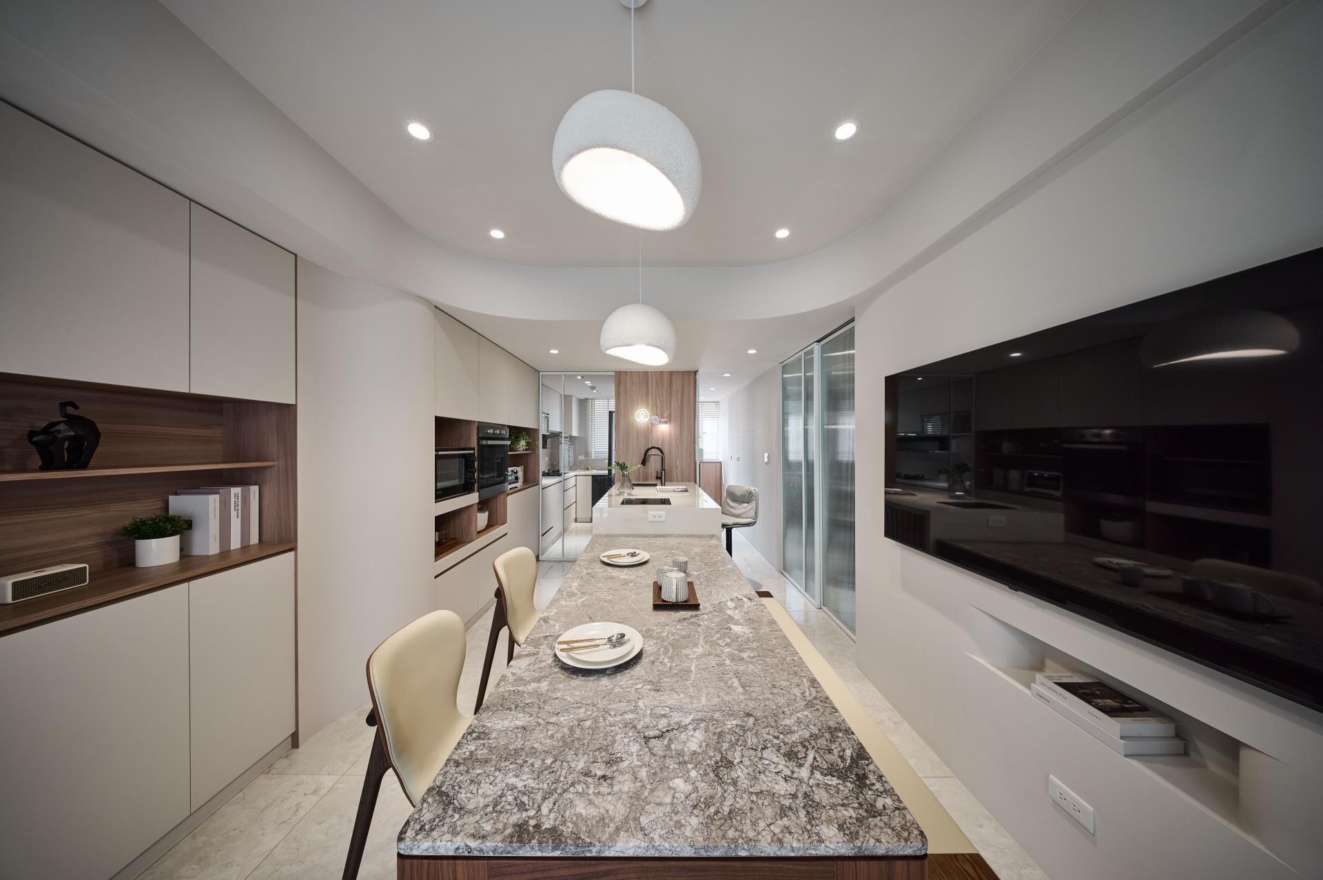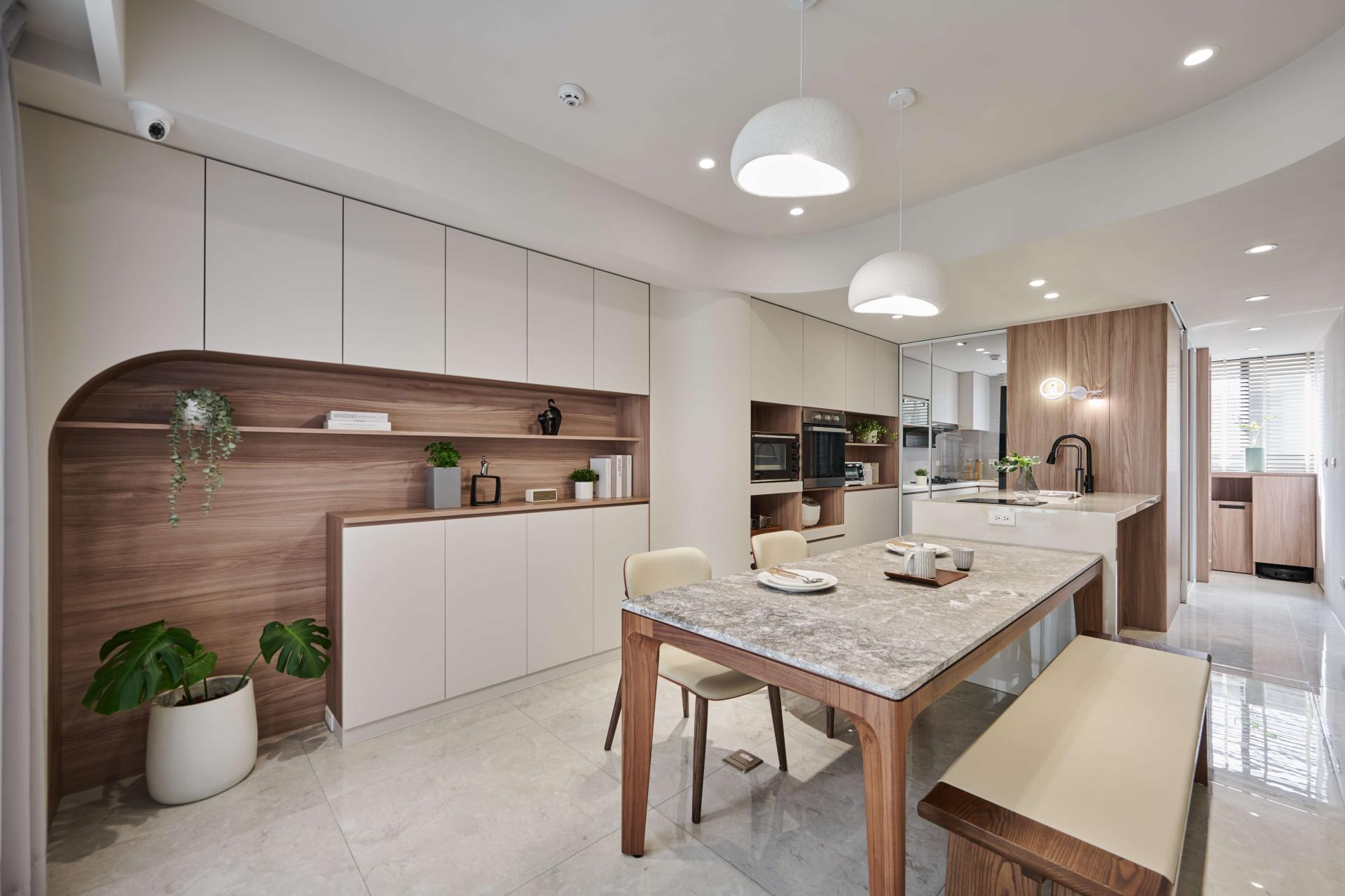 The living area blends openness with intimacy, balancing relaxation and gathering. Subtle lighting enhances the stone wall, while concealed fixtures adjust to changing times of day. In the dining and kitchen zones, stone counters and wooden cabinetry combine resilience with warmth, reflecting the same dialogue of opposites found throughout. Bedrooms continue the theme with tactile finishes and calm palettes, crafting a sanctuary for rest, privacy, and reflection.