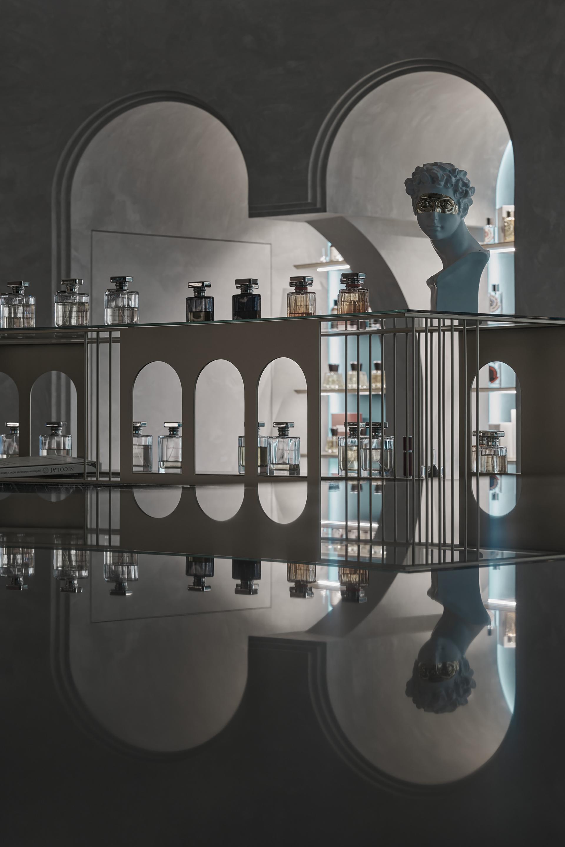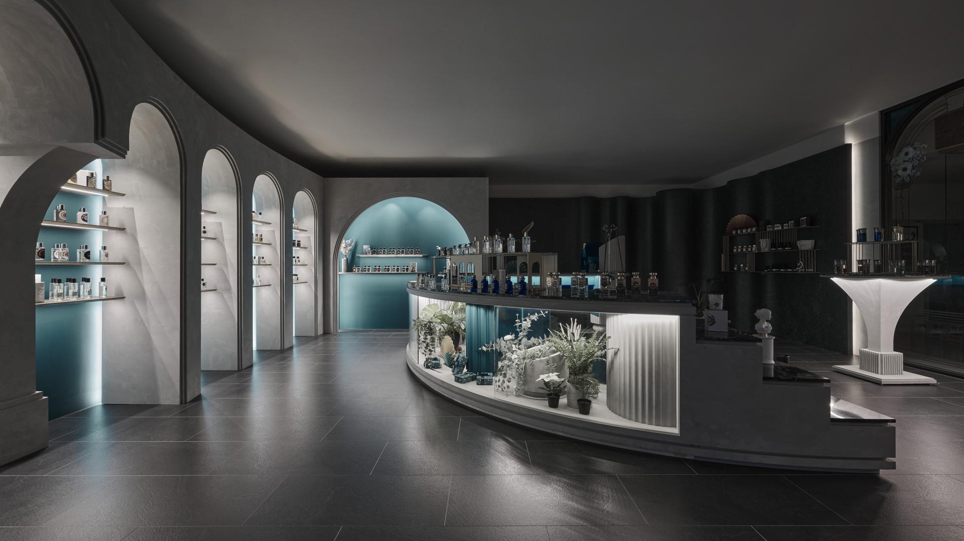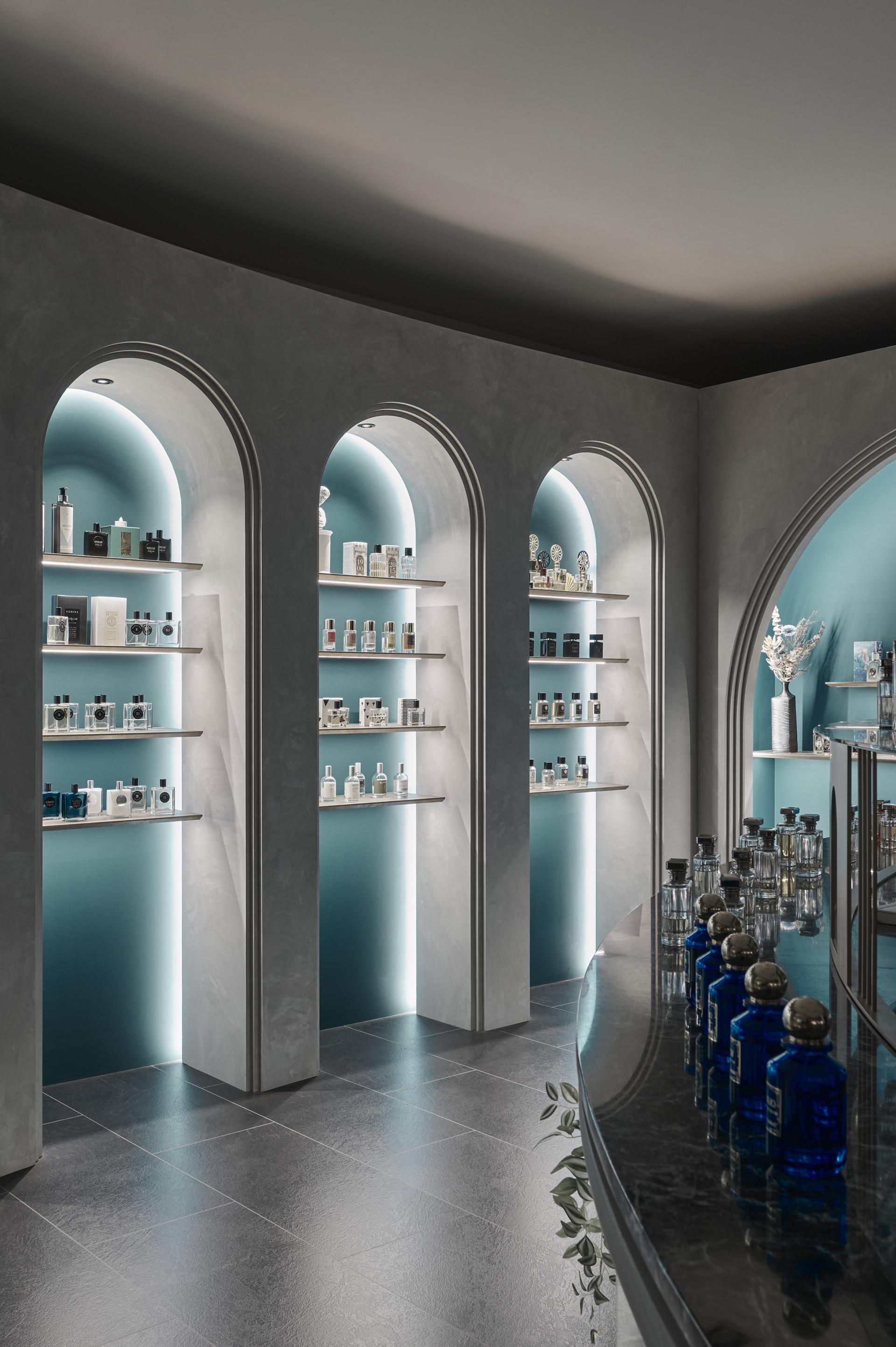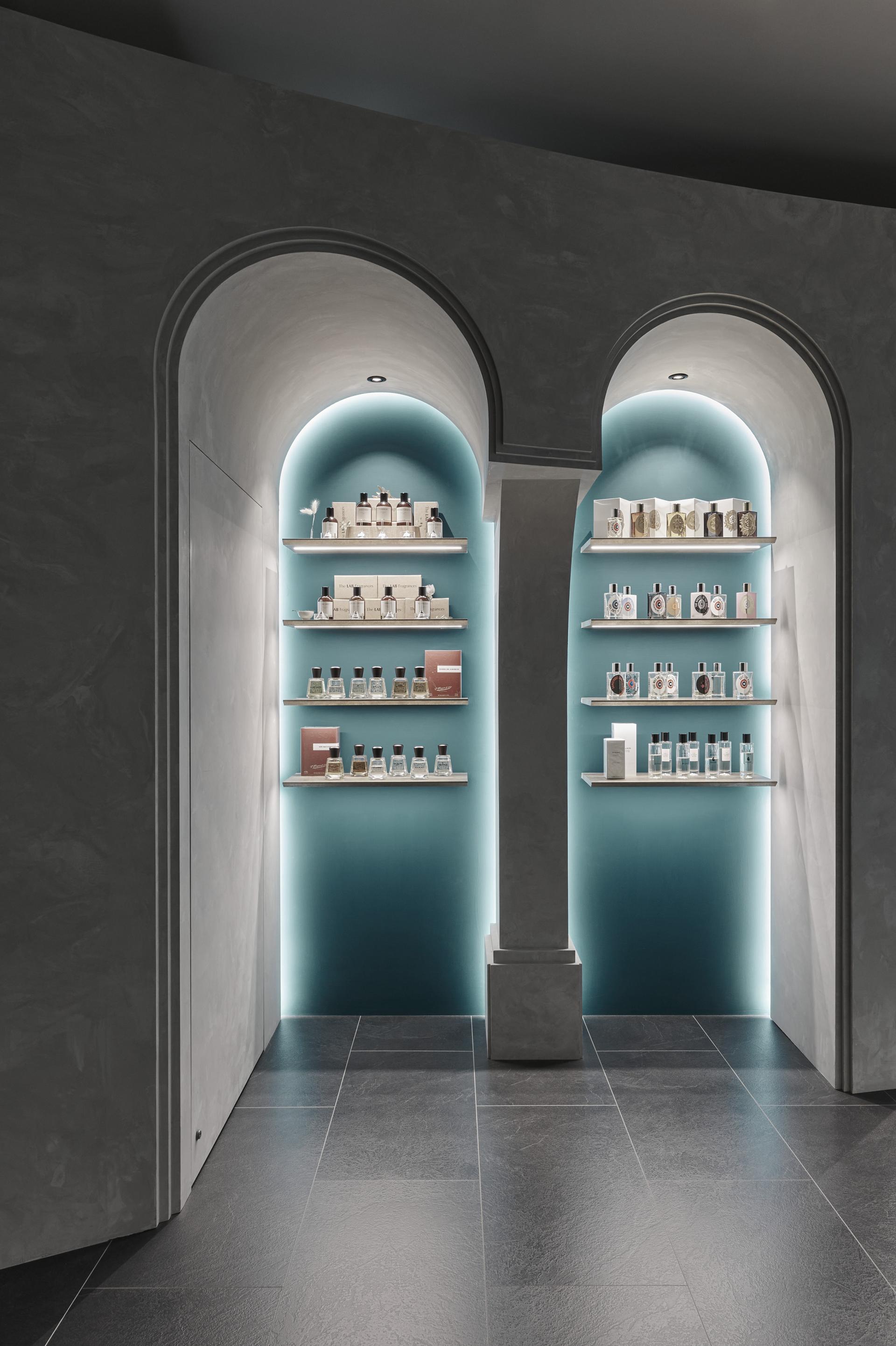 Stepping into the space of soft gray interwoven with teal, one embarks on a journey akin to strolling through a refined museum. Roman columns stand in quiet dignity, sculpting a sense of architectural gravitas. Theatrical lighting descends in gentle layers, composing a spatial rhythm that gradually unfolds. Each bottle of perfume and fragrance becomes a vivid protagonist, and together, scent and aesthetics intertwine to shape an elegant sanctuary where taste resonates with the senses.