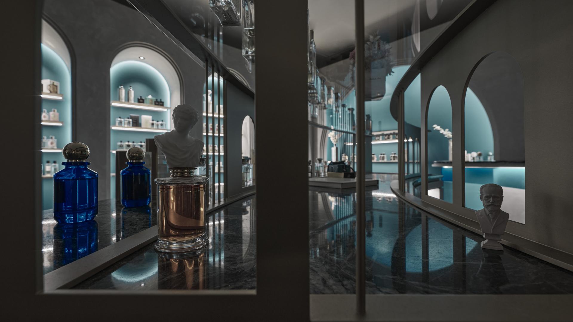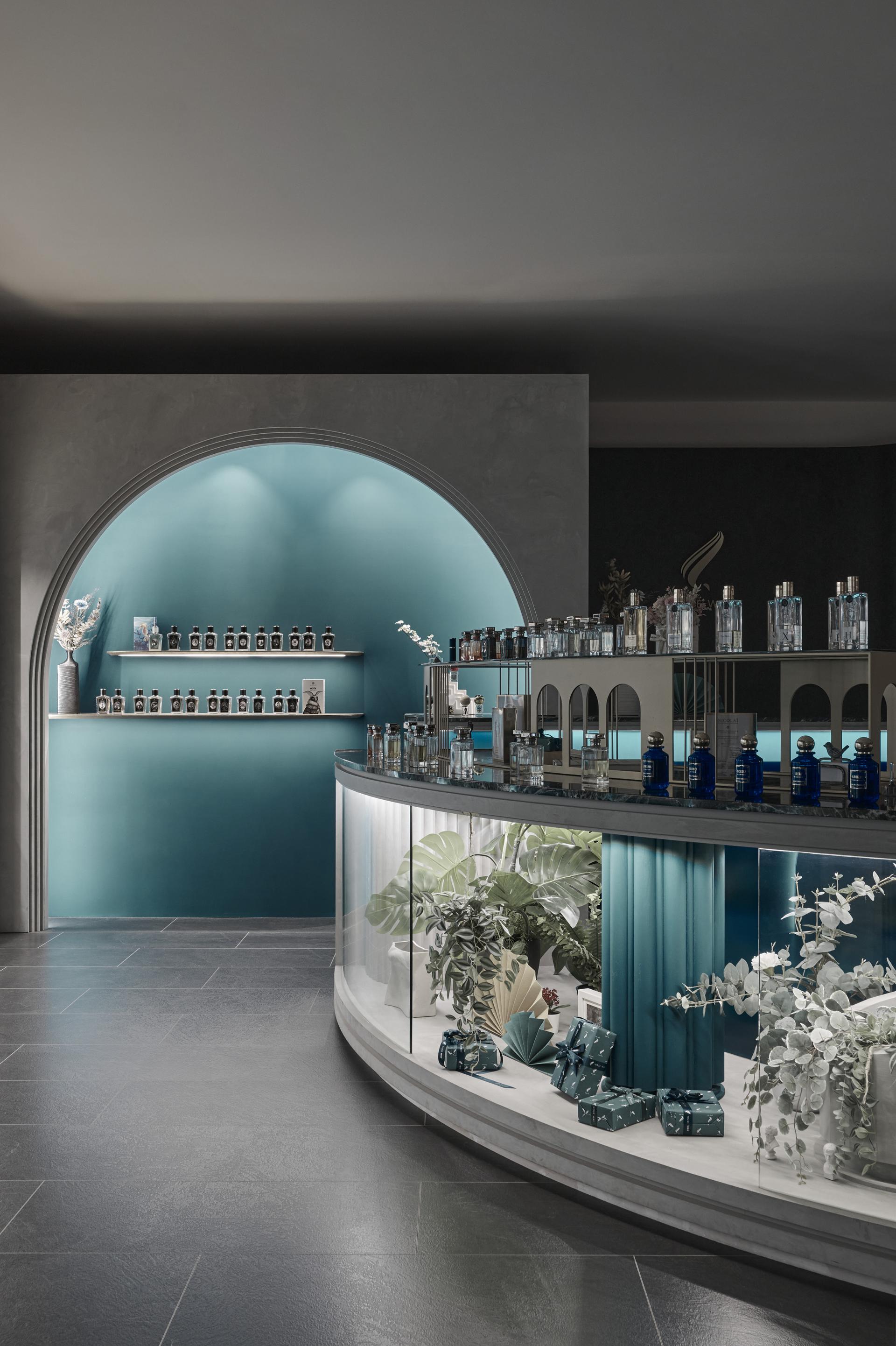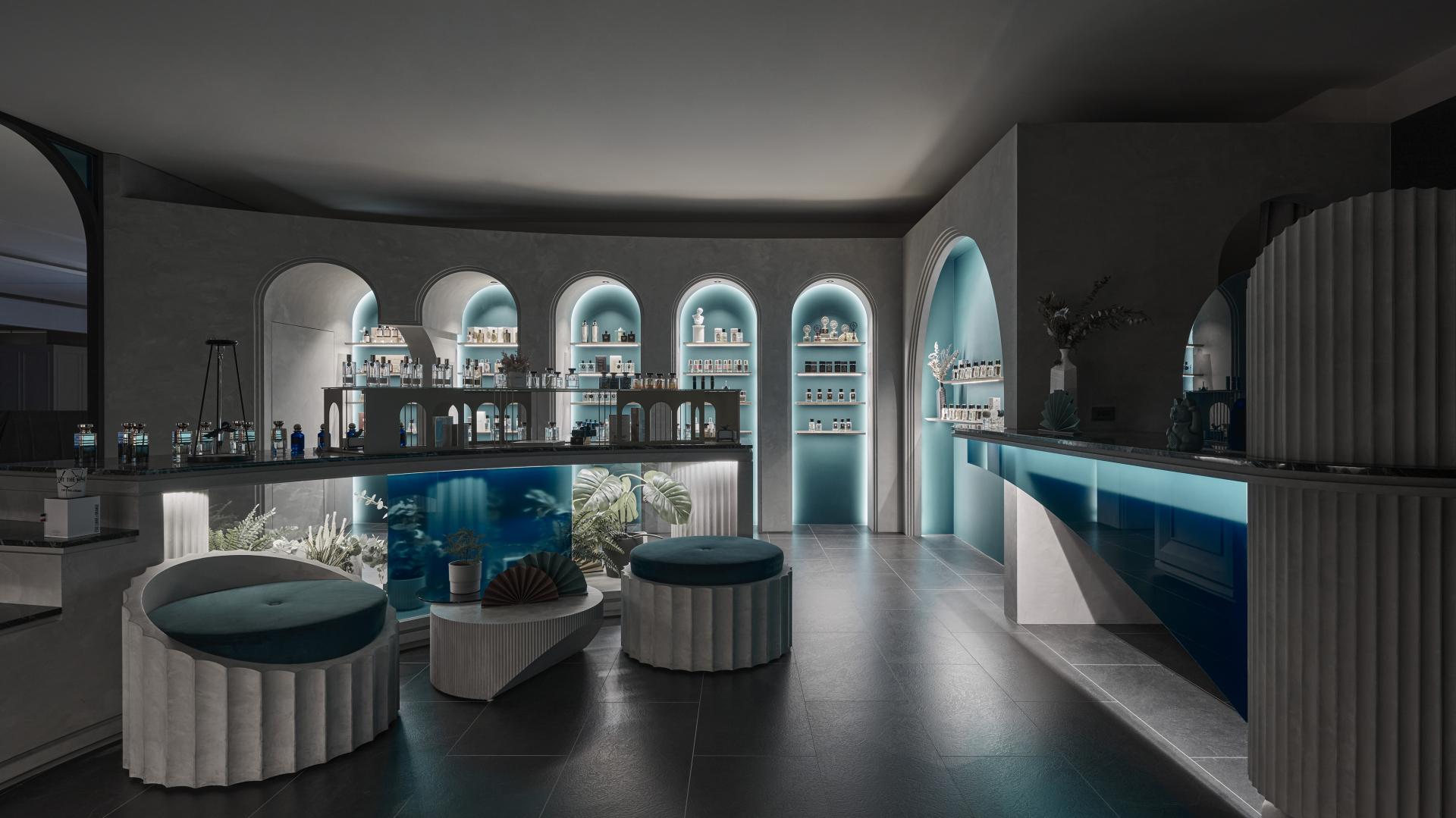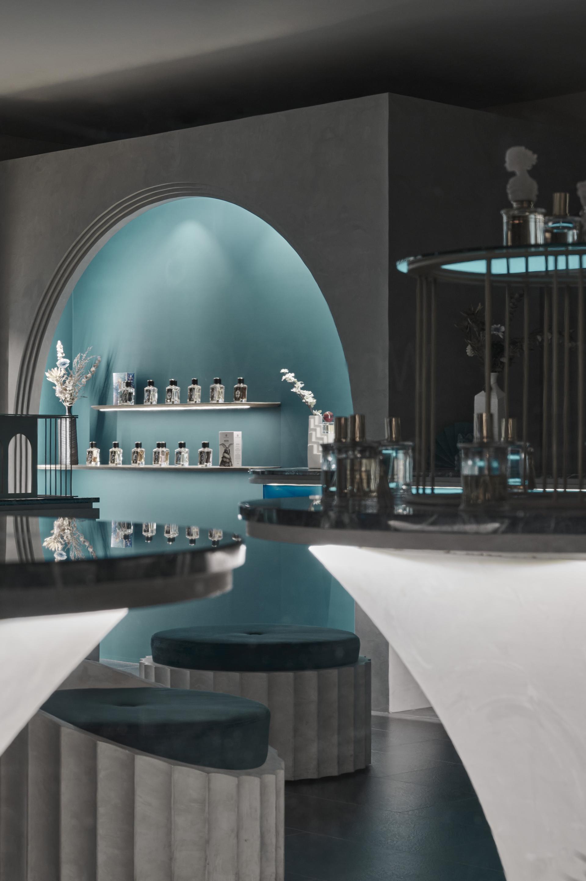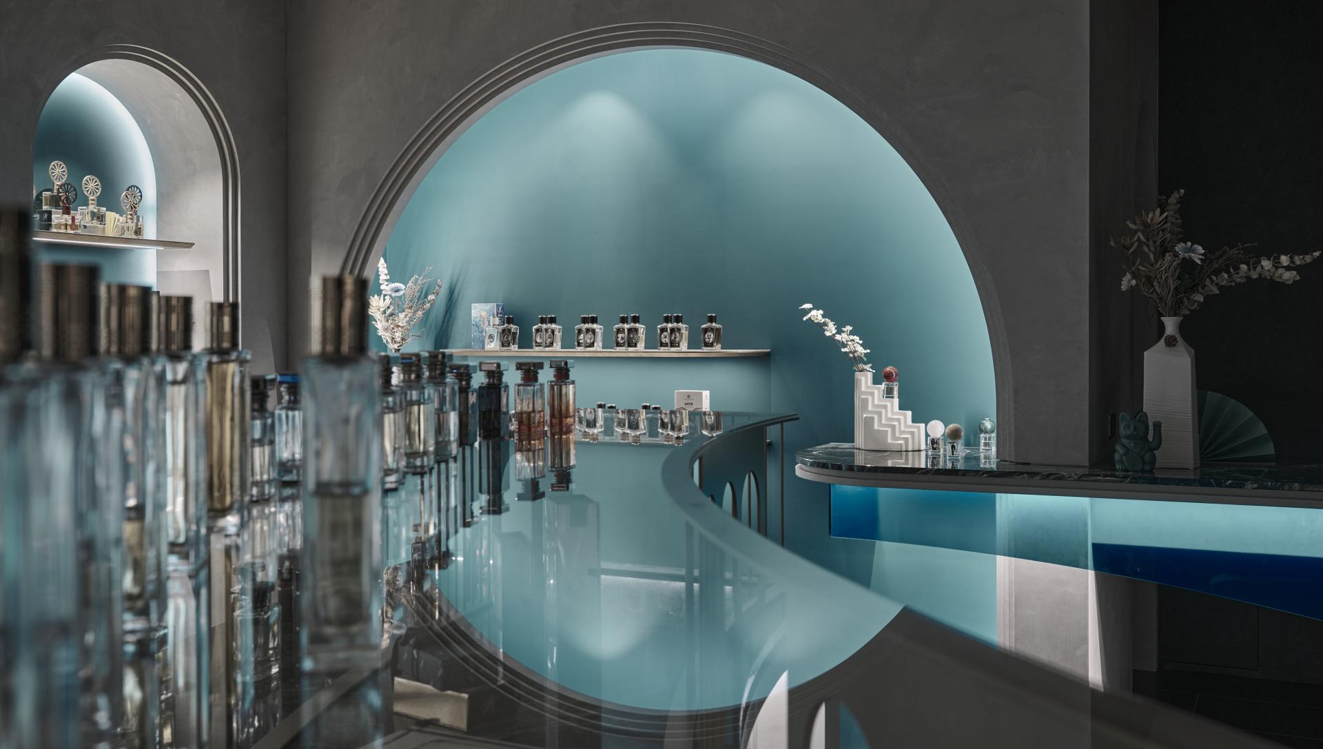 Stepping into the space of soft gray interwoven with teal, one embarks on a journey akin to strolling through a refined museum. Roman columns stand in quiet dignity, sculpting a sense of architectural gravitas. Theatrical lighting descends in gentle layers, composing a spatial rhythm that gradually unfolds. Each bottle of perfume and fragrance becomes a vivid protagonist, and together, scent and aesthetics intertwine to shape an elegant sanctuary where taste resonates with the senses.