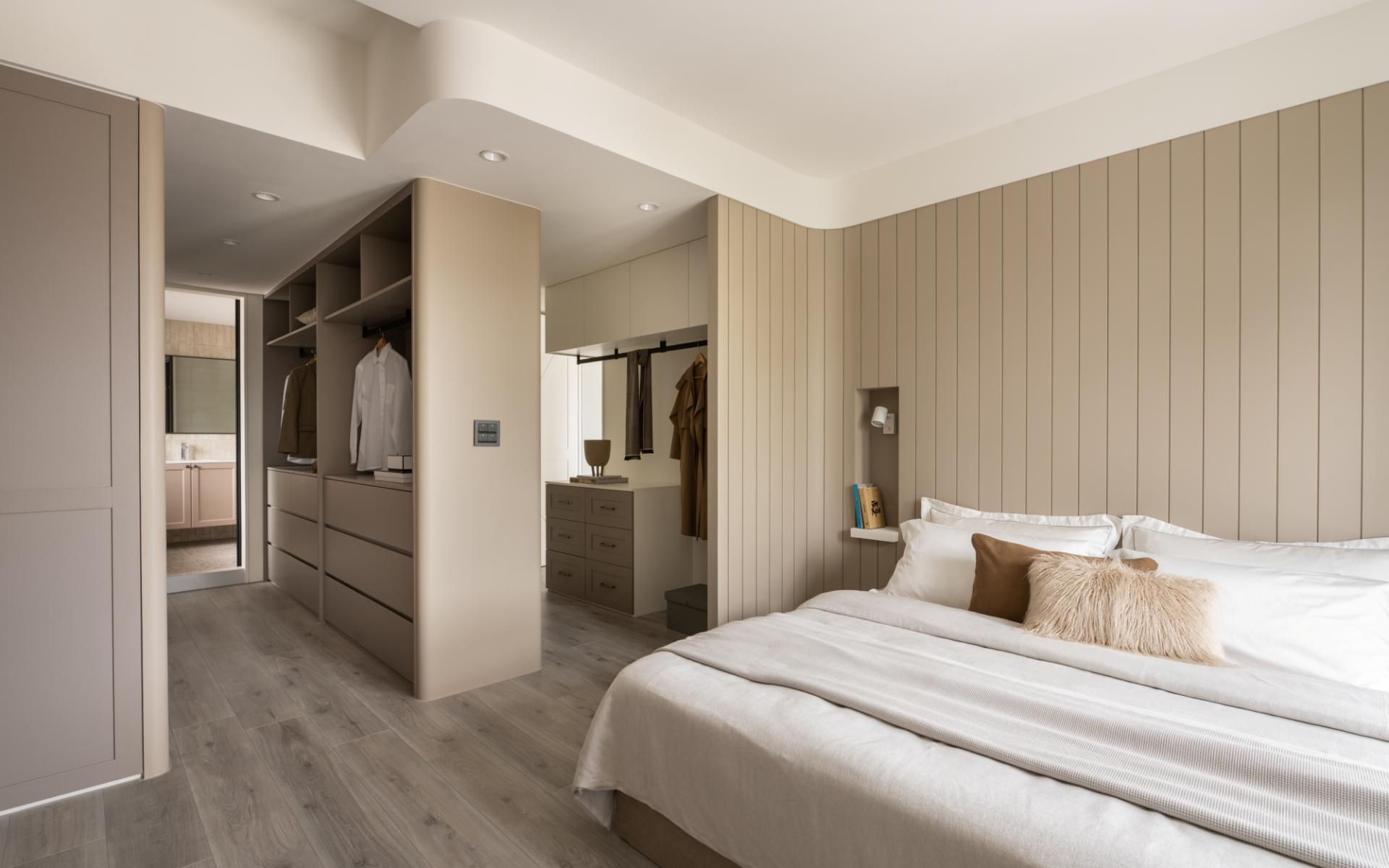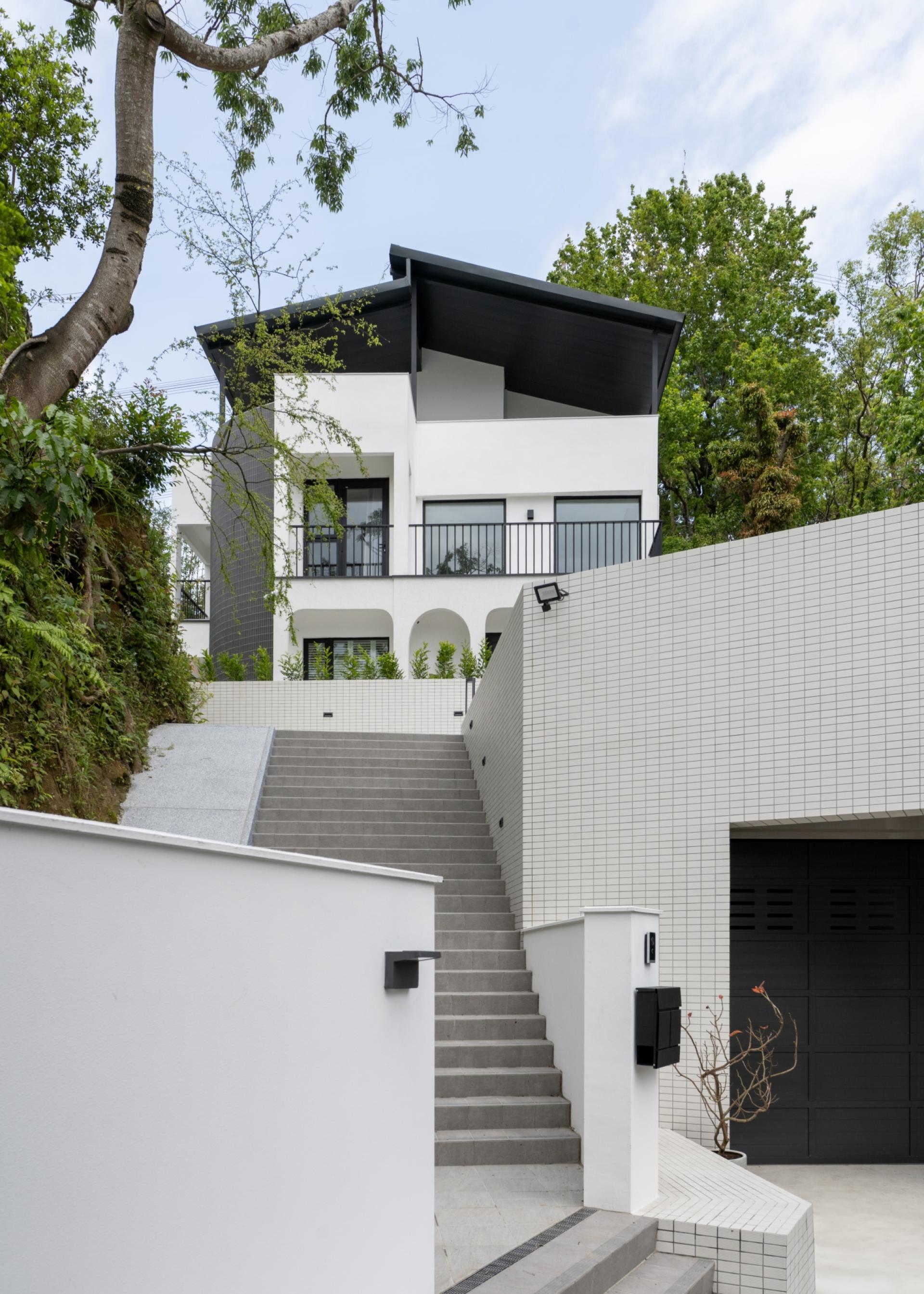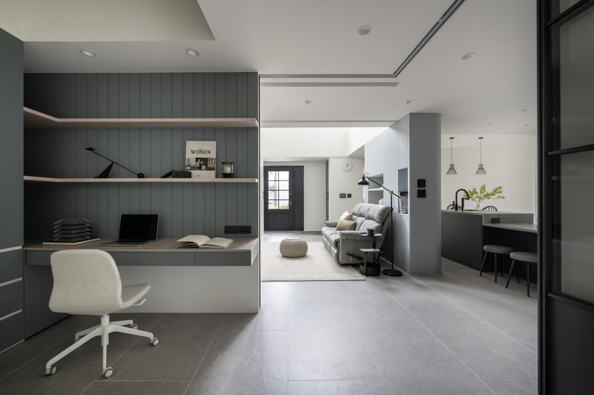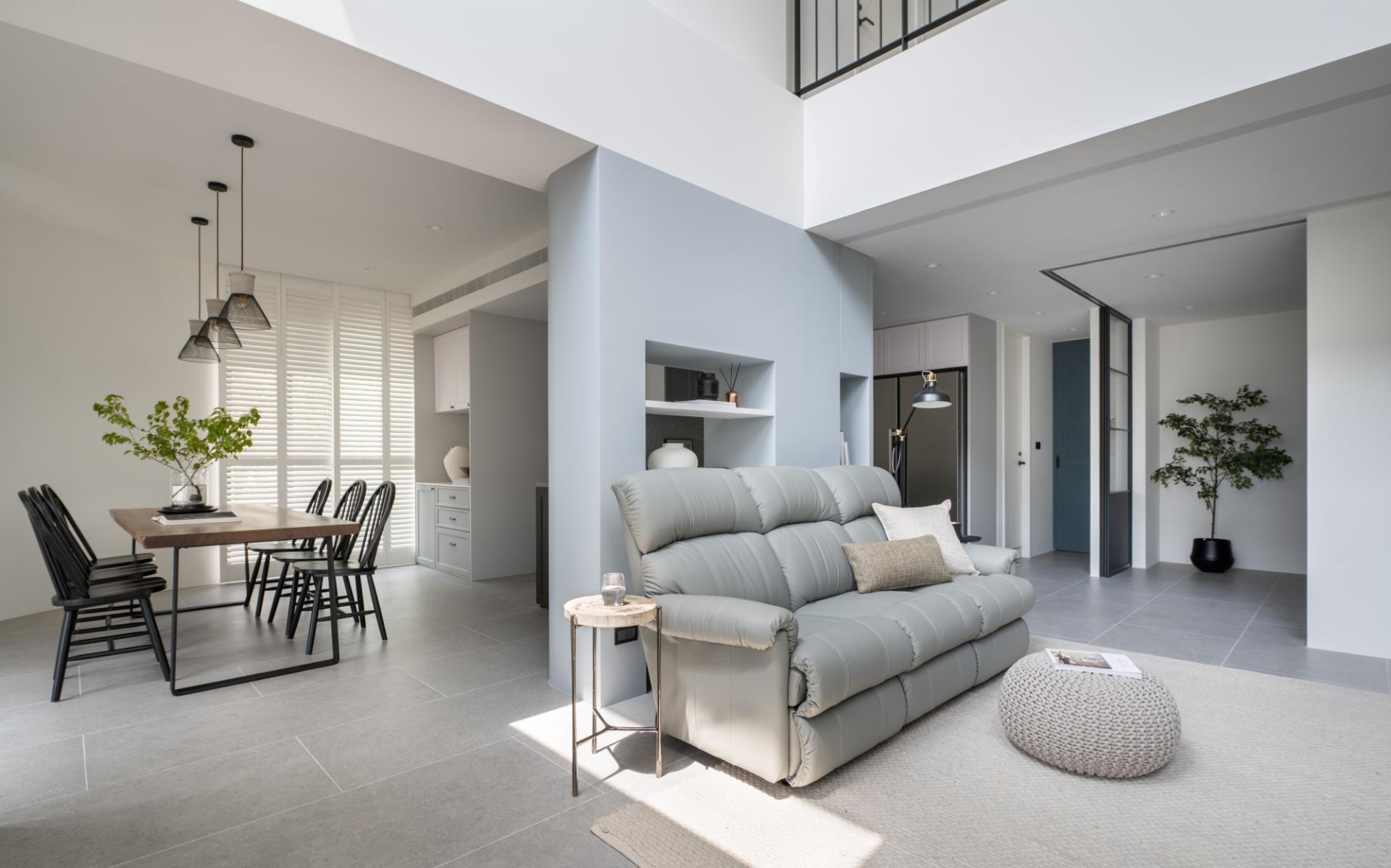 The first-floor public area is centered around the wall behind the sofa, seamlessly linking the living room, dining area, kitchen island, and study room to create a smooth, circular traffic flow. Set against expansive floor-to-ceiling windows, the dining table offers a joyful dining experience, blending the serenity of lush greenery with the delightful sight of children at play. The wall behind the sofa features a hollowed design, enhancing spatial openness and fostering a seamless connection between the kitchen island and surrounding areas. Sliding glass doors define the study room as a flexible, independent space, yet they preserve the flow of light and sightlines, ensuring family interactions remain continuous and harmonious.