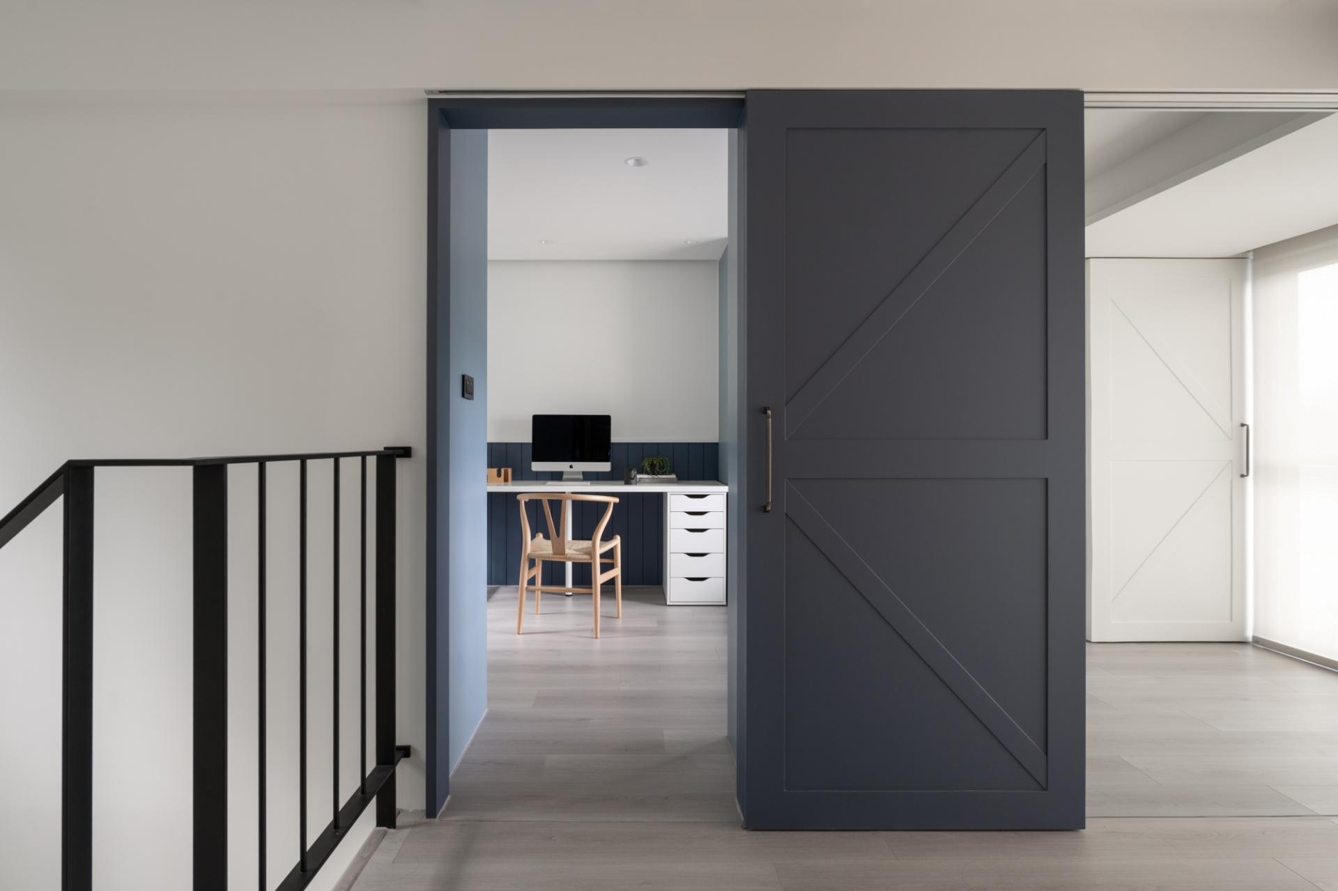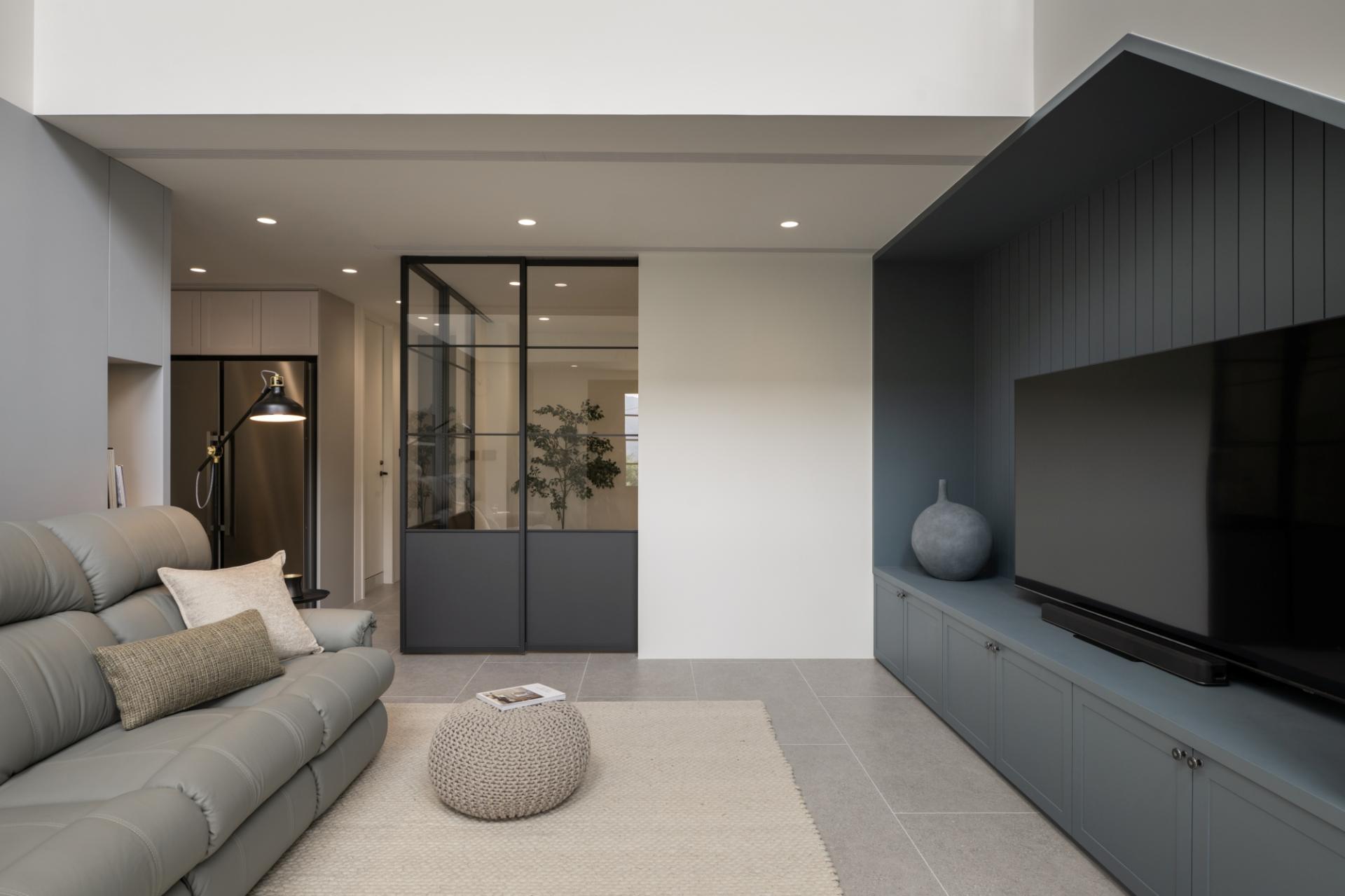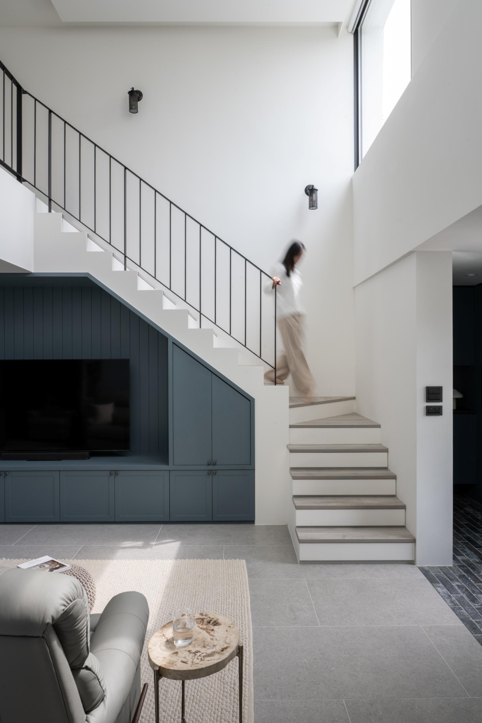 Since the first floor was poorly lit, the second-floor slab was partially removed to create a double-height ceiling. This design introduces natural light, allowing daylight to flow naturally down to the first floor. In the kitchen, a lightwell channels daylight down. Sliding glass doors stand out for their ability to define space without cutting it off. Their smooth, linear movement eliminates the need for door clearance. Natural light plays across surfaces, emphasizing the spatial flow while fostering moments of emotional connection between people.