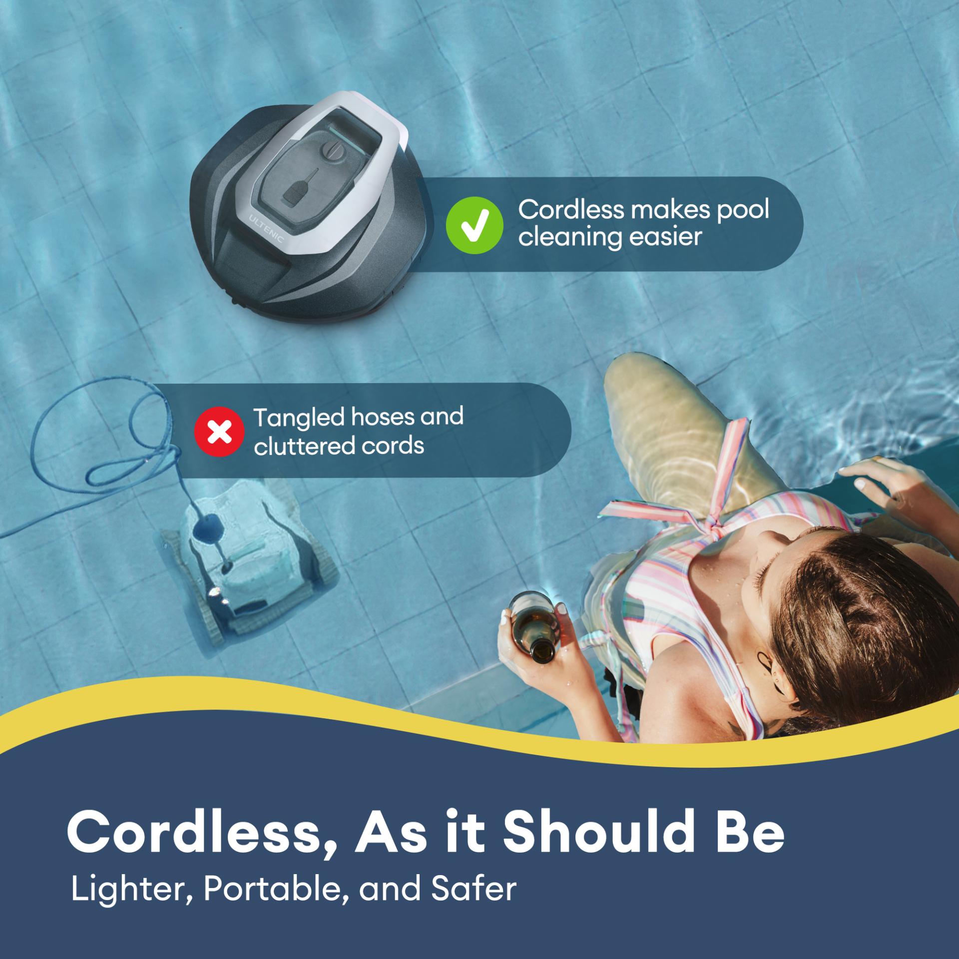 Equipped with smart automation, auto-parking, and fast-charging capabilities, the Ultenic Pooleco 10s features two large suction doors and a bottom brush that effortlessly captures leaves, dirt, and sand. Its dual-motor system and fine filter basket ensure a thorough clean and help maintain pristine water quality. The generous 2.5L debris tank reduces the frequency of emptying, while the rechargeable battery delivers up to 90 minutes of continuous cleaning. Compatible with a wide range of pool types, the Ultenic Pooleco 10s offers a cost-effective alternative to professional cleaning services, reflecting a growing trend toward more affordable and accessible pool maintenance solutions!