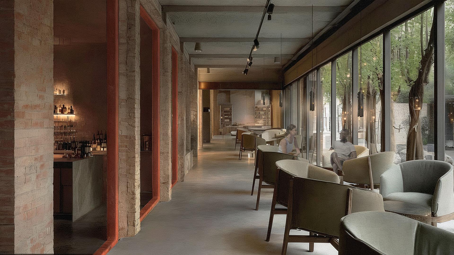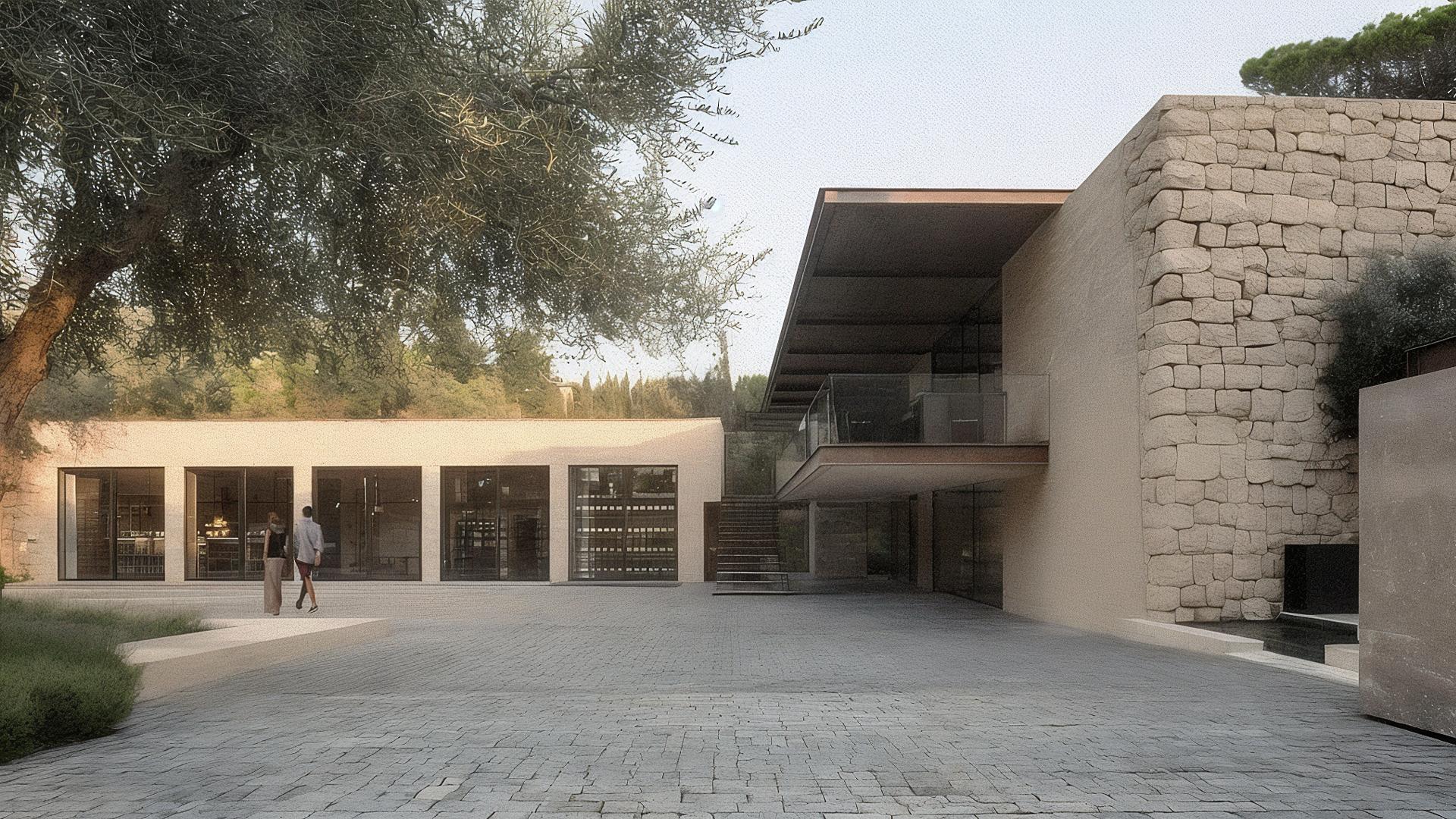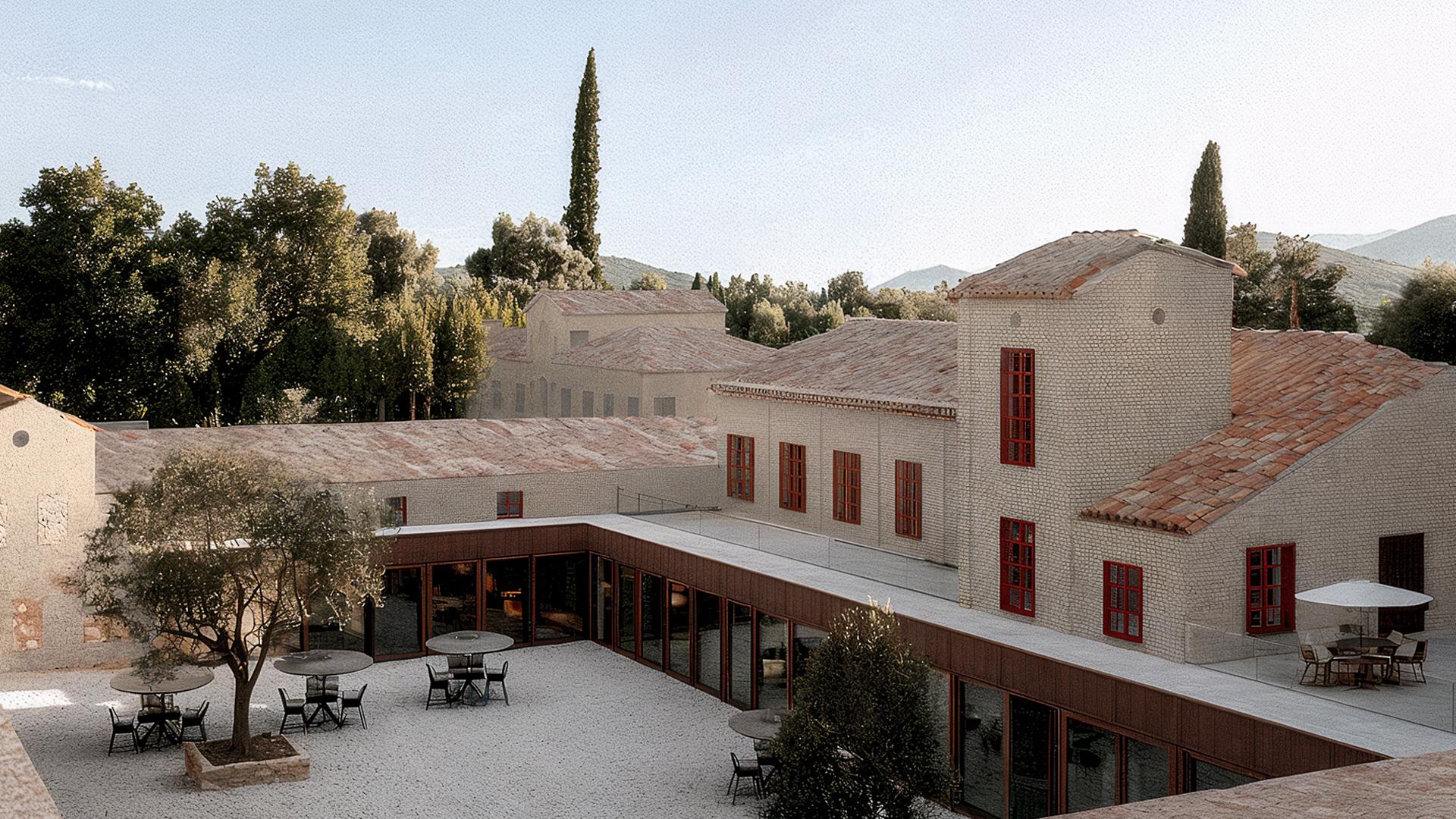At its core is a promenade - a connective thread that moves through, between, and around the existing buildings. Neither axial nor ornamental, it is choreographic: a path of rhythm and lightness composed of glazed corridors, bronze thresholds, and minimalist white stone facades. This quiet infrastructure links wine shop, tasting room, restaurant, and boutique hotel into a continuous yet varied procession.