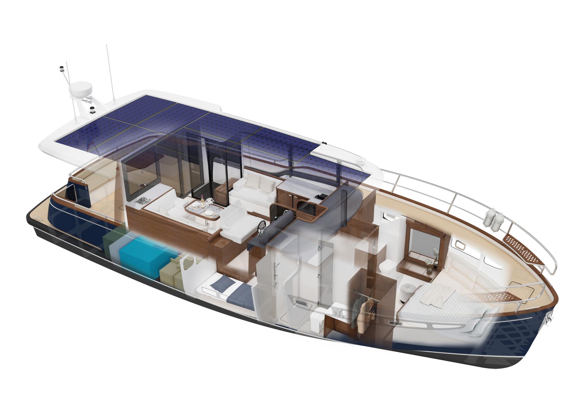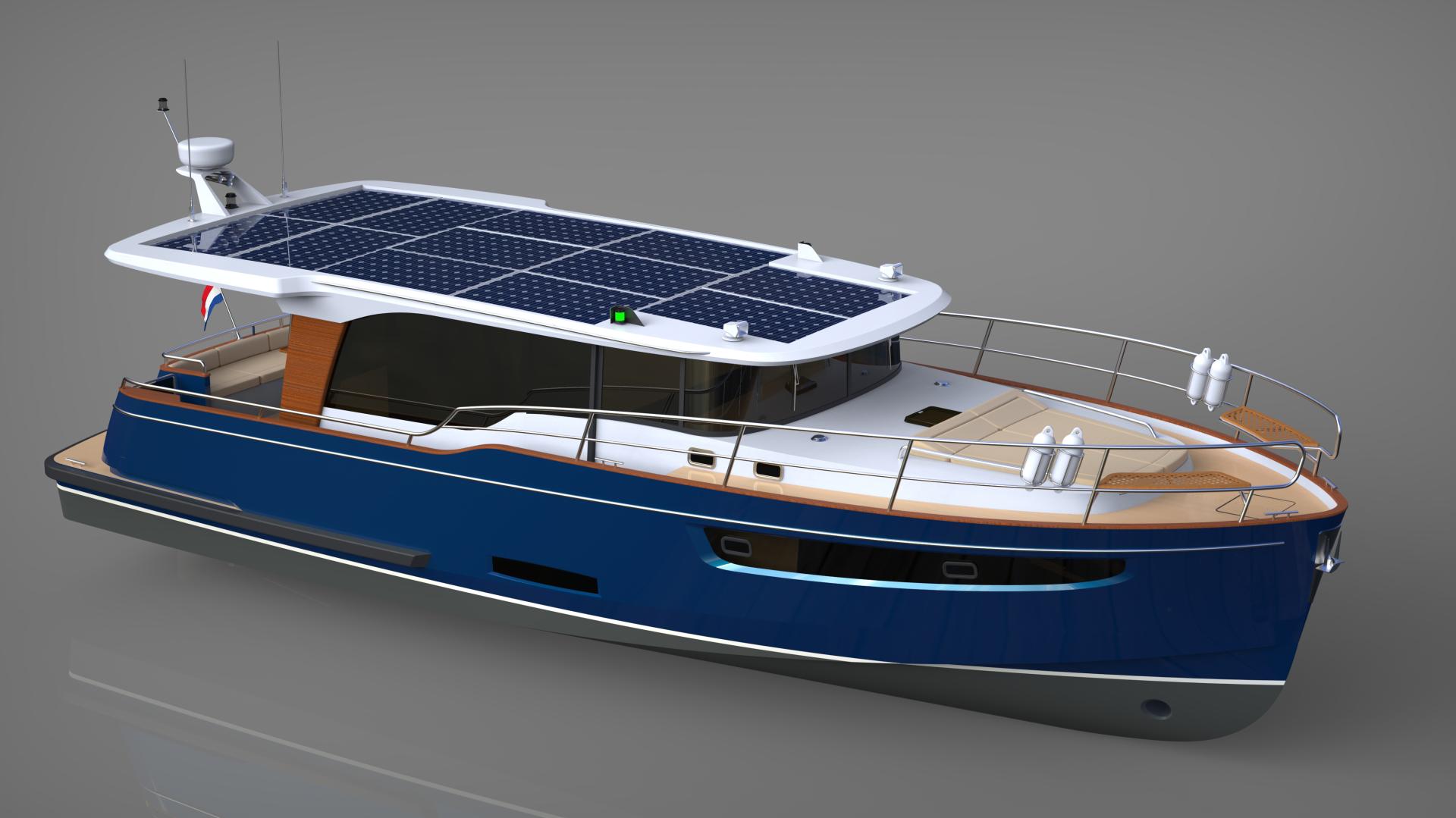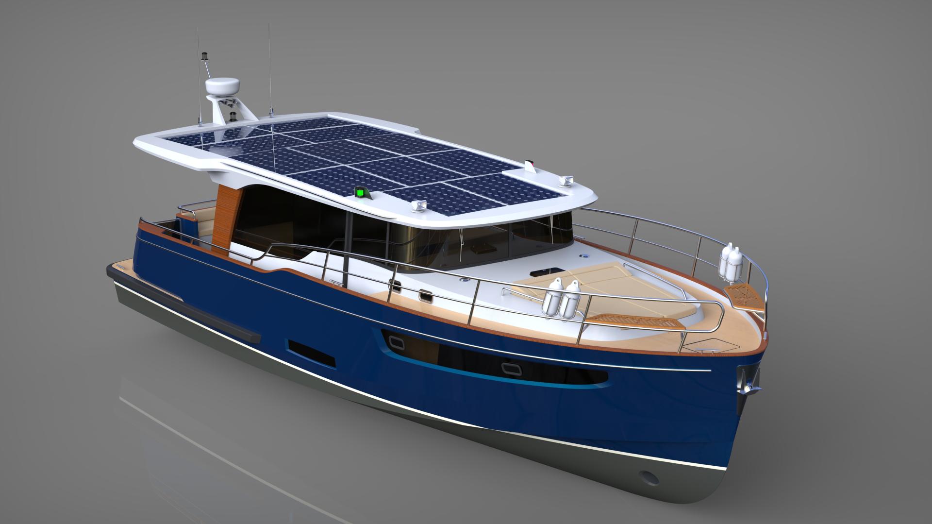 Neo-classic motor yacht, gentlemen’s' yacht designed for hybrid propulsion (electrical and diesel). The yacht features spacious saloon, galley, sauna, master bedroom, guest cabin, bathrooms, crew quatres, aft deck with seating, bow deck with sunbeds. Dimensions: length 13.98m, beam 4.70, displacement fill load 18t, engine 200hp hybrid, RCD Cat.B.