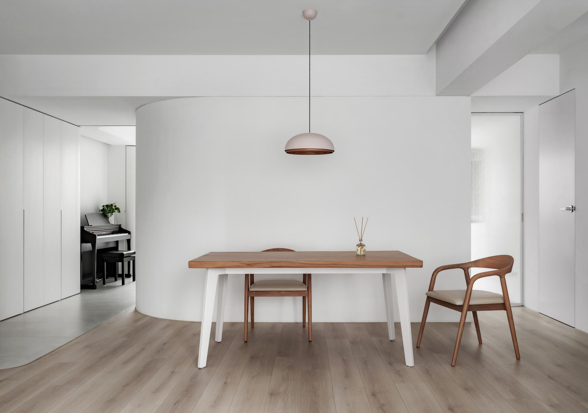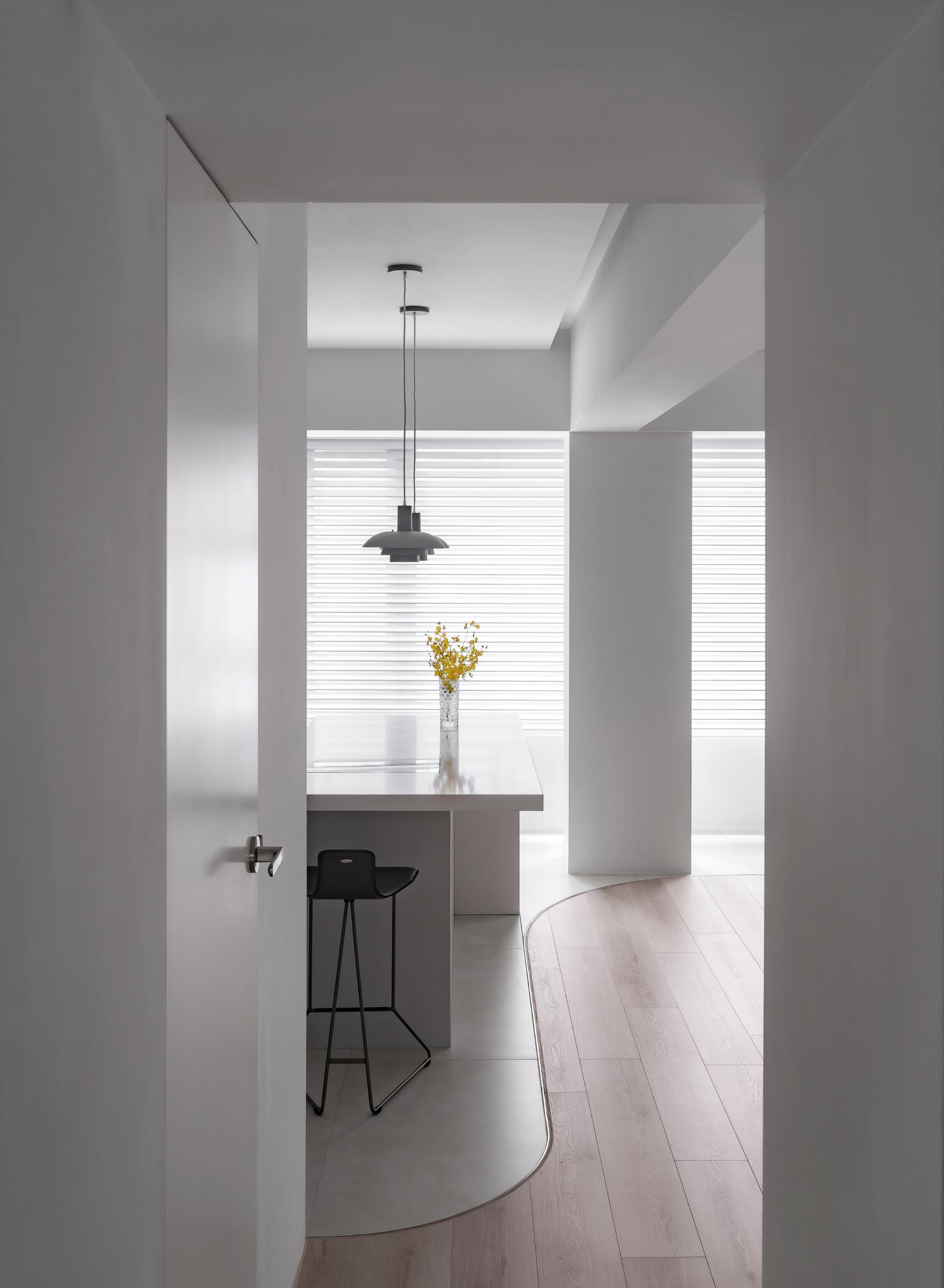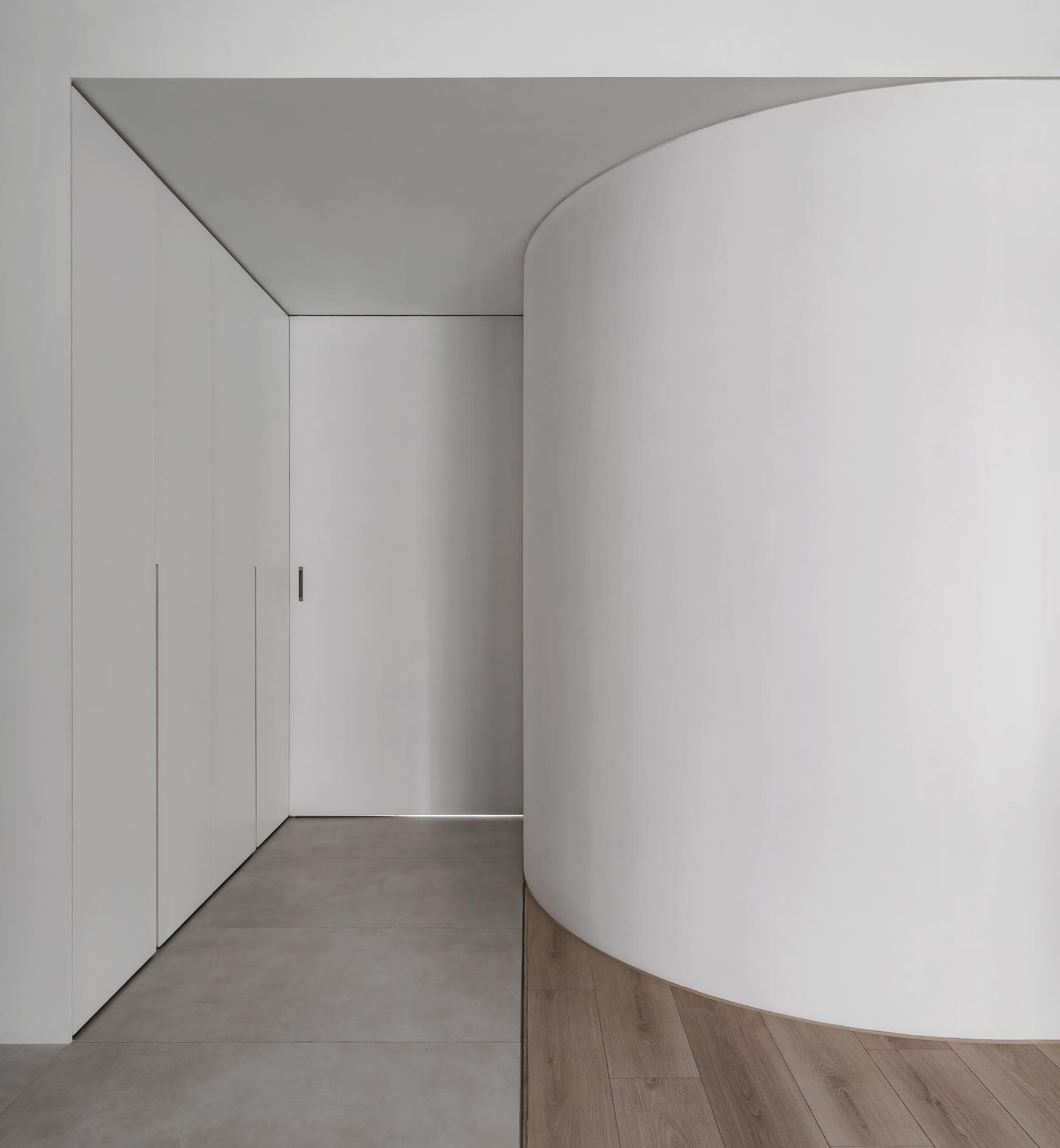 Tender Ray transforms a compact apartment into a minimal sanctuary of calm. A sculptural white curved wall connects and defines all areas—living, dining, and multifunctional spaces—while enabling natural light to animate the surfaces. Storage and structure are concealed, allowing a dialogue between form, light, and materiality. The project represents harmony between architectural clarity and emotional softness.