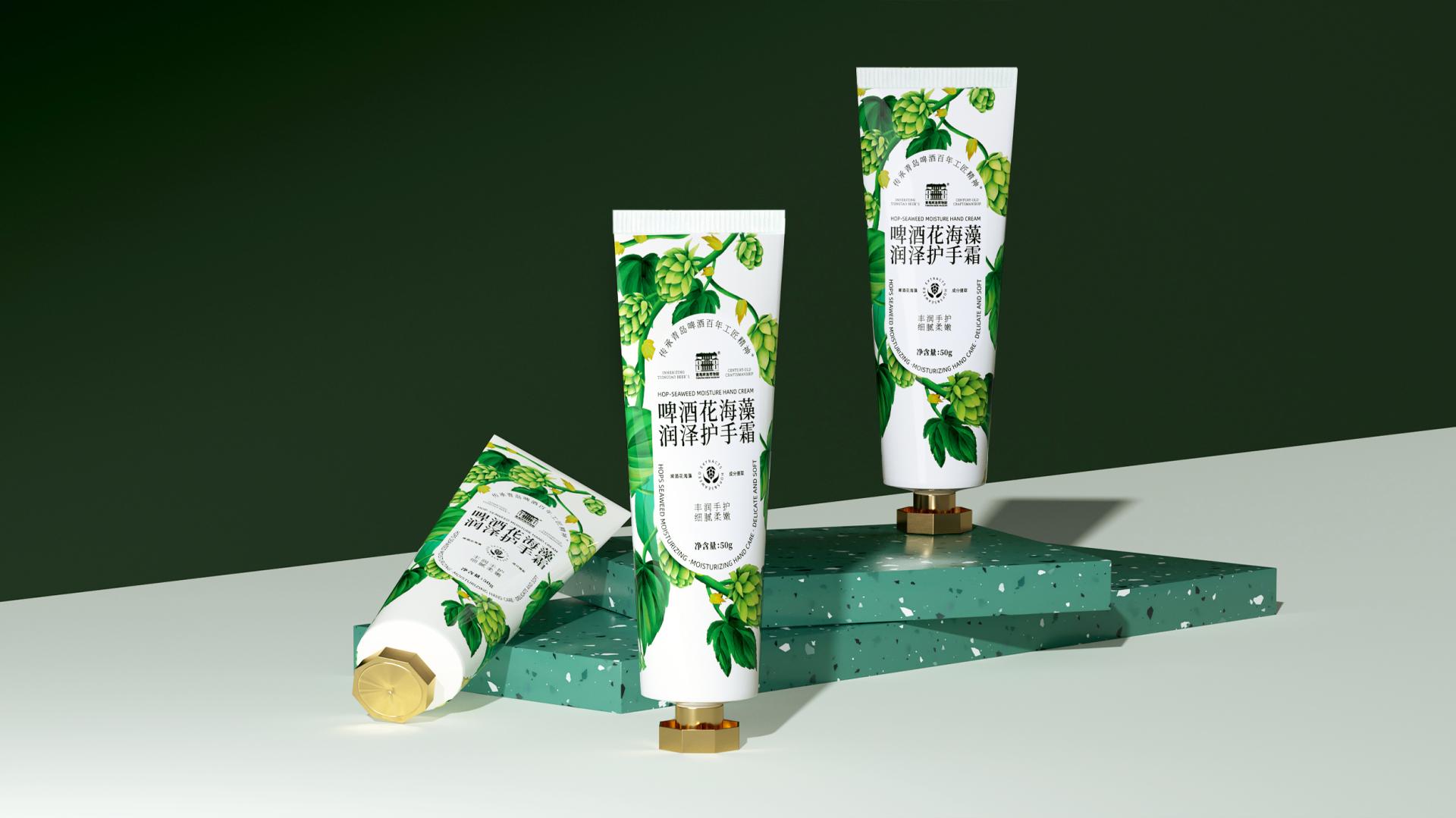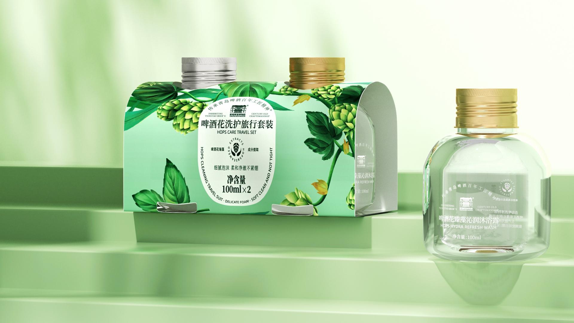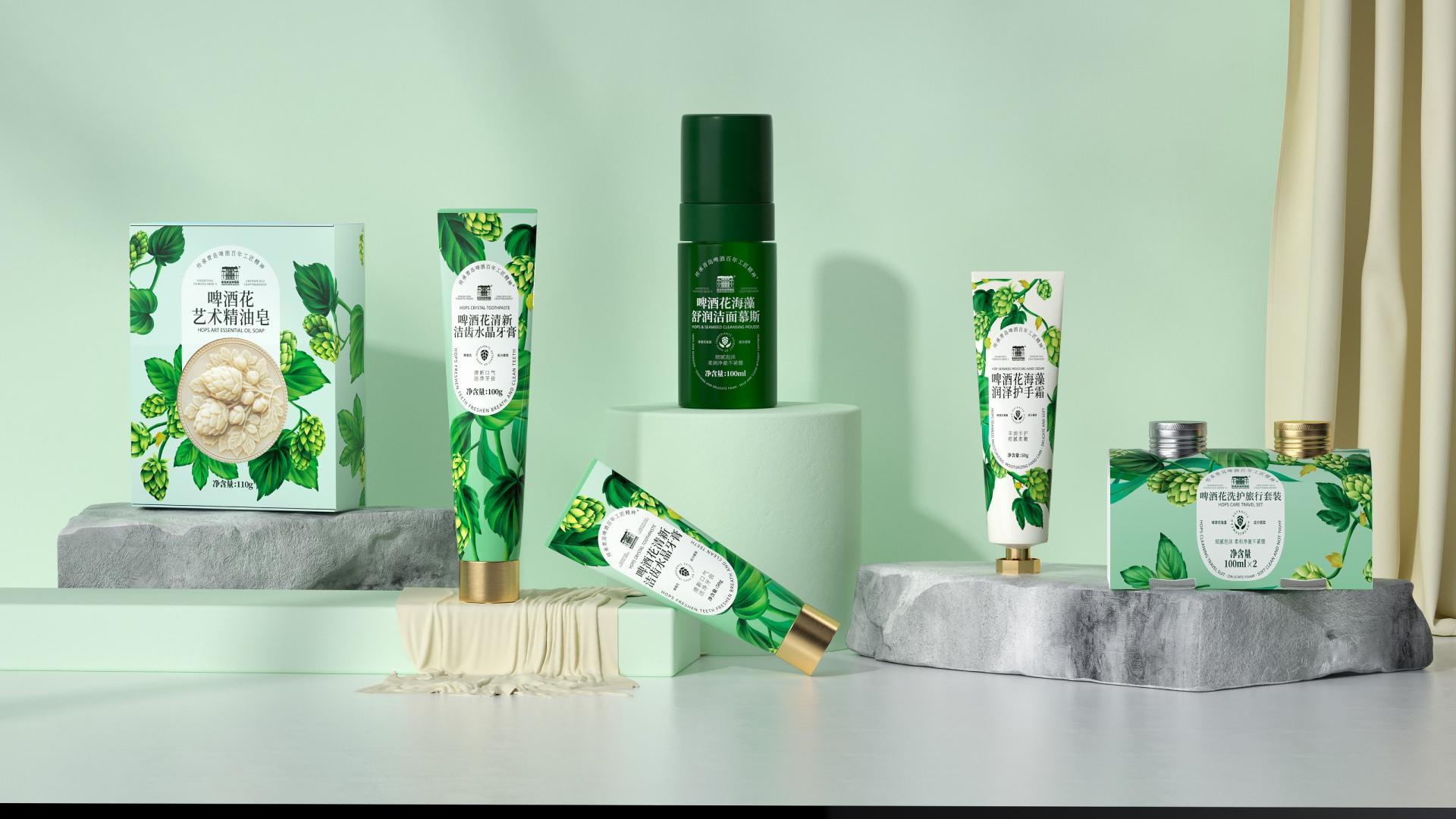 Oil-painting-style illustrations vividly depict winding hop vines and cone clusters. This captures the energy of plants bursting from the soil, visually embodying the brand’s core value of “raw vitality.” Classic elements from Tsingtao’s original beer labels merge seamlessly with fluid Art Nouveau-inspired lines, creating a visual language that balances artistic elegance with industrial heritage. A refined Morandi green palette—featuring shades from dark pine to tender bud—echoes the hop’s vitality while subtly signaling the gentle, alcohol-free, and skin-friendly formulation of this product line, helping to reinforce consumer trust. Through a consistent visual narrative, the packaging series strengthens brand recognition and uniting the product line under a cohesive identity where heritage, nature, and beauty thrive together.