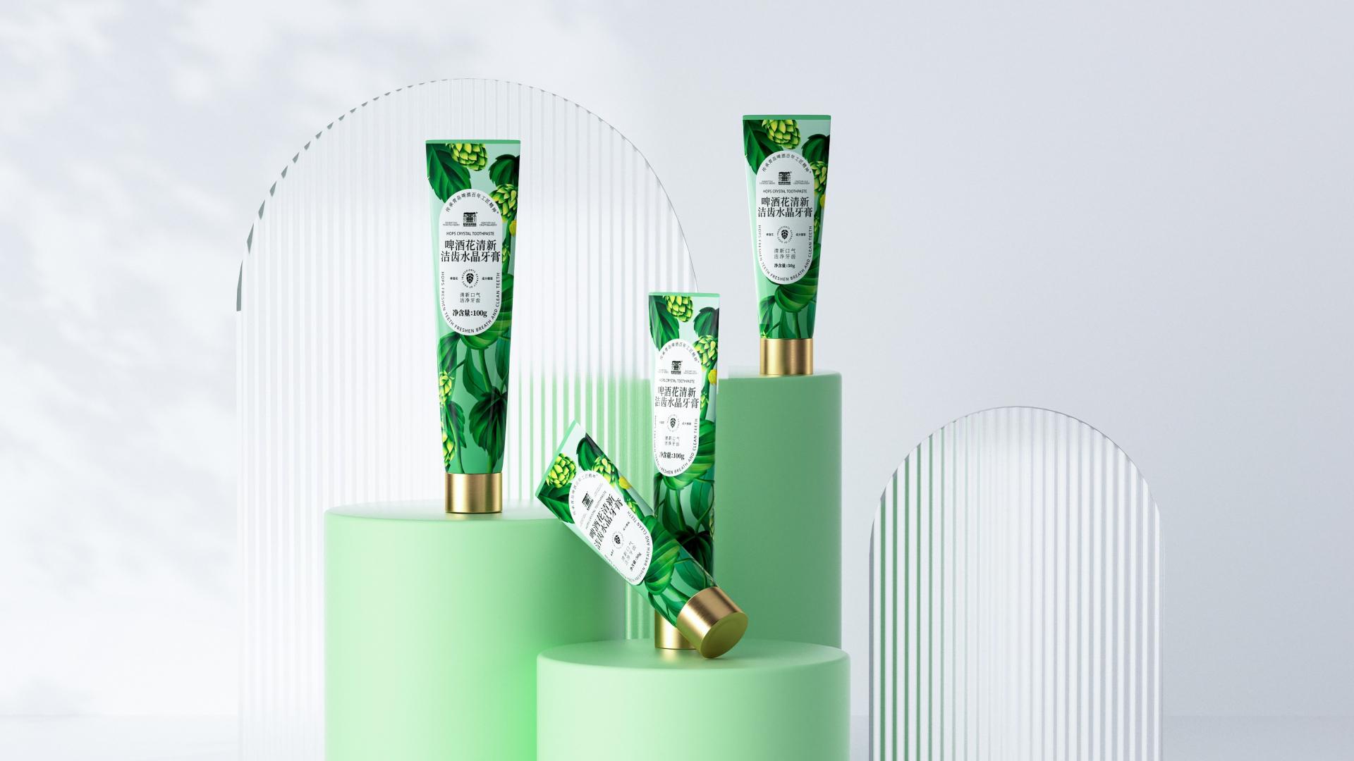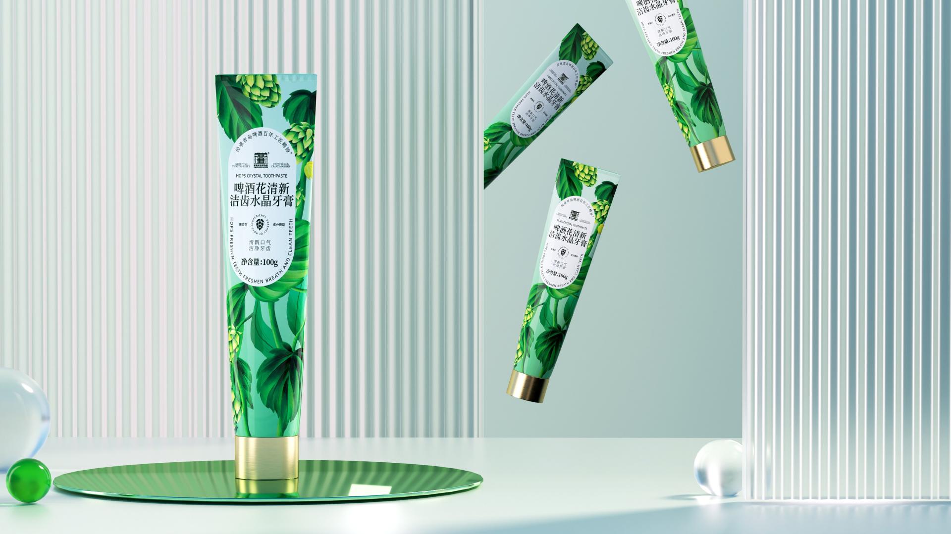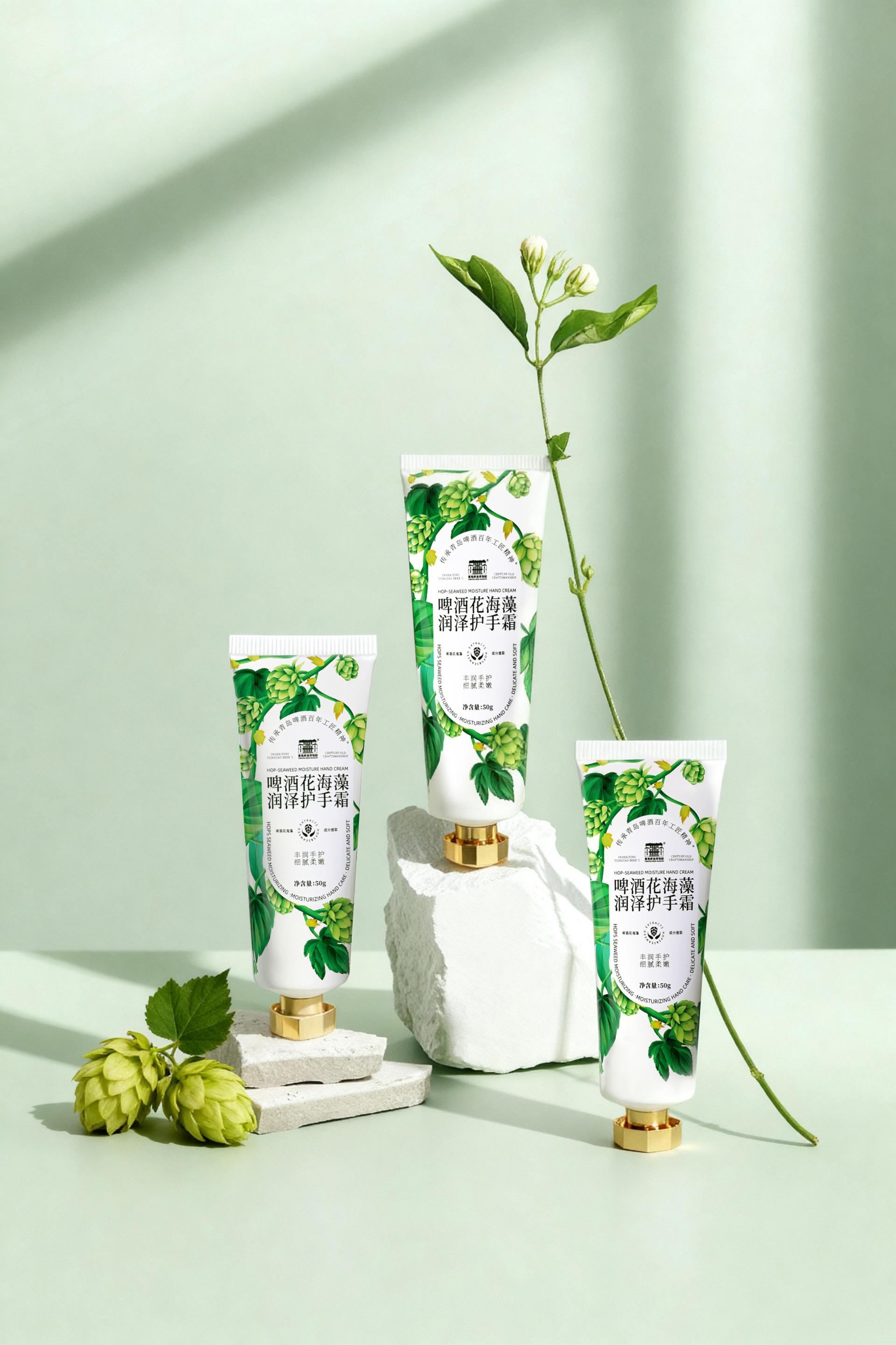 Oil-painting-style illustrations vividly depict winding hop vines and cone clusters. This captures the energy of plants bursting from the soil, visually embodying the brand’s core value of “raw vitality.” Classic elements from Tsingtao’s original beer labels merge seamlessly with fluid Art Nouveau-inspired lines, creating a visual language that balances artistic elegance with industrial heritage. A refined Morandi green palette—featuring shades from dark pine to tender bud—echoes the hop’s vitality while subtly signaling the gentle, alcohol-free, and skin-friendly formulation of this product line, helping to reinforce consumer trust. Through a consistent visual narrative, the packaging series strengthens brand recognition and uniting the product line under a cohesive identity where heritage, nature, and beauty thrive together.