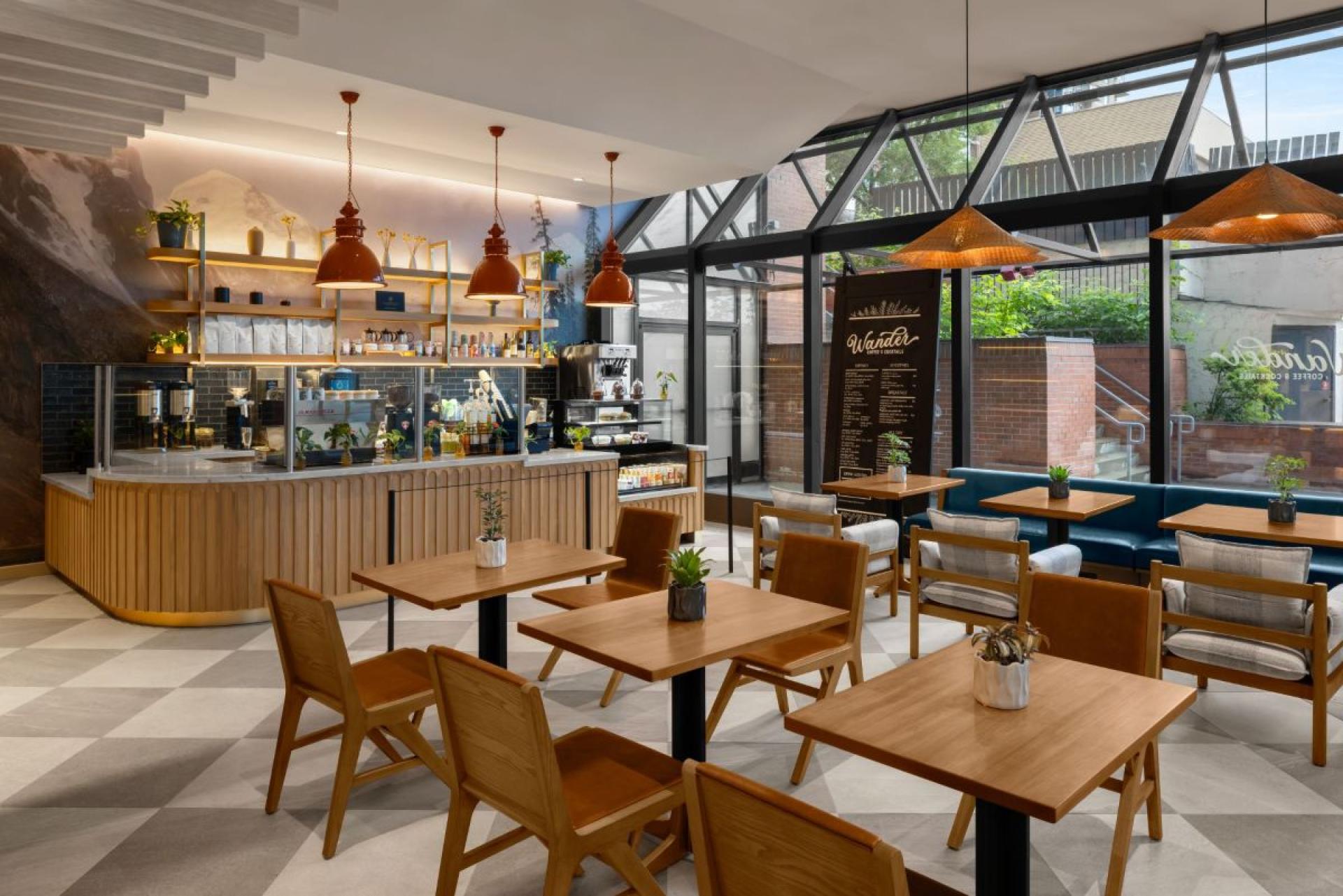 At street level, Wander Coffee sets the tone. Inspired by the idea that “all who wander are not lost,” the café blends soft plaids, green walls, and picnic-inspired textures that evoke calm curiosity. A mountain mural grounds visitors in Calgary’s natural identity as they sip and explore.