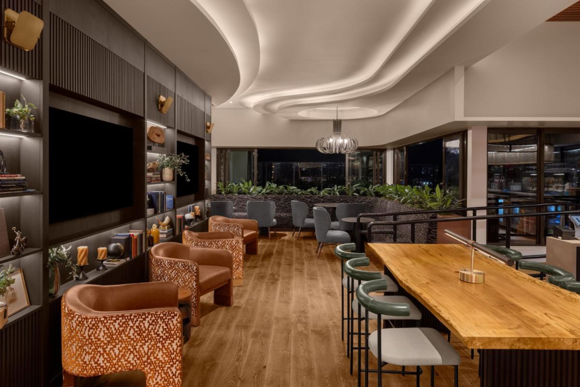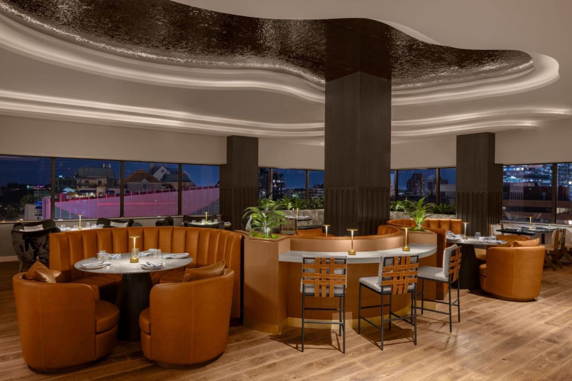 Twelve stories up, Bow & Bend Rooftop Bar awaits—a sculptural meld of nature and urban development. The ceiling undulates like the flowing Bow River while curved banquettes line the perimeter like softened riverbanks, and live-edge maple communal tables speak to Calgary’s forested foothills. Lighting elements ripple with warmth. Reclaimed wood flooring, burnt umber tiles, and brass shelving add depth, and dimensional tilework and leather seating offer refined contrast. Every sightline directs guests toward the skyline. Elevated above the city yet grounded in the rhythms of the Bow River and rising Canadian Rockies, Bow & Bend suspends travelers between earth, water, and sky—unfiltered, intentional, and alive.