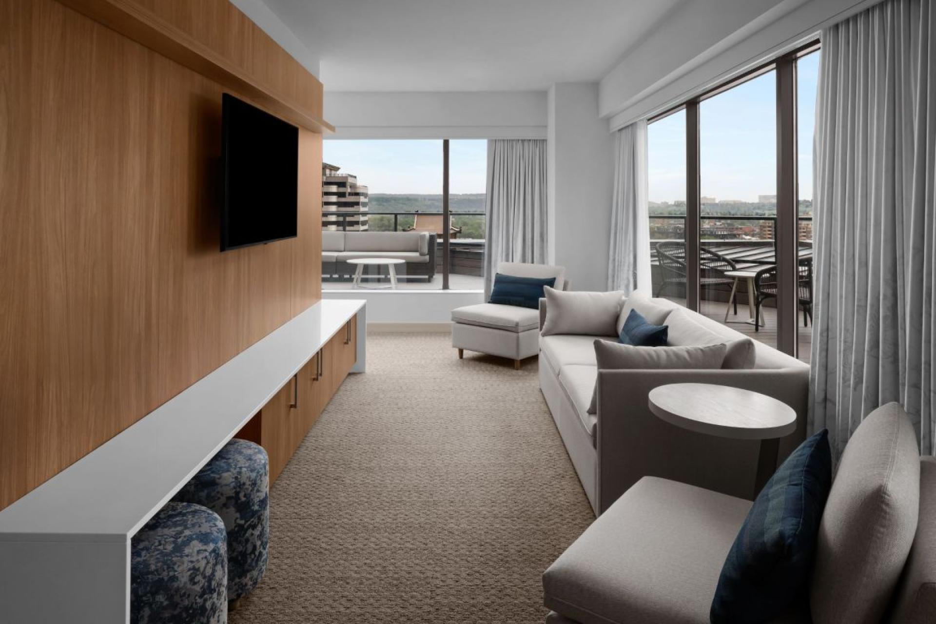 The building’s original textures—granite walls, brass-trimmed elevators, wood-paneled lobbies—are honored and extended. Modern interventions layer in dimension: mosaic wood wall tiles, concrete-look finishes, and the embedded Element “E.” Every space is both rooted and exploratory. While guestrooms offer rest and panoramic views, the communal areas encourage movement and interaction: from the Motion Fitness Center’s radiant terracotta sunburst flooring to the lobby’s flexible seating and bike borrowing program.