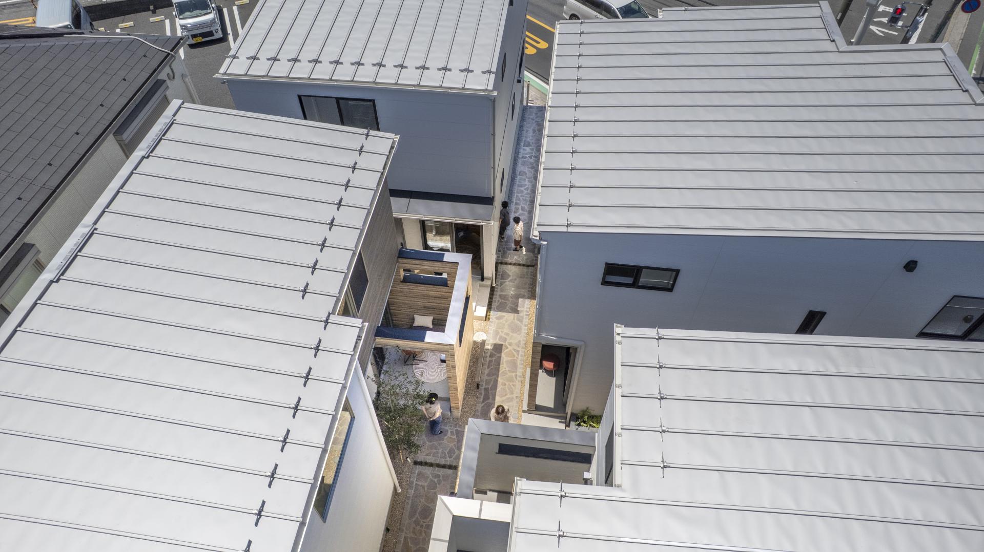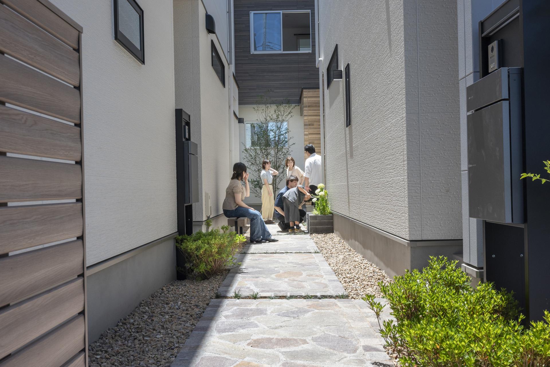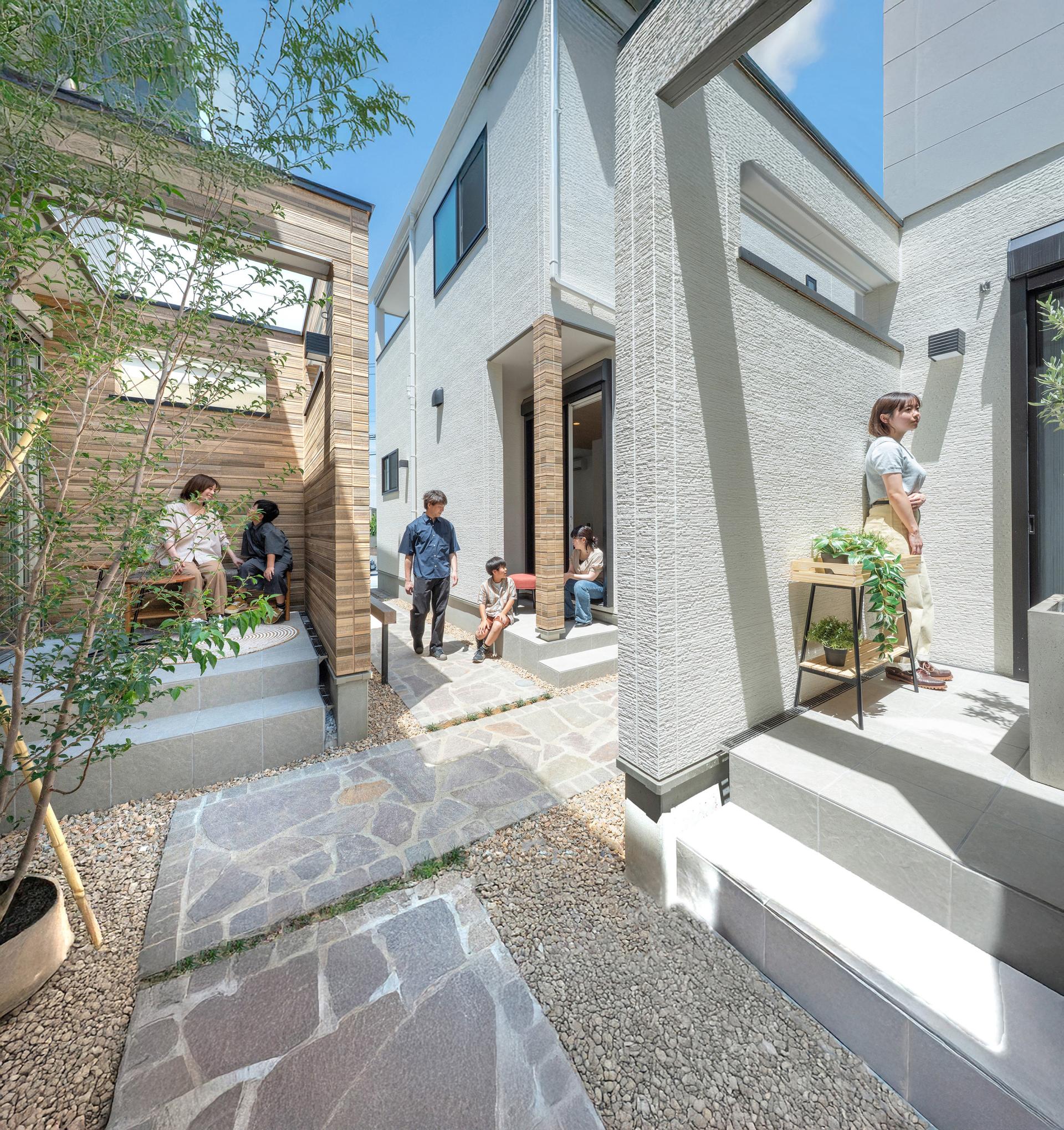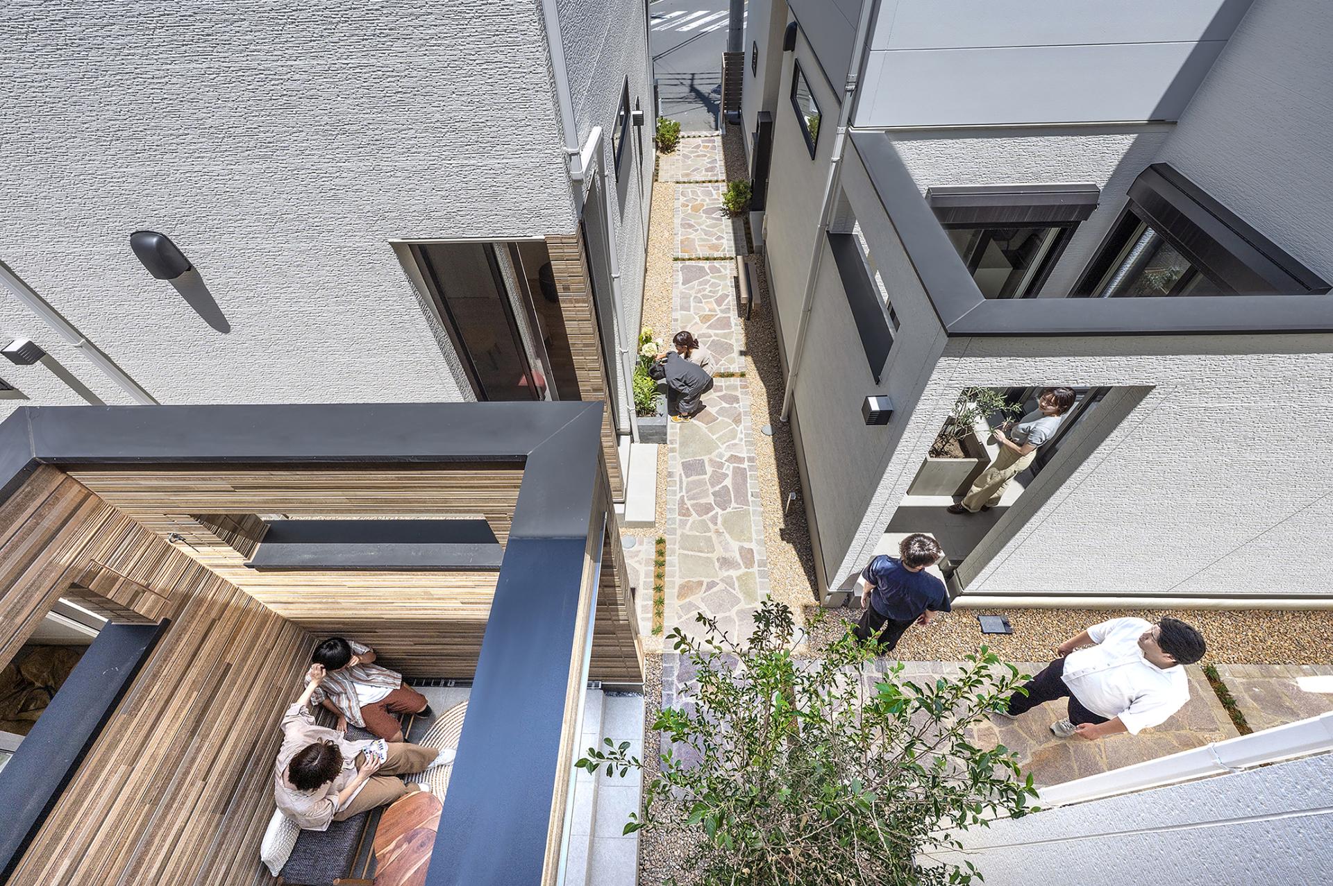 In the residential area of Kawaguchi City, Saitama, four detached homes for sale are situated on a corner intersection. At the start of the project, access to each home was limited to a busy front road with no sidewalks. The houses were also arranged back-to-back, making it difficult to create safe and easy pedestrian access or to foster interaction among residents. Furthermore, due to the small lot sizes, it was challenging to secure garden-like outdoor space beyond the parking areas, and an alternative was needed. As urban designers, we aimed to transform these conditions by encouraging neighbors to share common spaces, re-creating the external areas into highly functional shared spaces. Leveraging the convenience of the nearby station and the intersection, we sought to create a residential model that isn't uniform and is open to diverse households and lifestyles, such as DINKs and self-employed individuals, rather than just the traditional target of families with children.