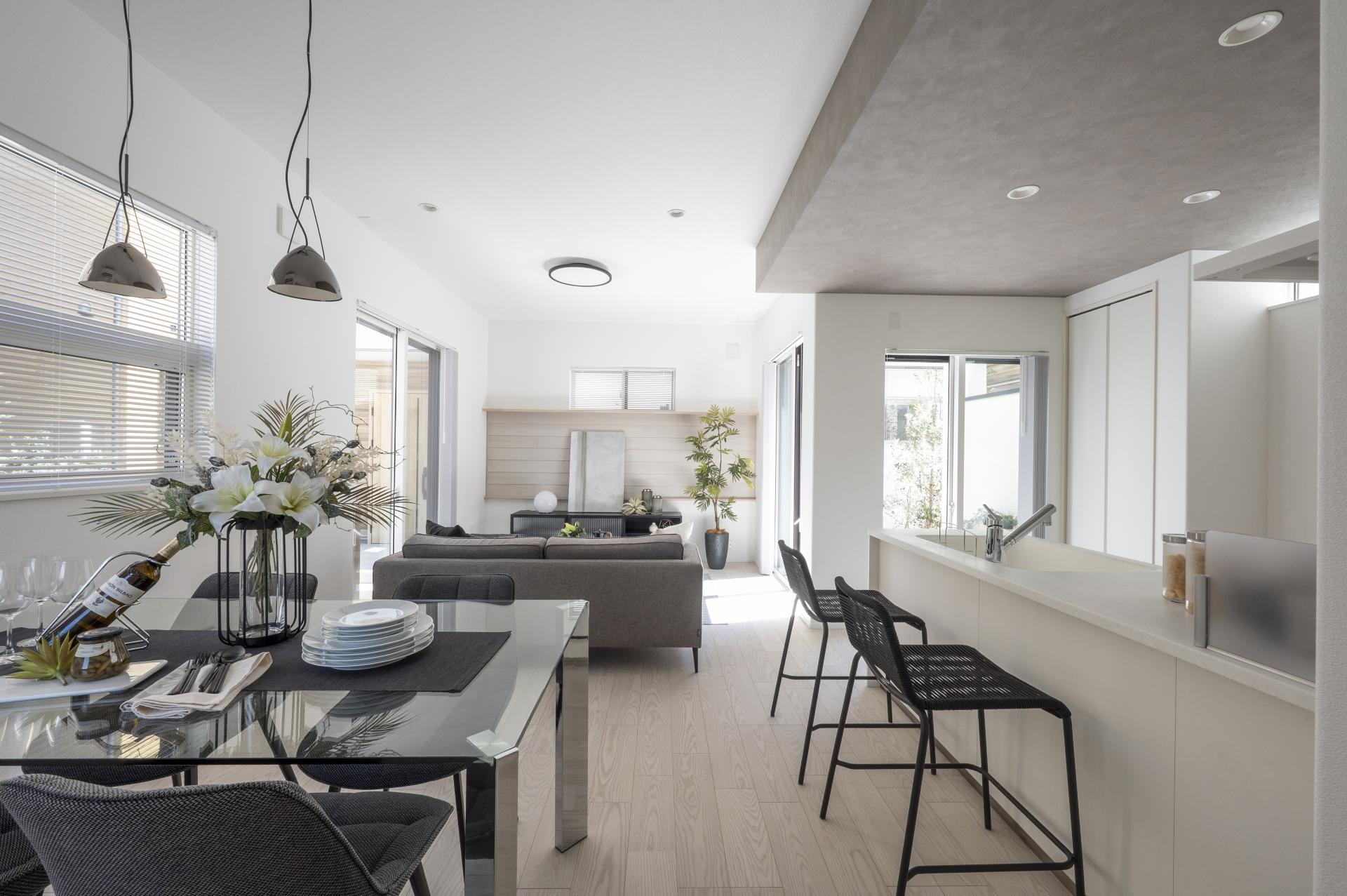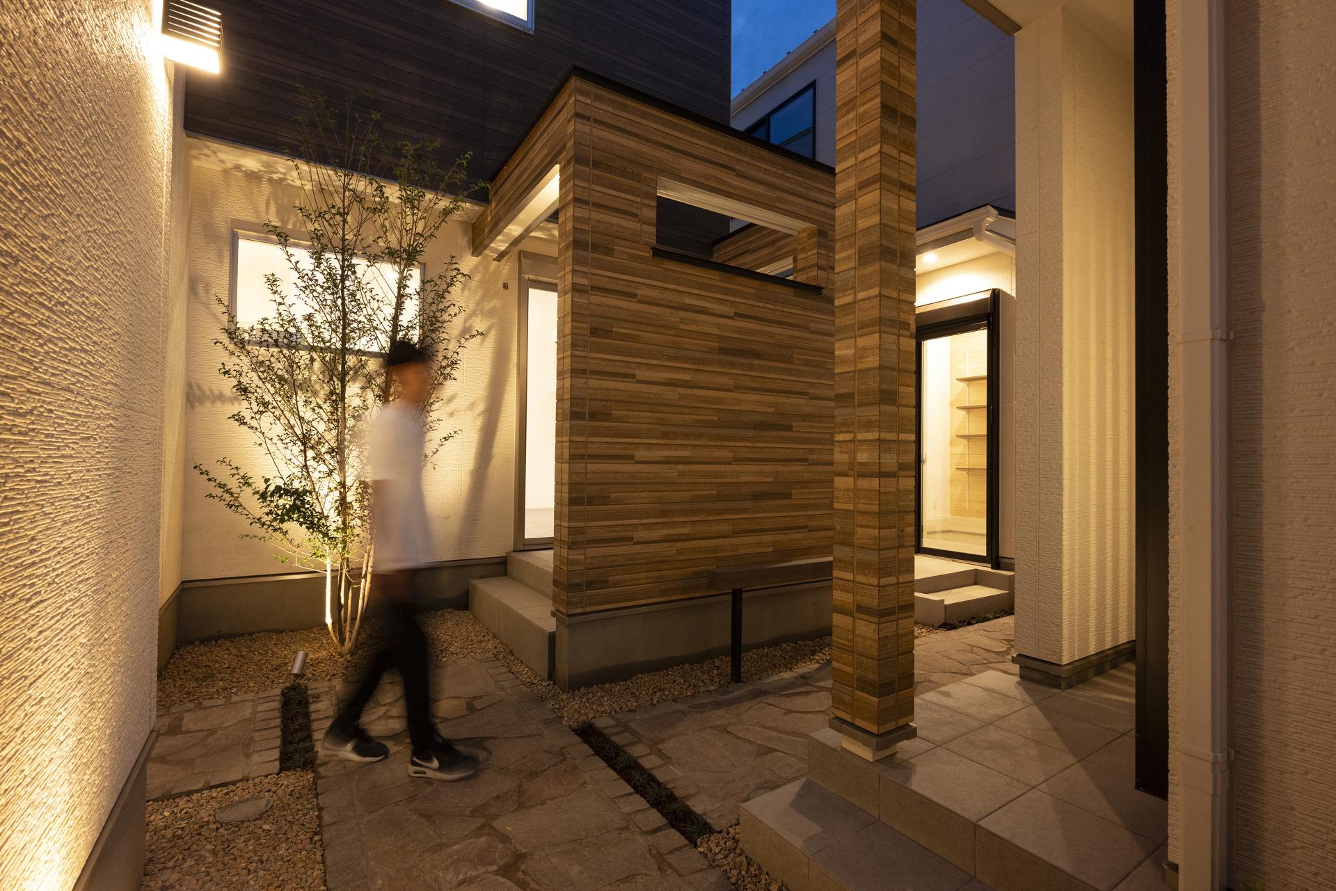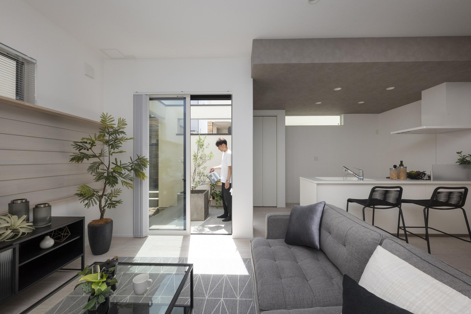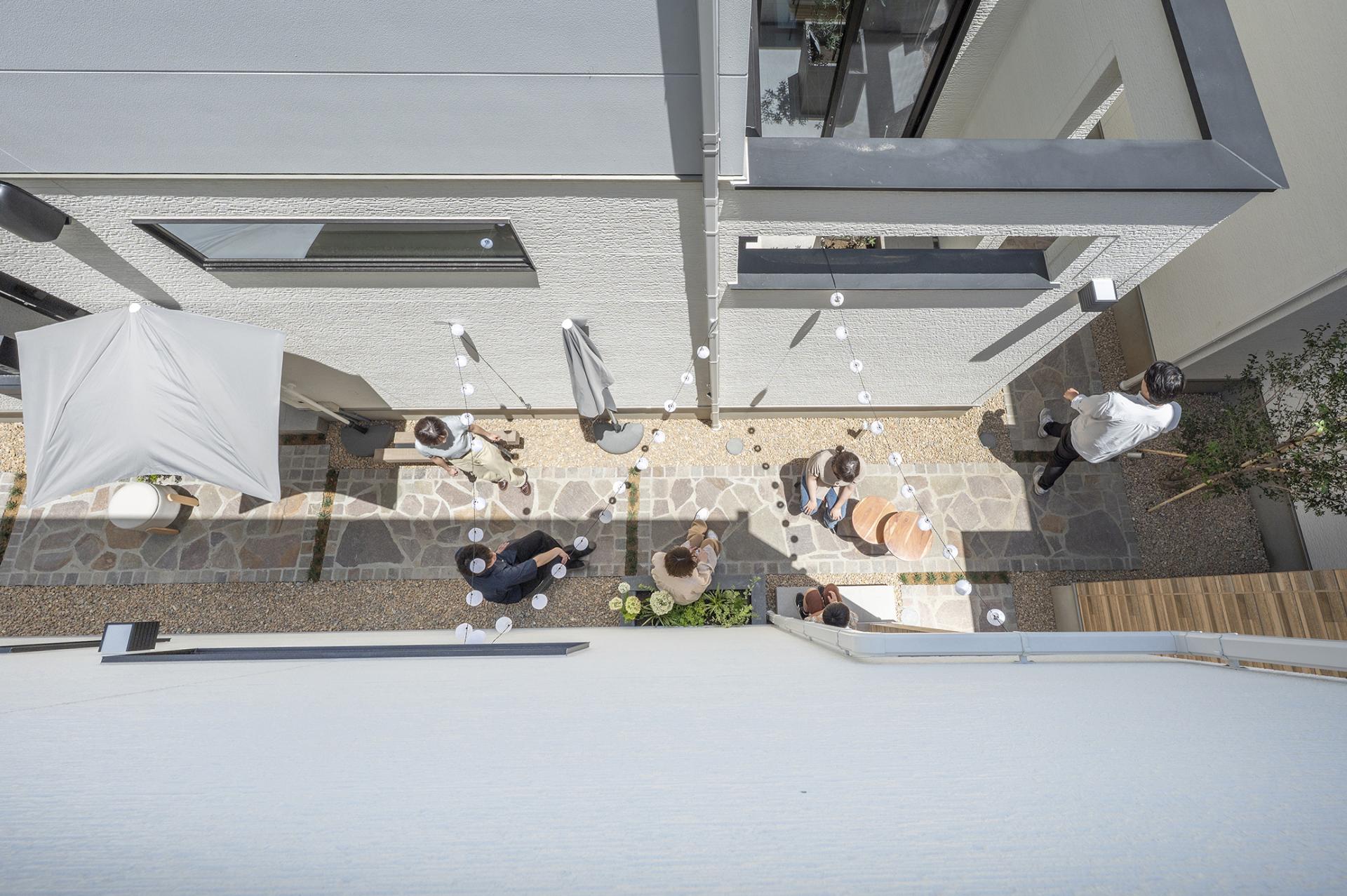 In the residential area of Kawaguchi City, Saitama, four detached homes for sale are situated on a corner intersection. At the start of the project, access to each home was limited to a busy front road with no sidewalks. The houses were also arranged back-to-back, making it difficult to create safe and easy pedestrian access or to foster interaction among residents. Furthermore, due to the small lot sizes, it was challenging to secure garden-like outdoor space beyond the parking areas, and an alternative was needed. As urban designers, we aimed to transform these conditions by encouraging neighbors to share common spaces, re-creating the external areas into highly functional shared spaces. Leveraging the convenience of the nearby station and the intersection, we sought to create a residential model that isn't uniform and is open to diverse households and lifestyles, such as DINKs and self-employed individuals, rather than just the traditional target of families with children.