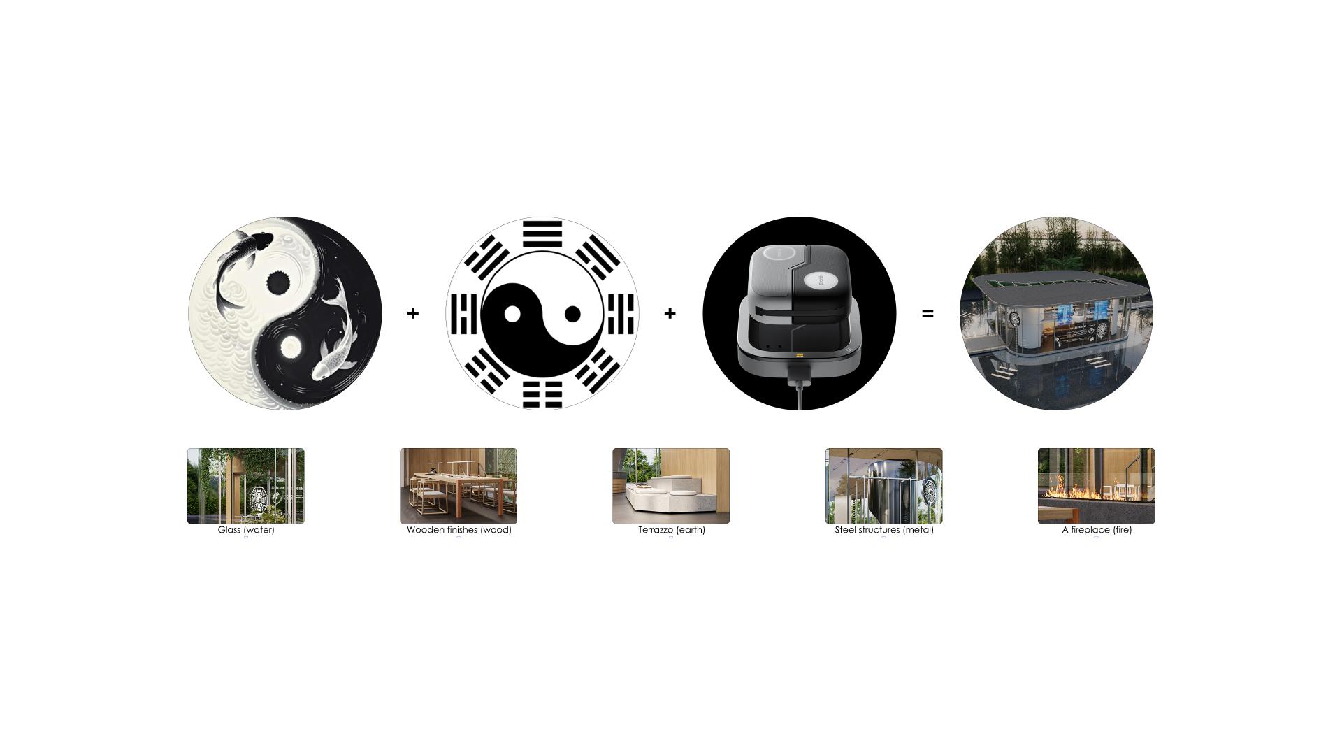The spatial design frames itself around the philosophical principles of the Eight Trigrams, blending AI energy detection, AR visualization, and intelligent feedback systems to transform complex concepts from traditional Chinese Medicine, yoga, and mindfulness into intuitive interactive experiences. The architecture draws from the Tai Chi diagram as its prototype, creating a pattern of virtual-real interplay, and incorporates five-element features such as pools, greenery, and fireplaces to echo the forms of space with Eastern philosophy. At the same time, the introduction of smart devices like energy orbs, feedback instruments, and robotic interactions converts abstract Eastern wisdom into tangible, perceptible healing experiences through technological means.