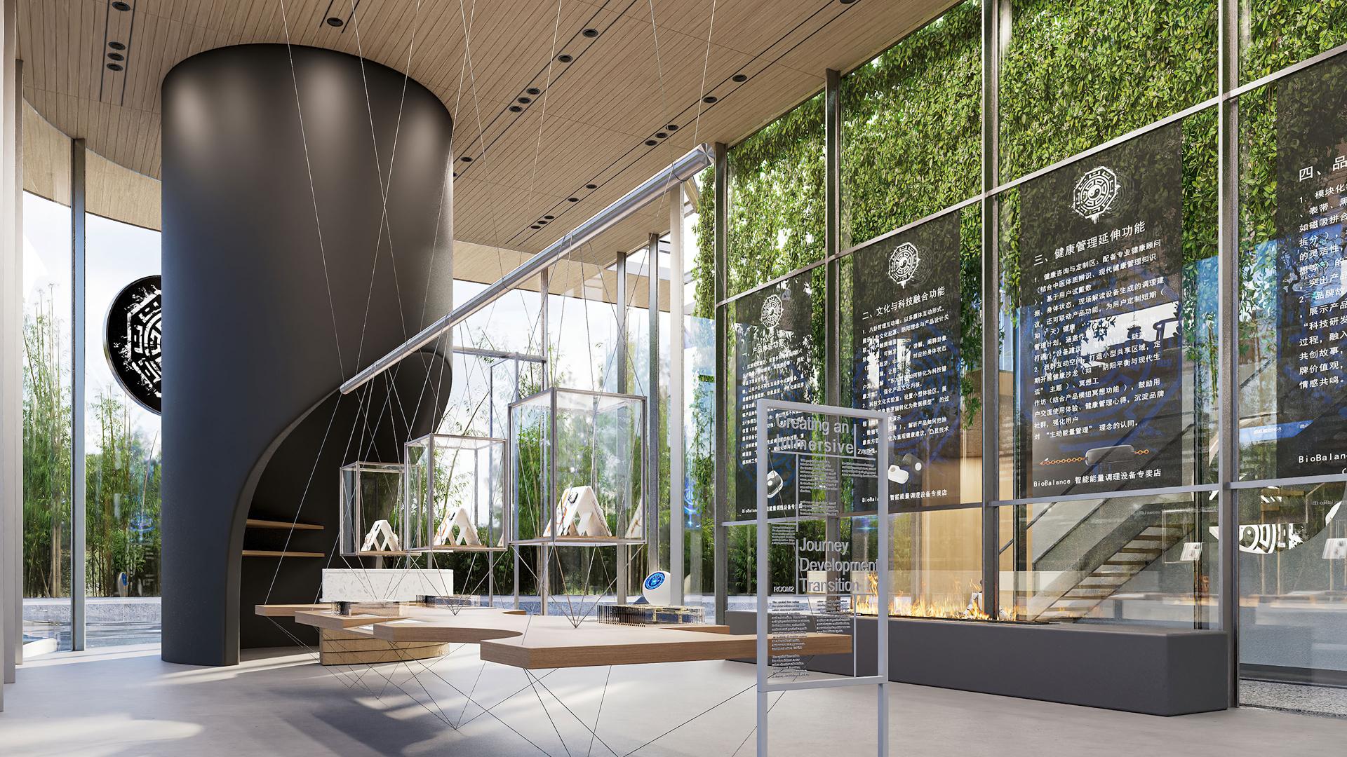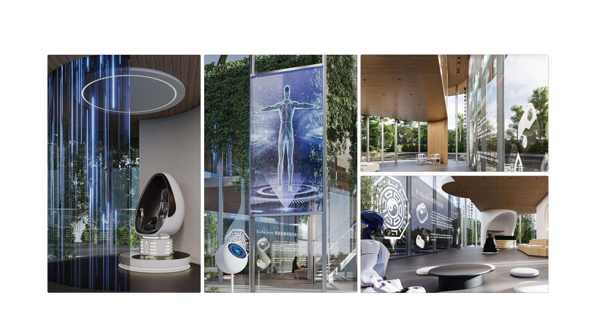 The BioBalance intelligent healing space integrates Eastern philosophy, artificial intelligence, and modern wellness concepts, drawing core inspiration from the Tai Chi Eight Trigrams. It combines the traditional wisdom of yin-yang and the five elements with an AI health management system. The overall design encompasses functions such as energy detection, cultural interactions, health consultations, movement experiences, and Tai Chi healing, aiming to create a health cultural space that unites exhibition, experience, and healing for urban dwellers.