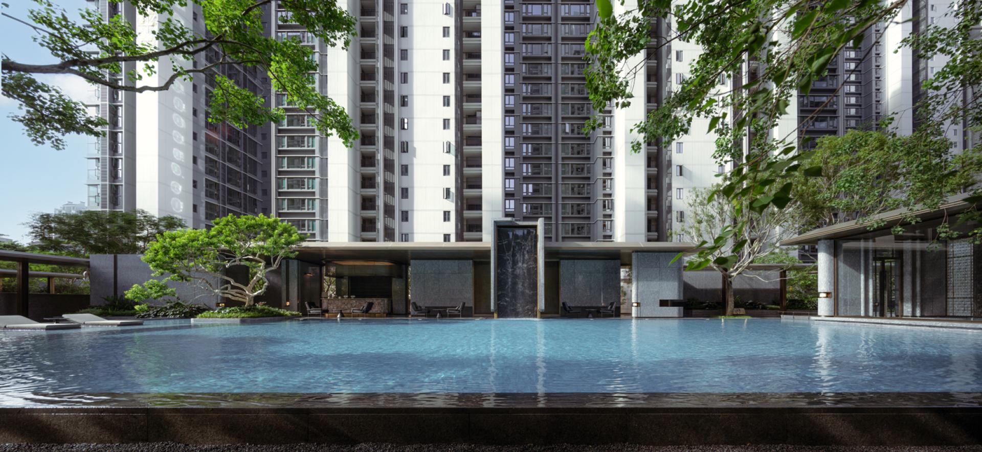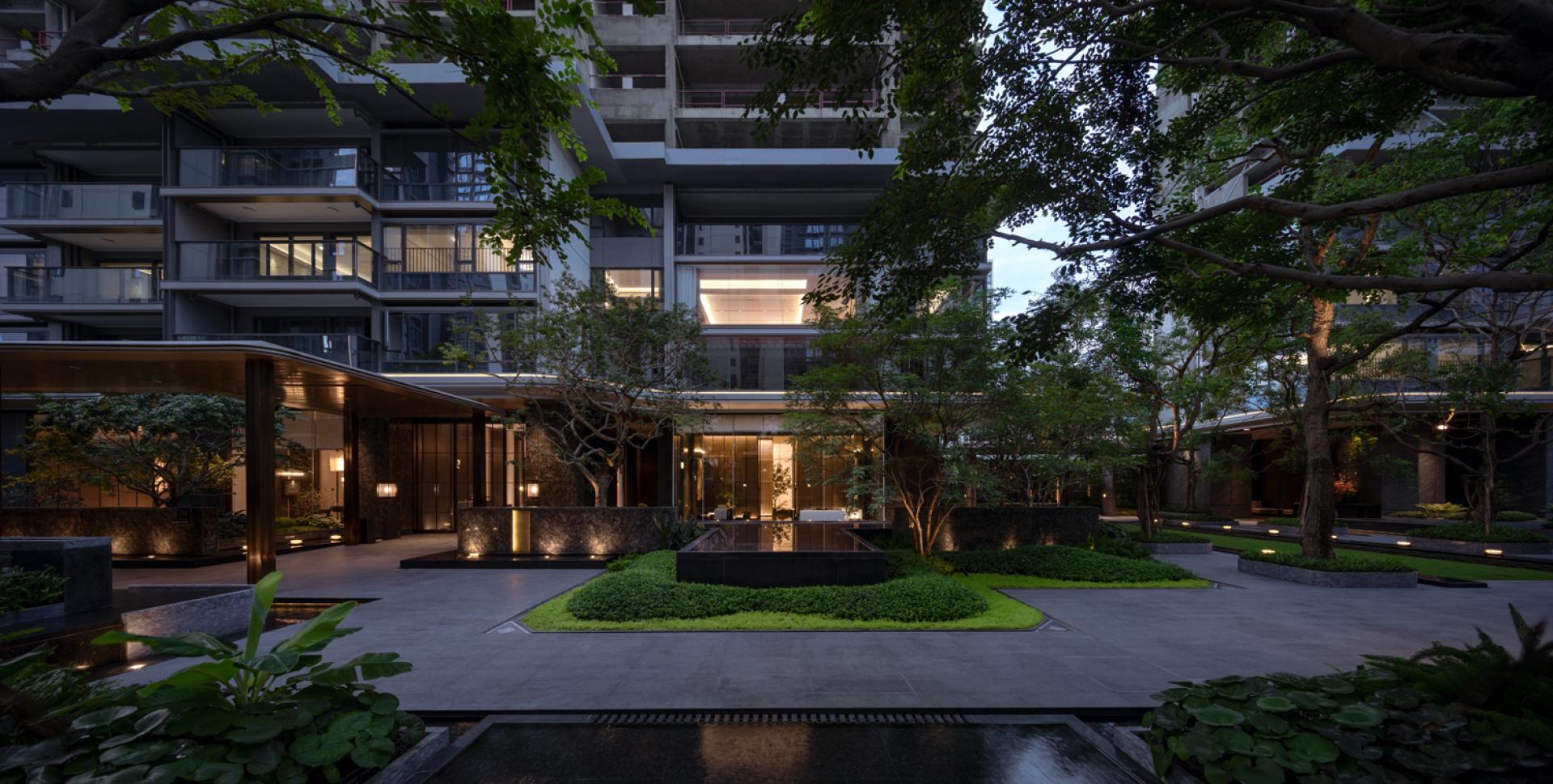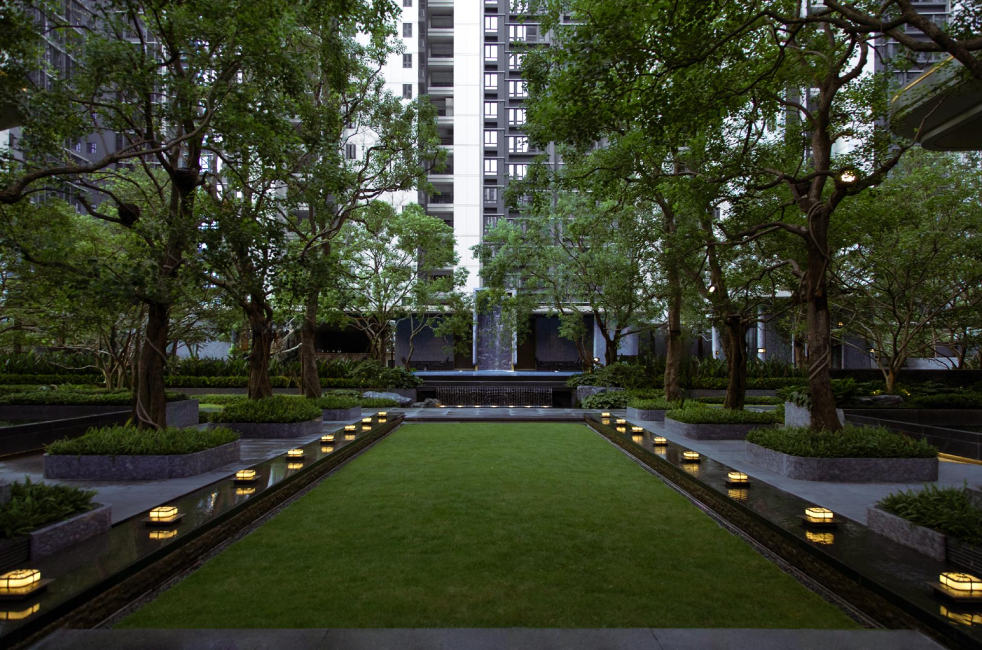 This project is situated in the core area of Bai’e Tan CBD, leveraging its comprehensive urban amenities and natural resources to create a modern, high-end residential experience that harmonizes with nature and resonates with local culture. The design concept, "One Axis, Two Cores, Eight Landscapes," utilizes a linear spatial organization, with a water feature and a central lounge serving as the functional and visual core. It interprets elements of Lingnan culture in a modern way, culminating in eight immersive landscape scenes, achieving an organic blend of hotel-style refined landscaping, natural ecosystems, and vibrant community life. Located in the heart of Bai’etan CBD, the project boasts complete surrounding amenities. The development includes approximately 50,000 square meters of commercial space, encompassing a shopping mall, supermarket, restaurants, and entertainment facilities, catering to daily living needs. Conveniently located near Dongjiang North Road and Dongjiang South Road, the project is 800 meters from Kengkou Station on Metro Line 1, providing easy access to multiple business districts and key locations in the city center, as well as the Ring Road Expressway and Guangzhou-Huaihua Expressway. Furthermore, the Dongjiang asset portfolio also includes a planned 400,000-square-meter waterfront commercial strip, integrating pedestrian walkways and elevated leisure spaces, creating an all-weather, accessible lifestyle destination. The community's northern boundary borders a tributary of the Huadi River, forming a natural water feature, with approximately 18,000 square meters of green space. The landscape design, inspired by high-end hotel landscaping concepts, features a "One Axis, Two Cores, Eight Landscapes" framework, with a swimming pool and a multi-functional lounge as key elements, aiming to integrate modern community functions with natural ecology. The design emphasizes spatial order, visual perspectives, blurring the boundaries between indoor and outdoor spaces, and the contemporary interpretation of Lingnan cultural elements.