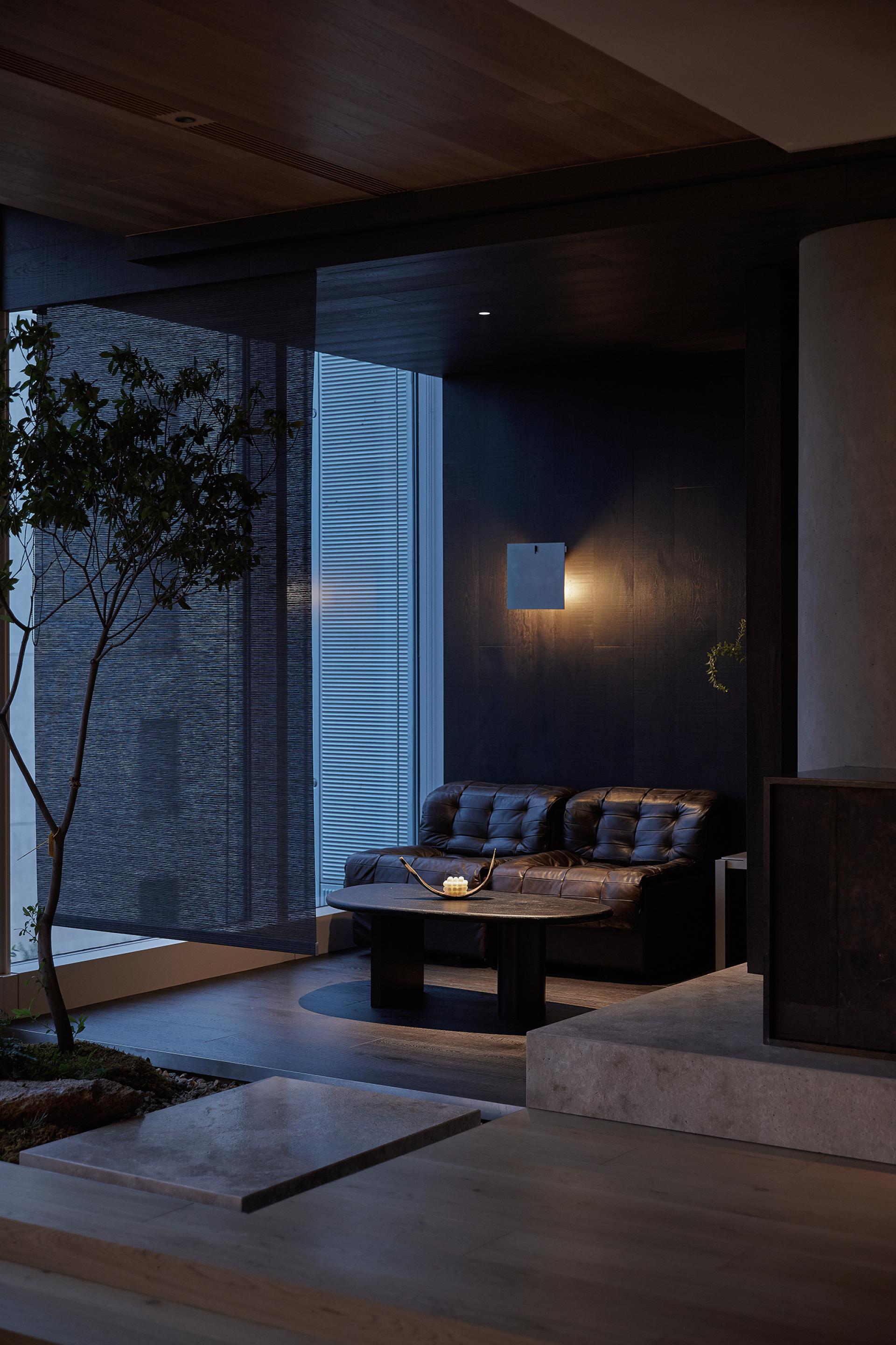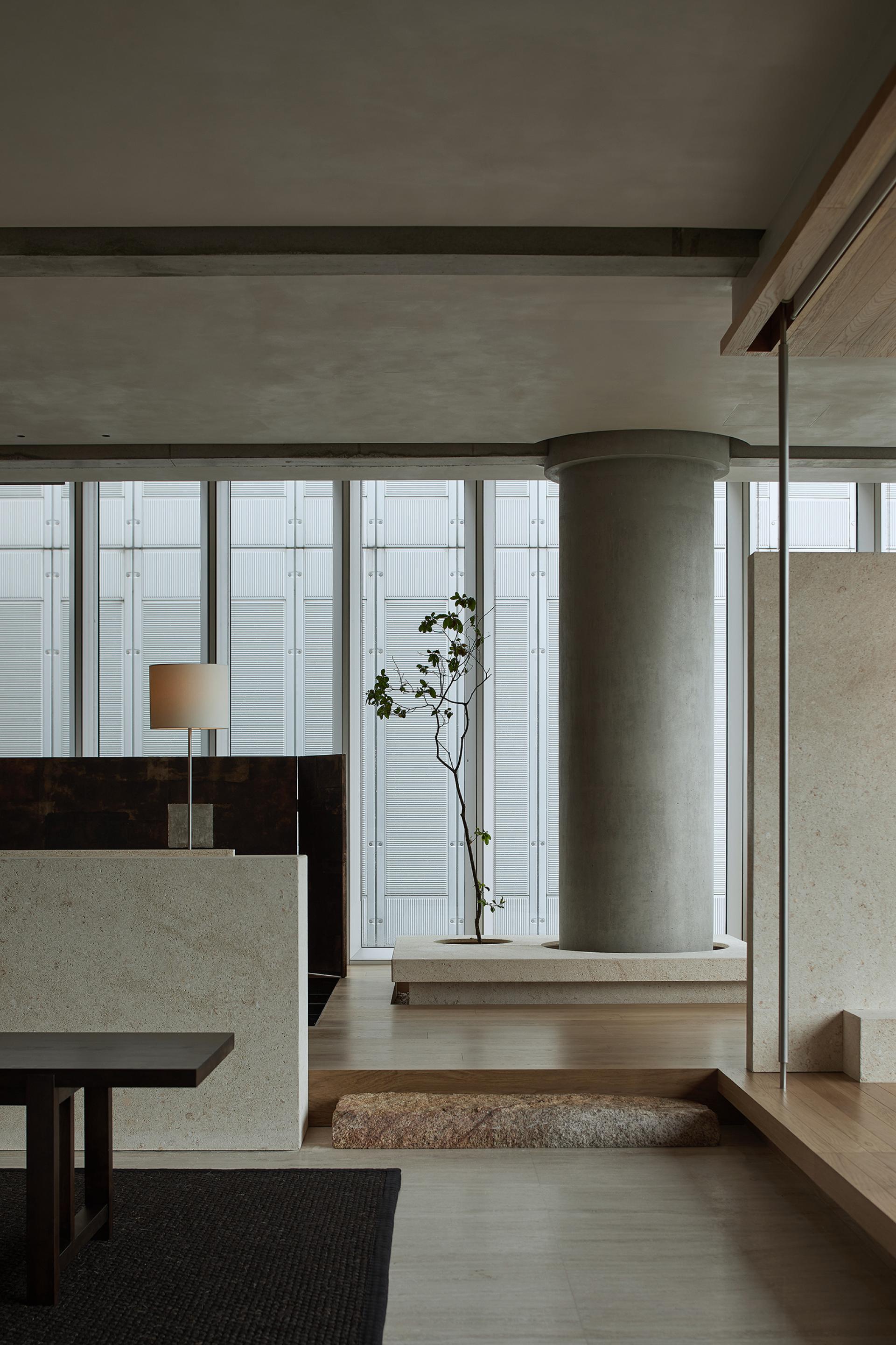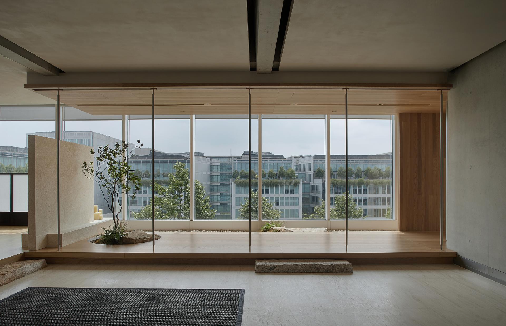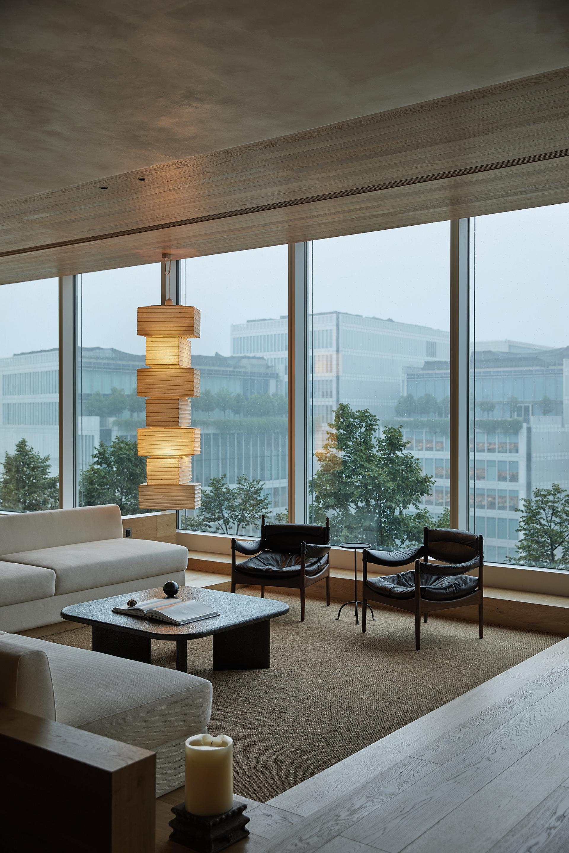 Materiality plays a key role in shaping this warmth. While preserving the original gray cement walls of Tianmu Li, the design introduces warm wood and natural stone, creating a dialogue of contrasting textures. This combination reduces the coldness of concrete and reshapes the office into a more human-centered environment. Light further enhances the space, acting as a silent storyteller—diffusing softly during the day and shifting into a warm glow at night—allowing the interior to embody different moods across time.