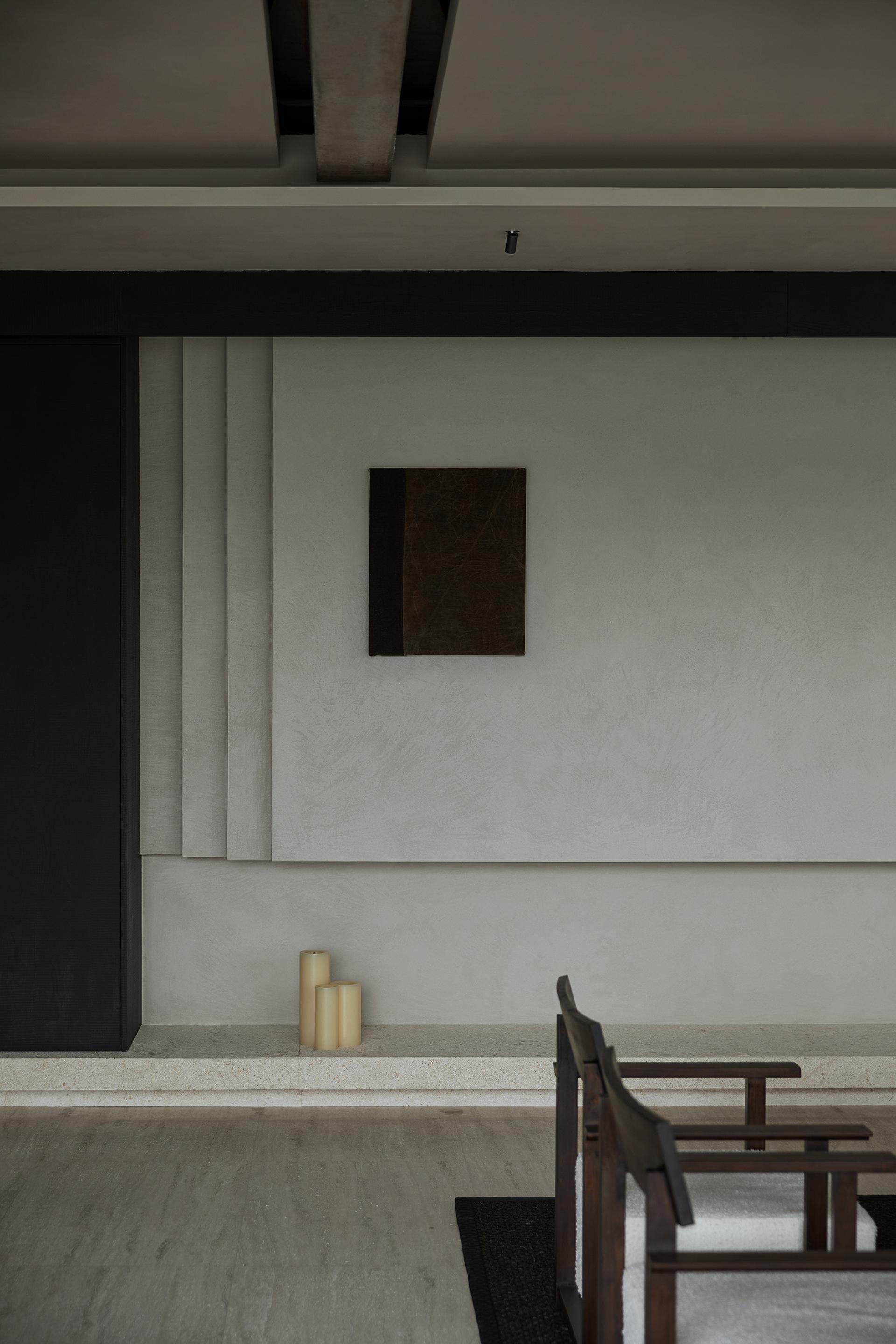 Spatially, two main “hall” areas are connected by a corridor, where staggered blocks, elevated platforms, and sunken negotiation areas generate subtle elevation changes. Greenery buffers the urban bustle, while a lacquer-finished bar links traditional craftsmanship with the raw concrete structure, translating the design concept into tangible form.