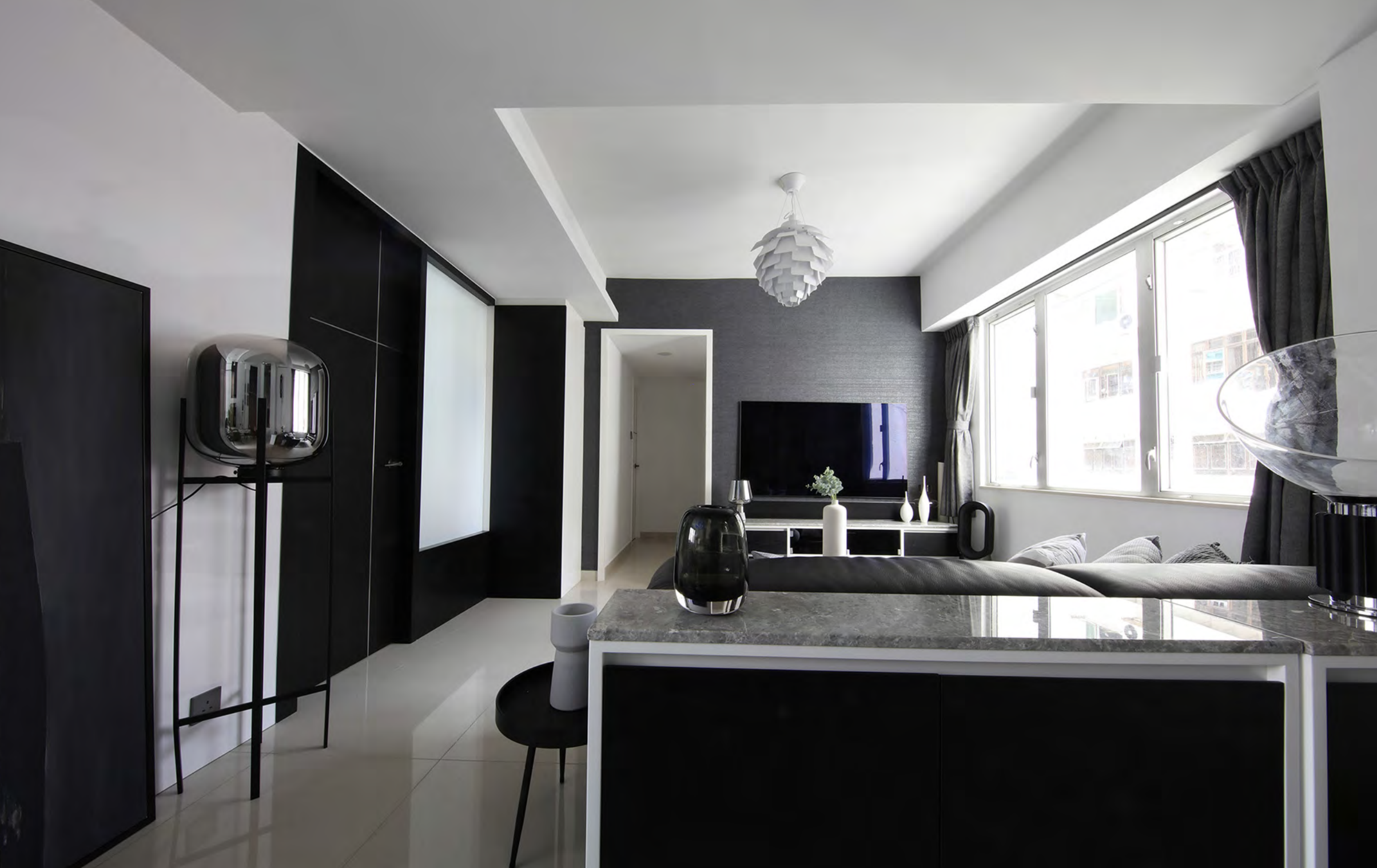 "Shadow & Light" is an interior design project that meticulously crafts a serene yet dynamic living environment for a homeowner couple in Waterloo Hill. Spanning 900 sq. ft., this residence is a testament to sophisticated simplicity, where the clients' preference for a refined palette of black, white, and grey forms the cornerstone of its aesthetic. The core design philosophy was to achieve a perfect equilibrium within these monochromatic tones, ensuring the space exudes both tranquility and a compelling visual narrative. Beyond mere color application, the design intentionally orchestrates a rhythmic journey of light and shadow, intimately tied to the homeowners' daily routines and their pursuit of work-life balance. The spatial experience transitions seamlessly from day to night, mirroring their activities. Upon entering, and moving towards the kitchen, the space embraces them with bright whites, symbolizing the invigorating start of a new day. As the day progresses and work concludes, the living areas gradually deepen in tone, transitioning to darker, more subdued hues for evening relaxation and television viewing. This thoughtful progression continues into the private quarters, where bedrooms are designed to embrace a darker, more intimate atmosphere conducive to rest. This dynamic interplay of light and dark, meticulously balanced and applied, is a direct reflection of their lifestyle, enhancing functionality and emotional comfort throughout their day and fostering a harmonious work-life rhythm.