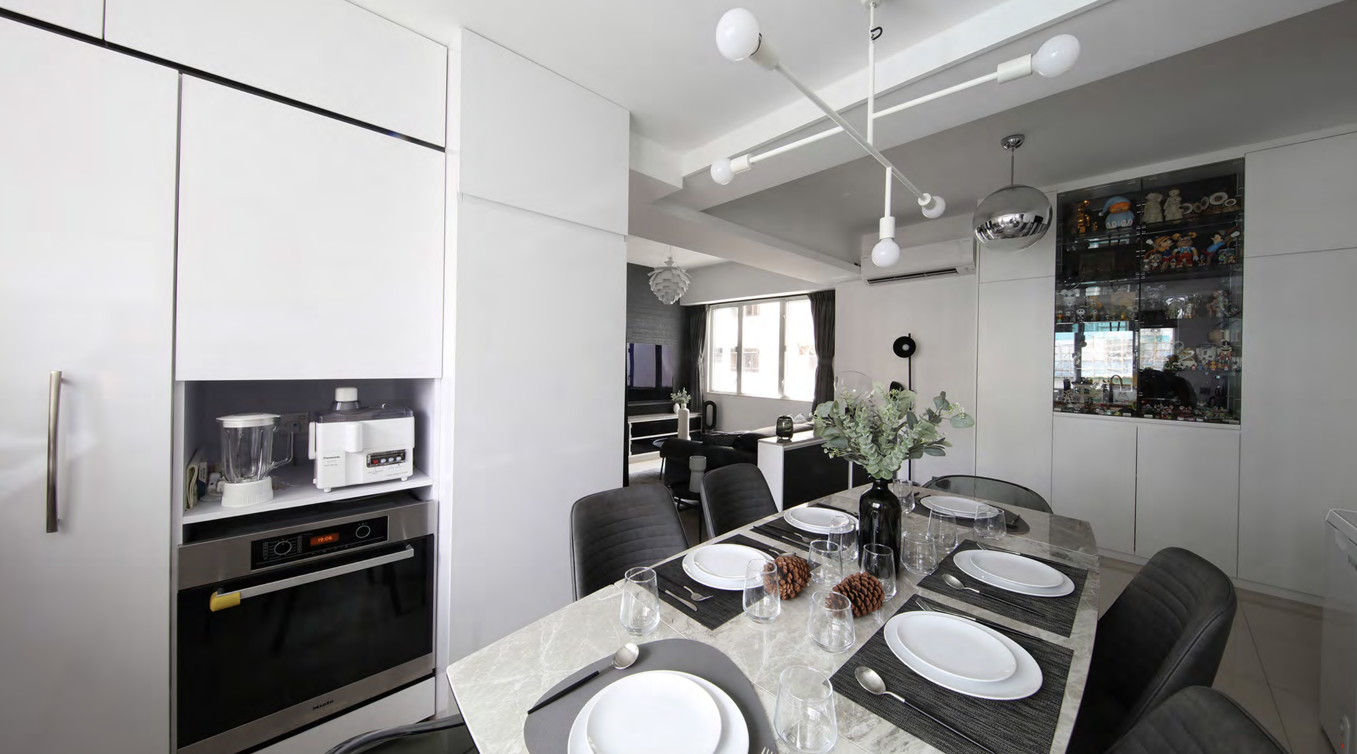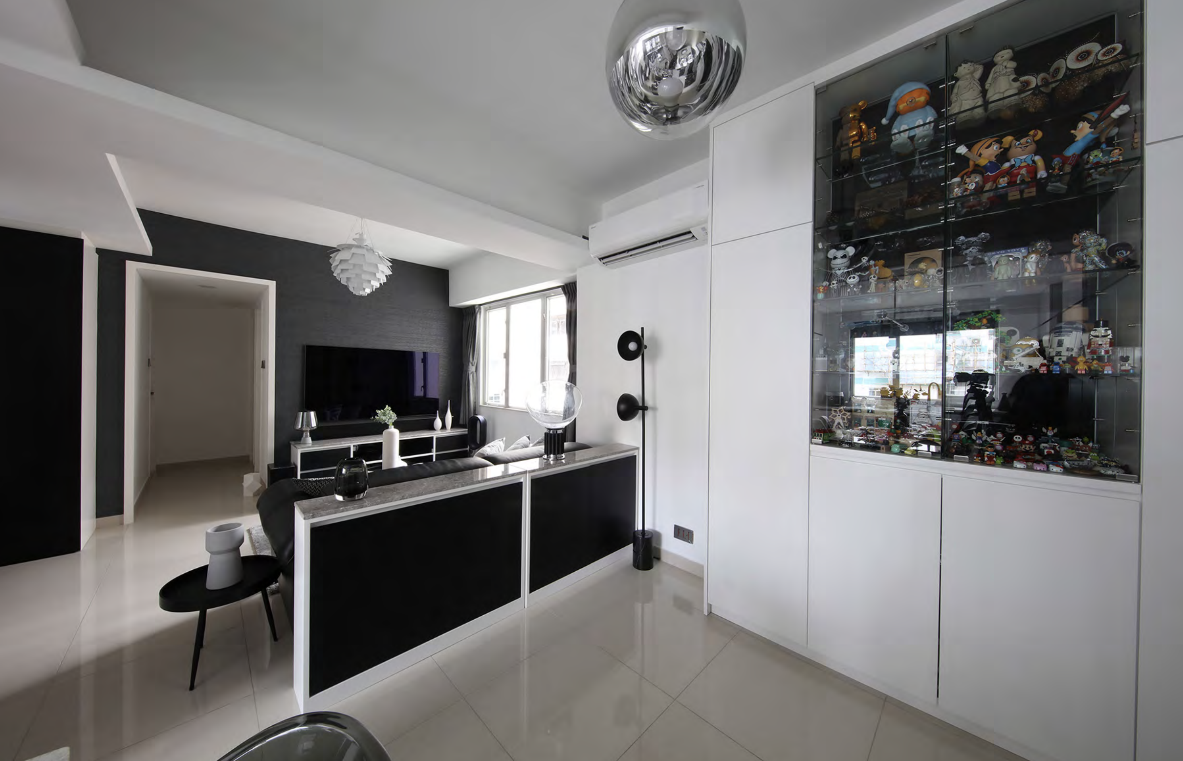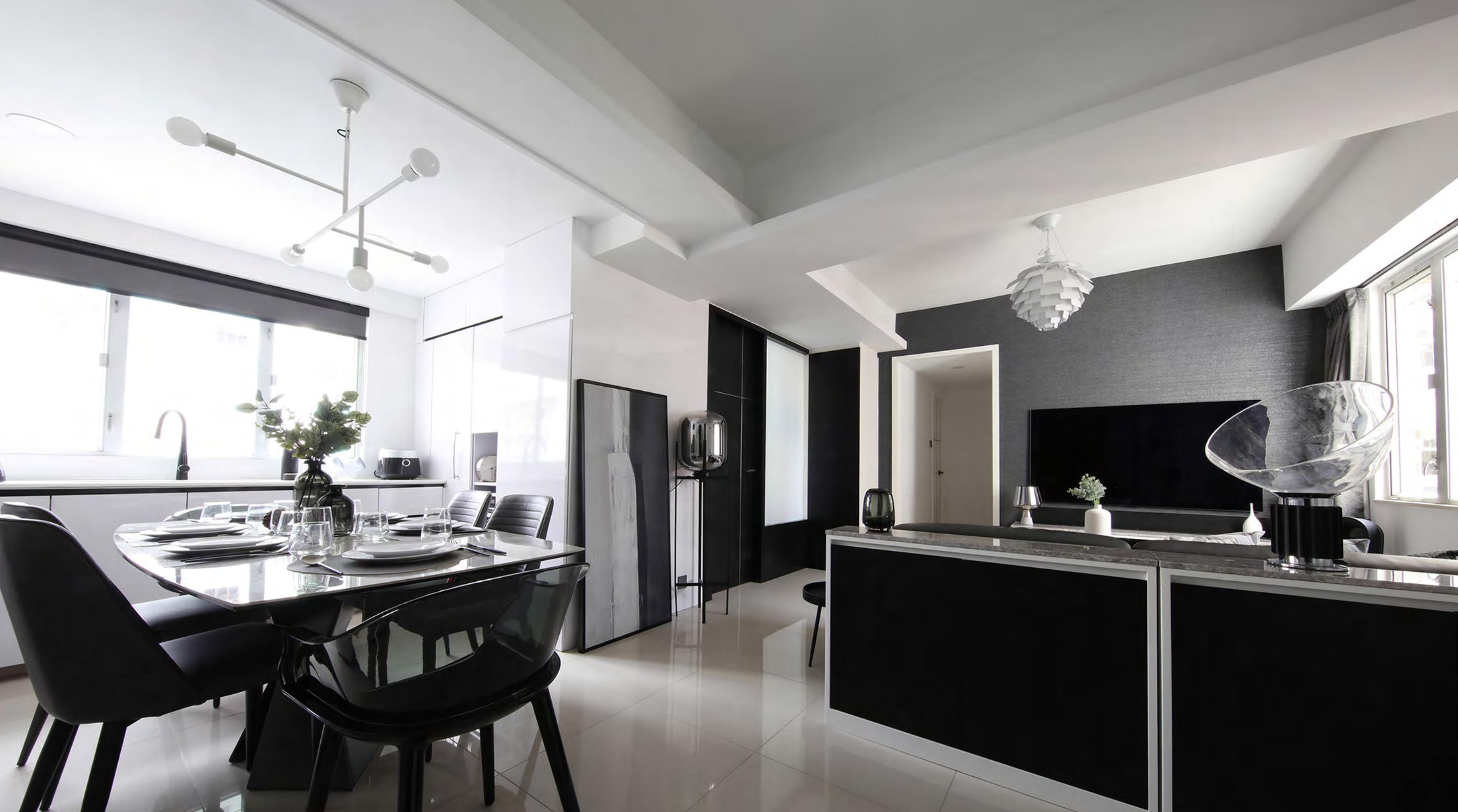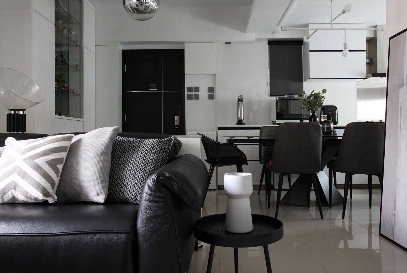 This approach is exemplified in the expansive living room, which serves as a prime canvas for creative expression and functional adaptability. Its generous proportions allowed for a fluid layout that perfectly caters to the homeowners' needs, providing ample space for relaxation and entertainment. Complementing this, a custom-designed side cabinet in the dining area seamlessly integrates specific storage and display needs. The overall result is a highly personalized sanctuary that perfectly balances the clients' desire for elegant simplicity with a rich, layered aesthetic, showcasing the timeless harmony of black and white, and their profound connection to daily life.