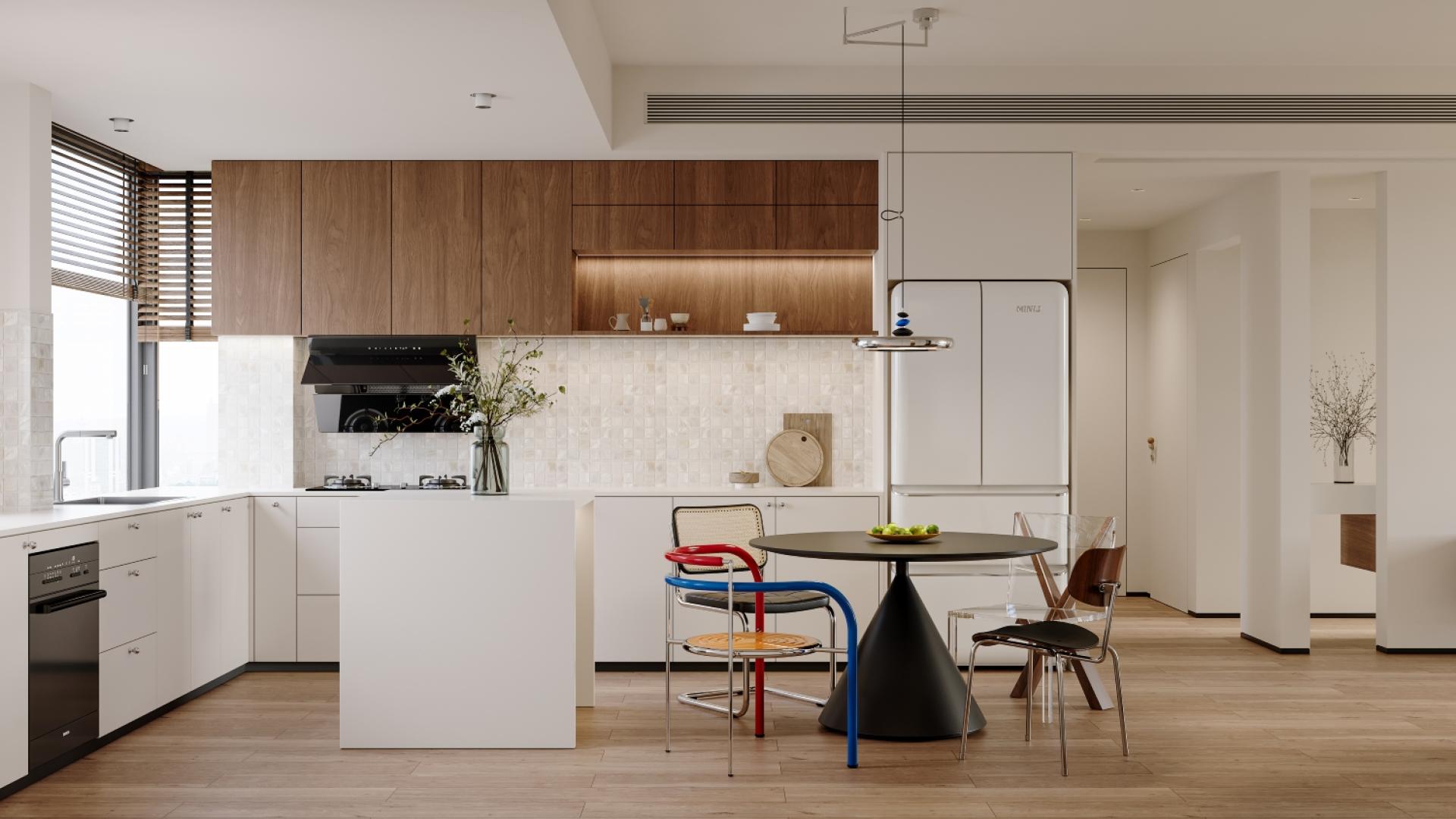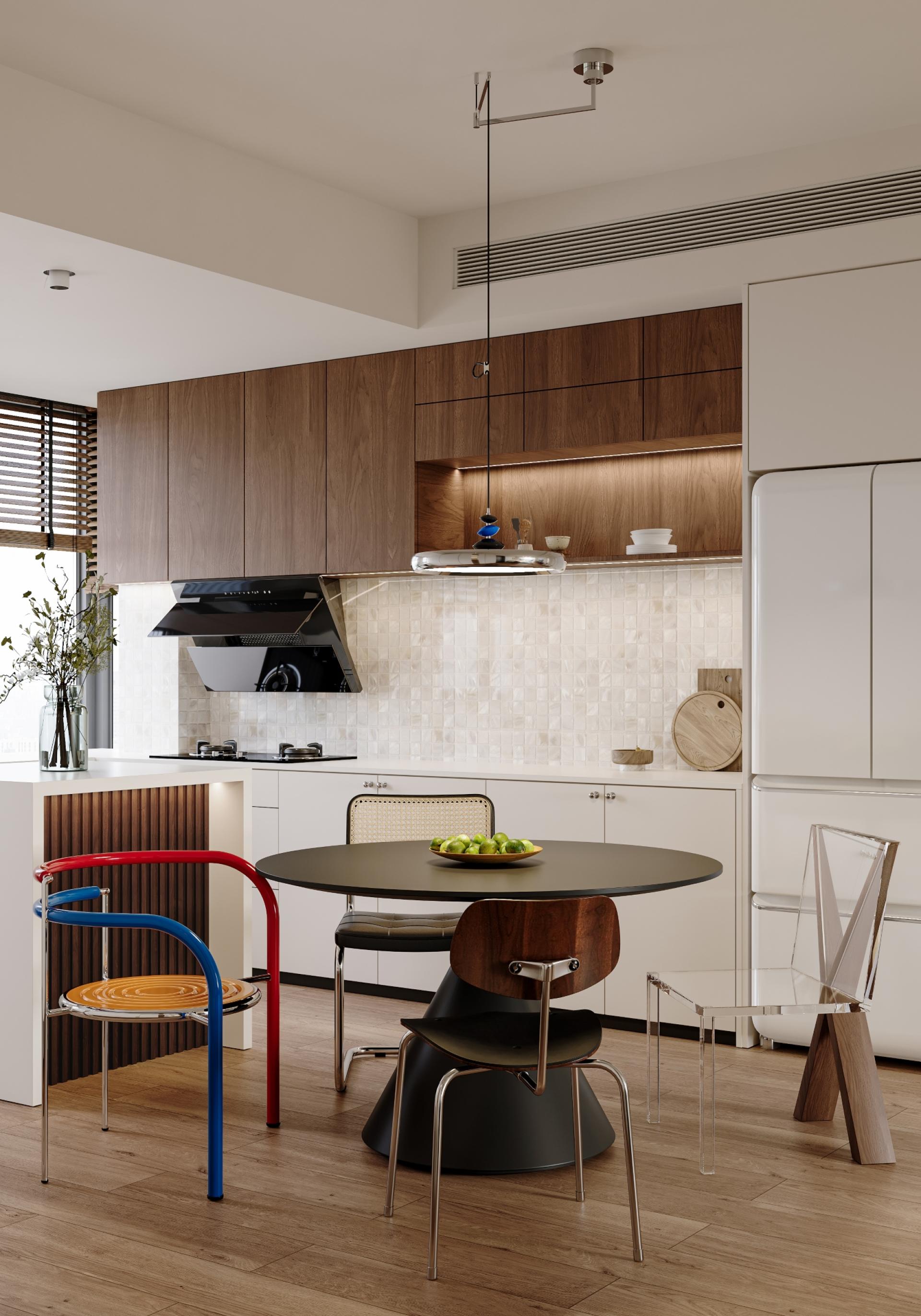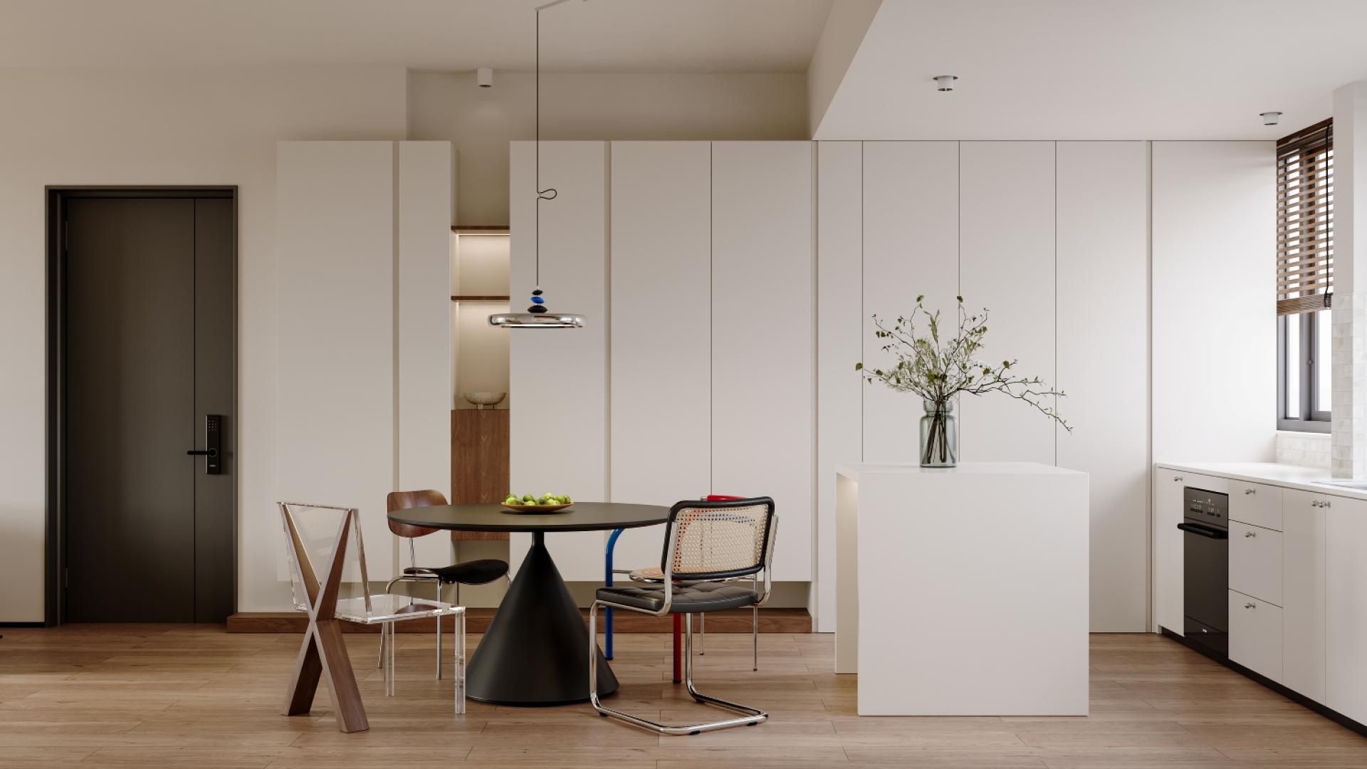 An open slab joins living, dining and kitchen into one continuous activity field, encouraging conversation and interaction. Furniture and pendants of varying shapes and materials, together with curated art and greenery, inject artistic and natural overtones.
