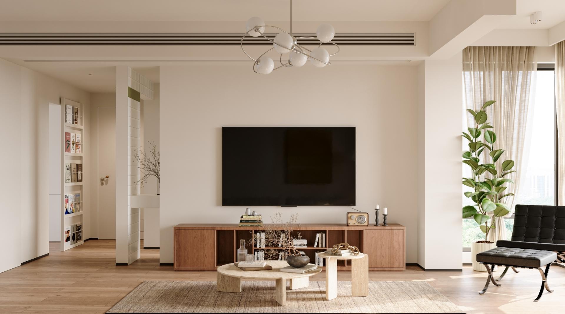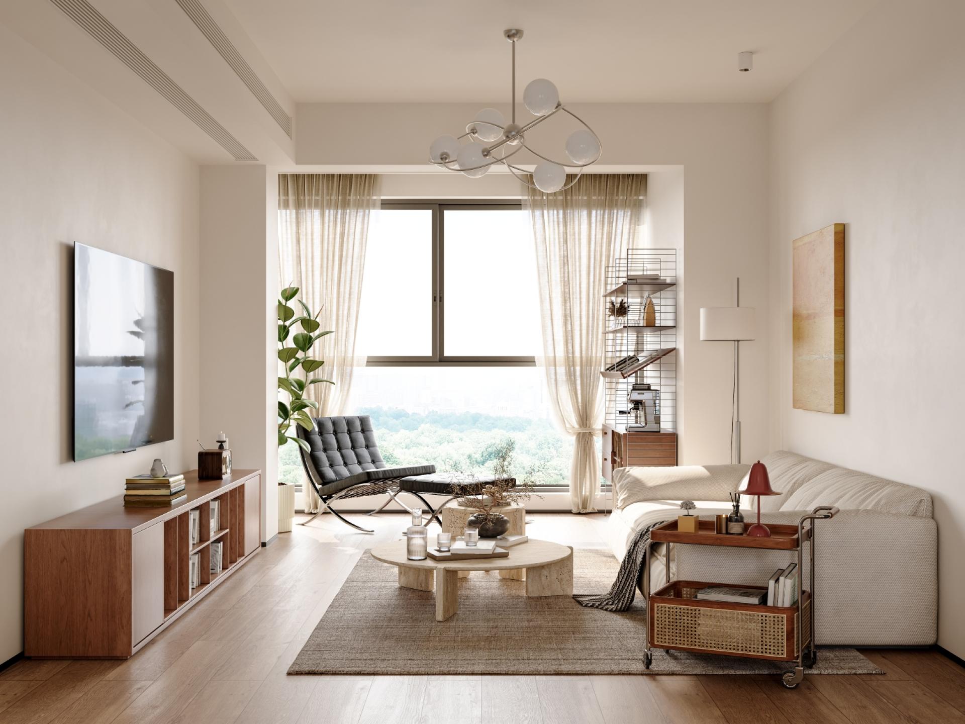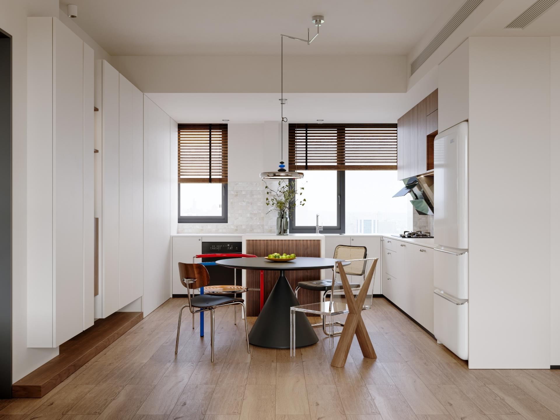 An open slab joins living, dining and kitchen into one continuous activity field, encouraging conversation and interaction. Furniture and pendants of varying shapes and materials, together with curated art and greenery, inject artistic and natural overtones.
