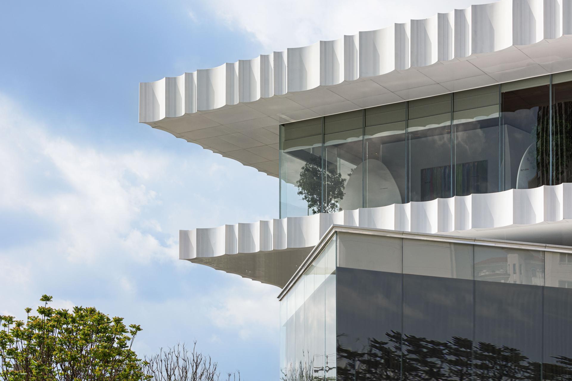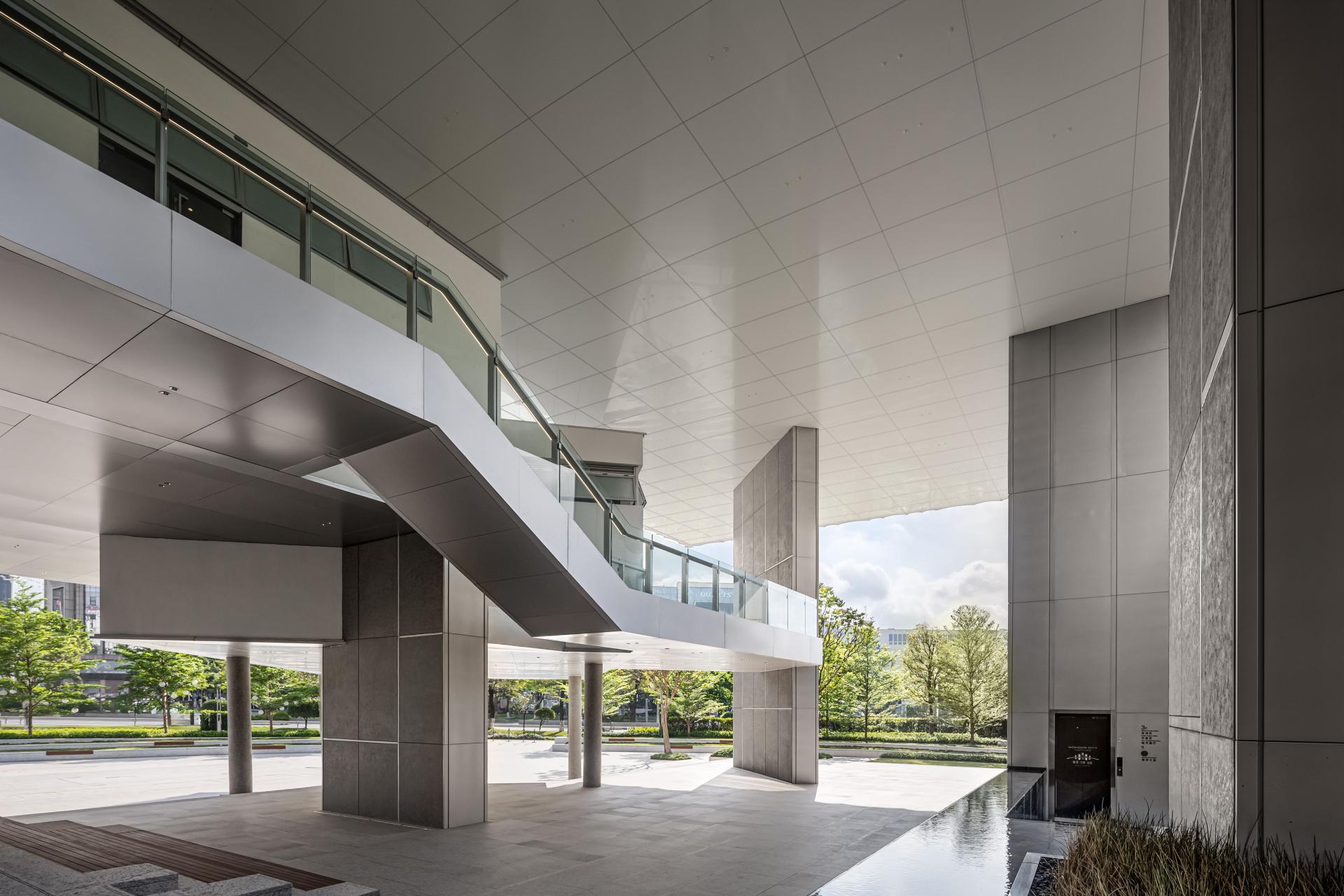 The project draws inspiration from the banyan tree, an iconic element of Lingnan culture that symbolizes urban cohesion and natural vitality. Breaking away from the conventional parallel road network, the building is rotated 45 degrees, with the main facade oriented toward the core commercial area of Panyu Wanbo, framing a 120-degree panoramic view of the city skyline. This not only offers visitors a unique vantage point to observe the urban development but also implies the showroom's role in guiding the community toward progress.