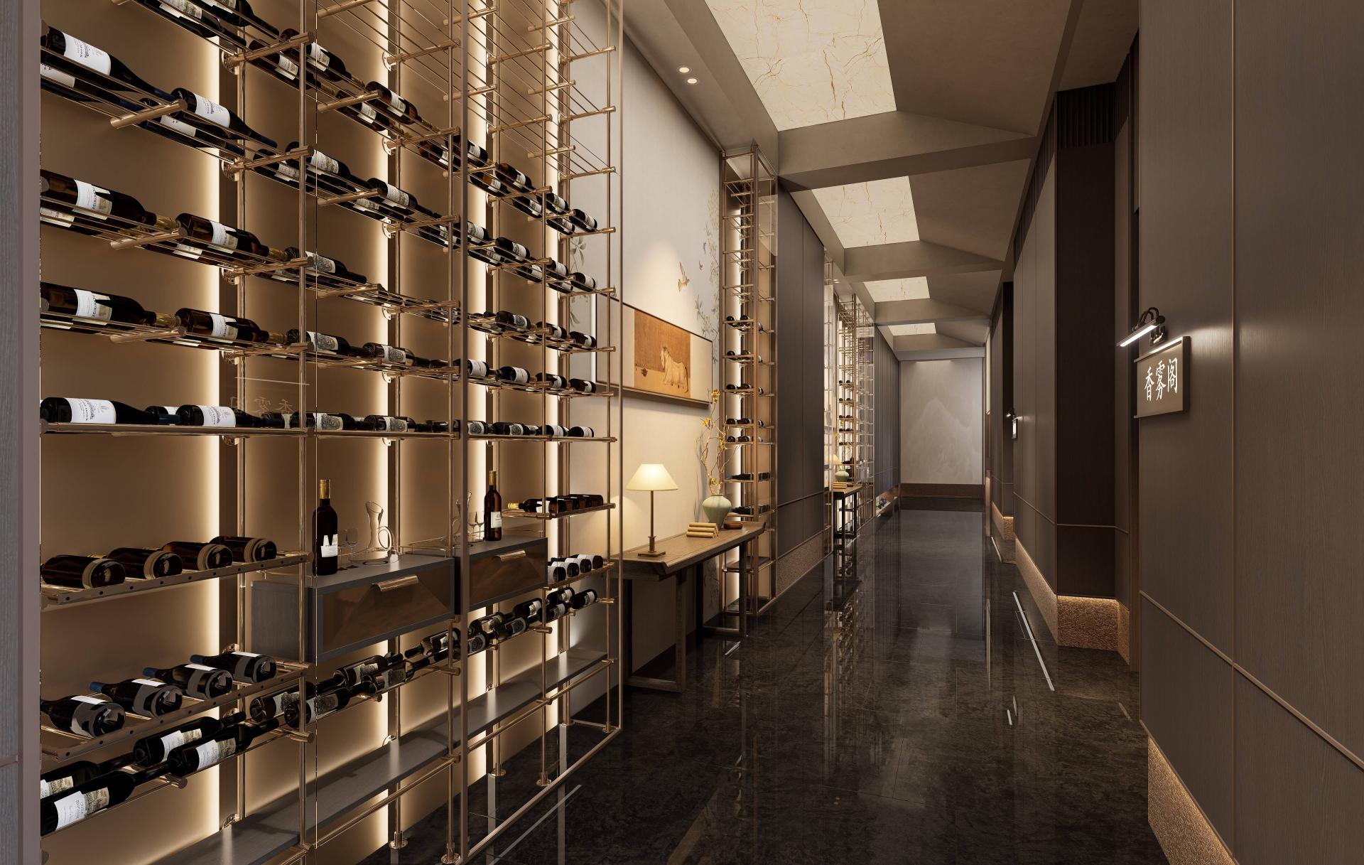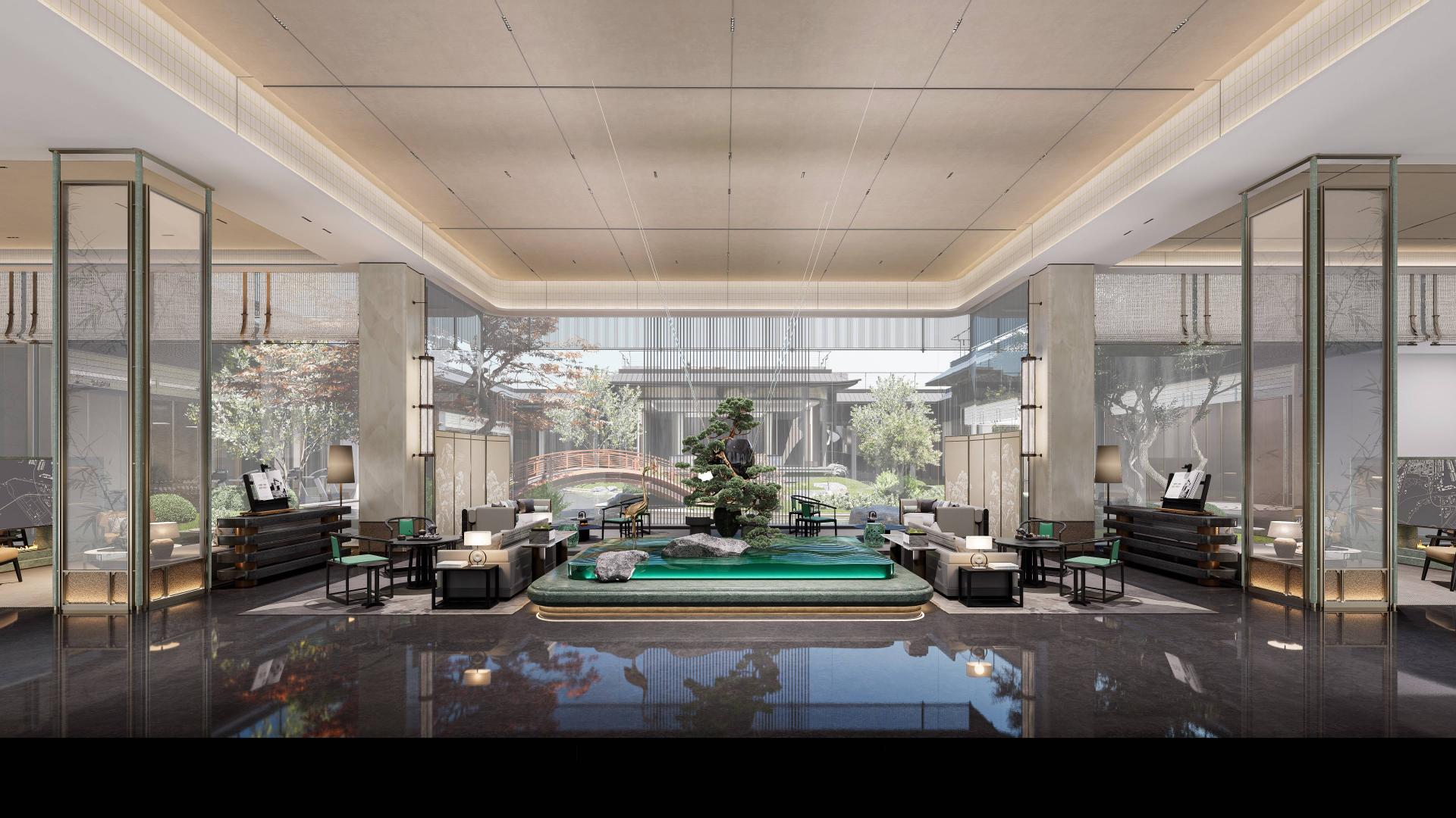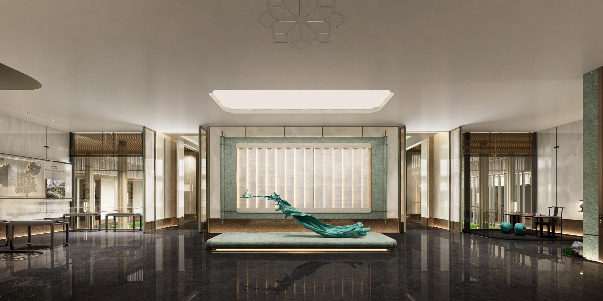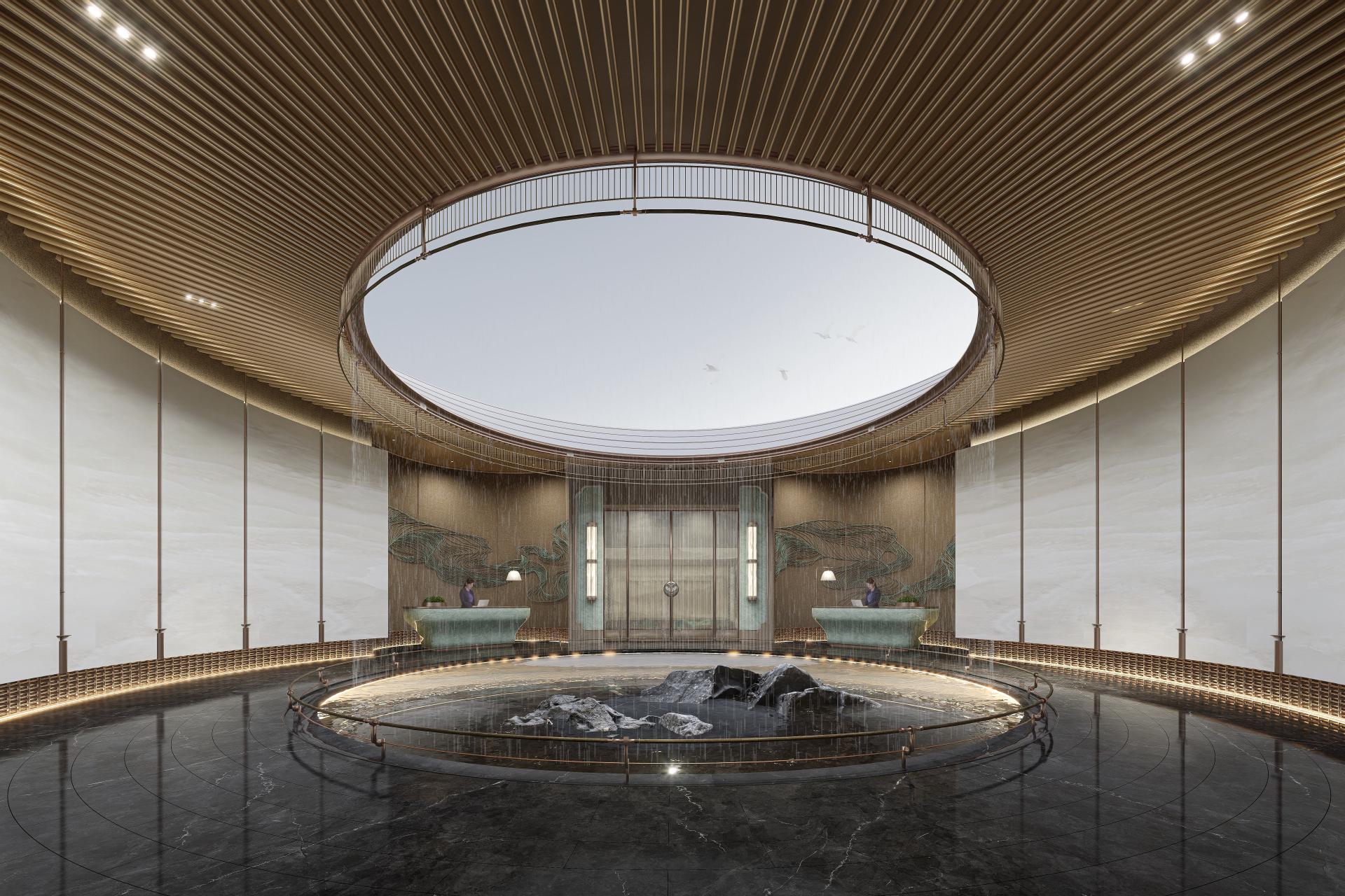Step into the Moon-Gazing Hall, and you’re met with an interplay of light and water: sunlight pours through a circular skylight, mingling with droplets that shimmer across a tranquil water feature. This creates an evocation of the classical verse “pearls large and small cascading onto a jade plate,” imbuing the space with lyrical charm. Walls of jade-toned stone reflect the sophistication of Song Dynasty literati, while the reception backdrop—featuring metal and turquoise art installations—conjures a dreamlike haze. Just beyond, a rear portal shaped like a traditional crabapple gate opens onto an inviting sanctuary.