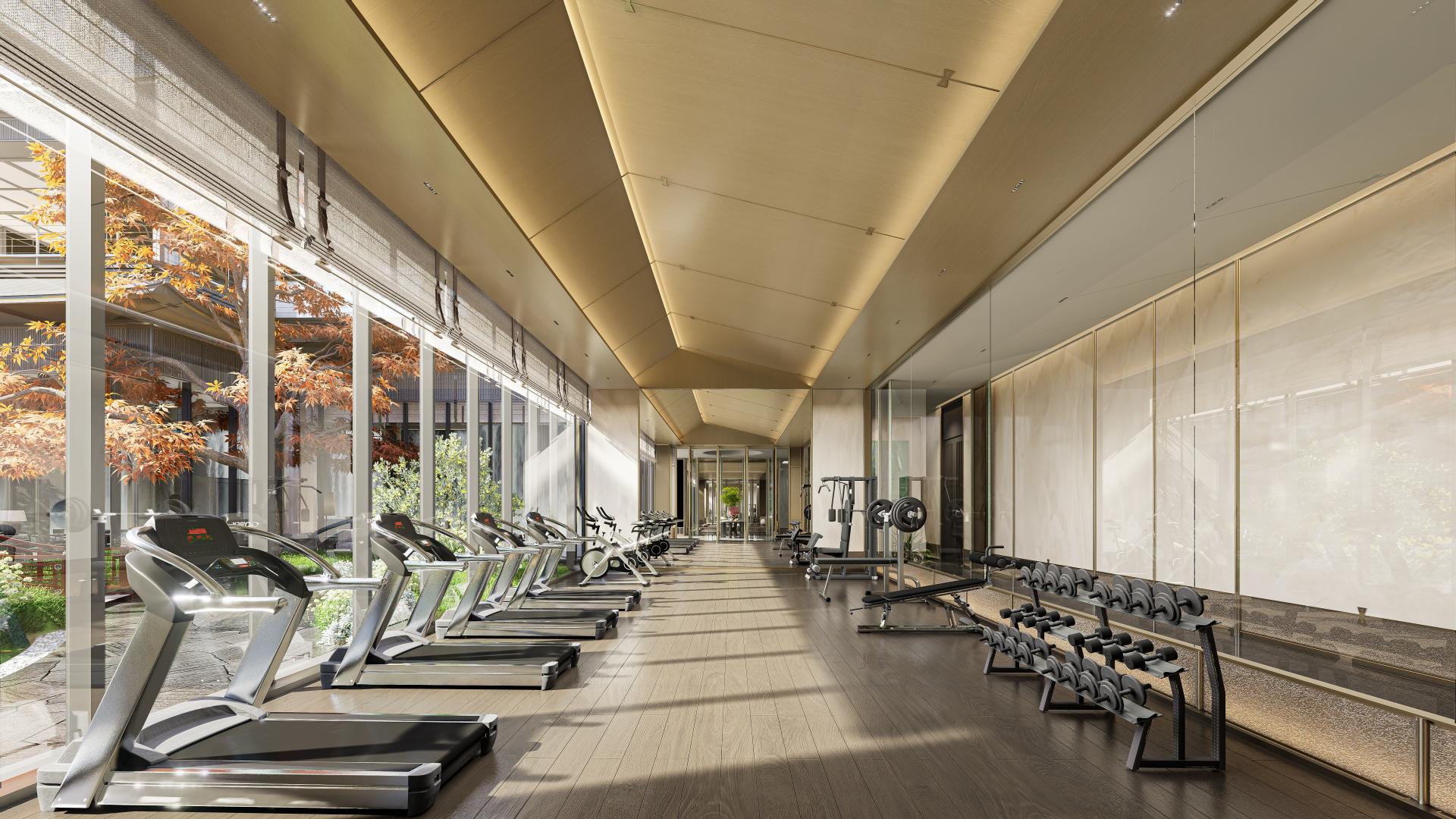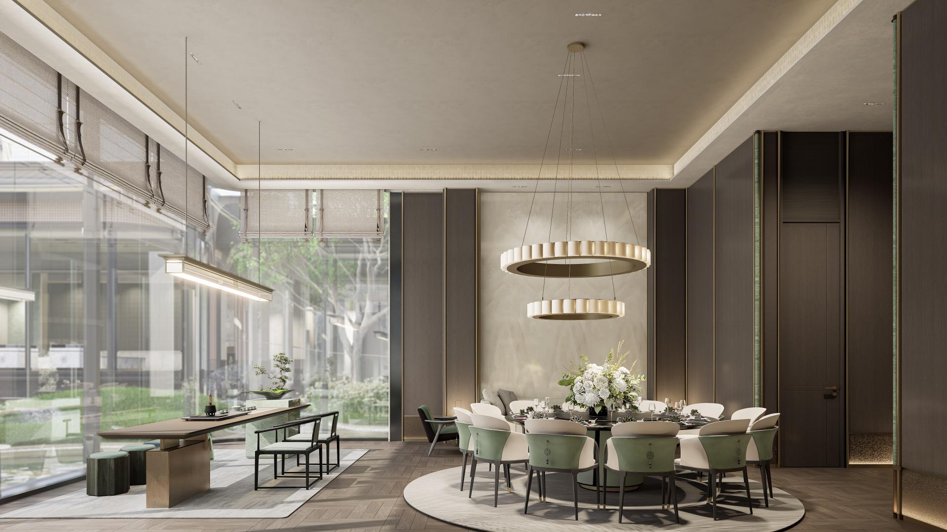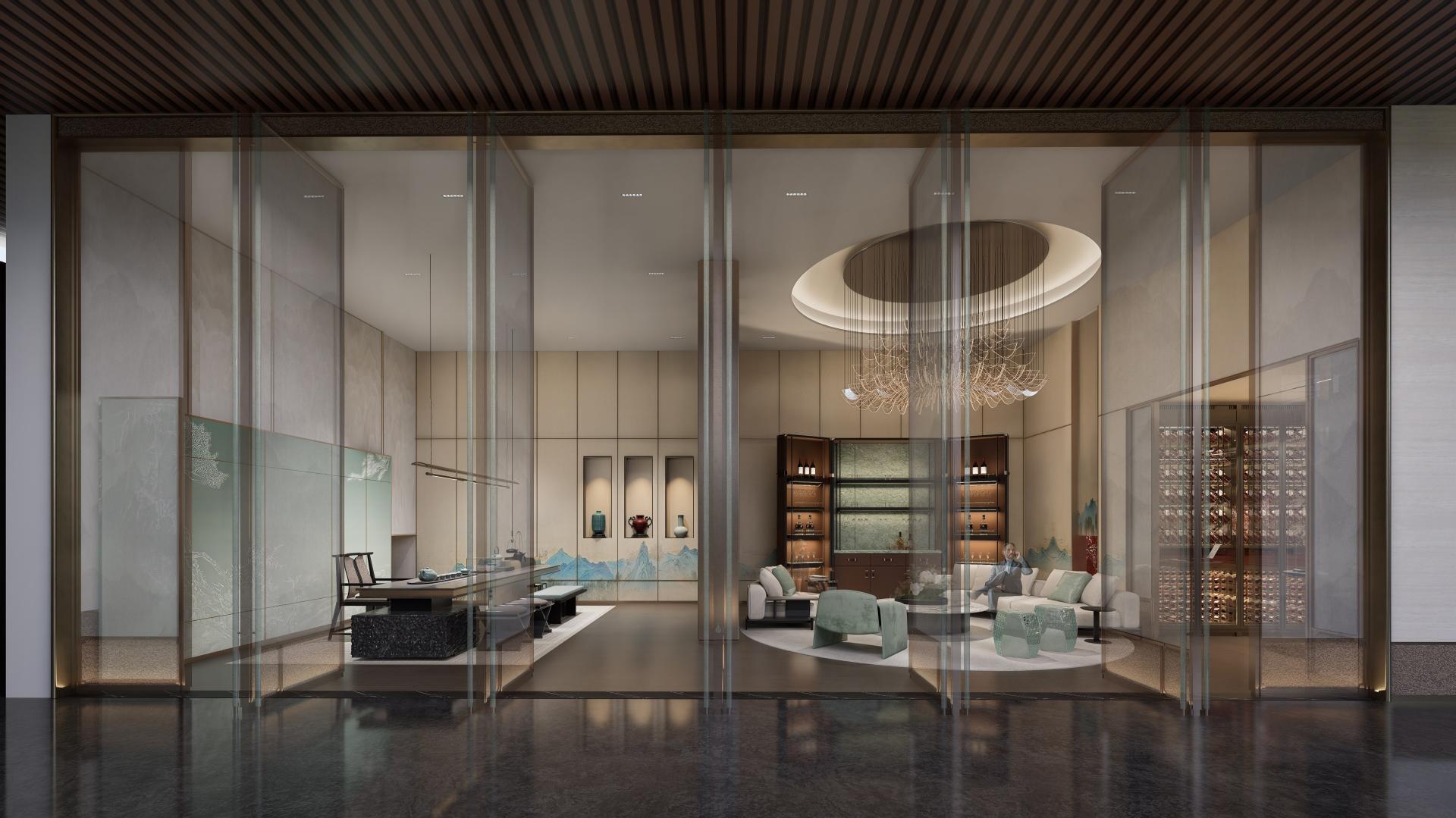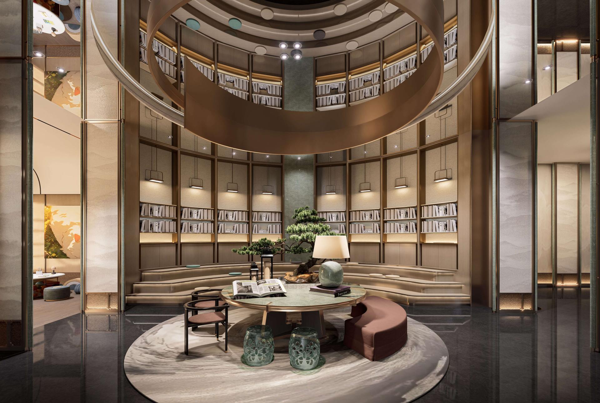 The lobby unfolds with elegant ceremony. A fan-shaped staircase draws attention to a stone relief that unfurls like a landscape scroll. Nearby, a dedicated incense zone—inspired by the Four Arts of Life in the Song Dynasty—imbues homecoming with a sense of ritual. The model display area begins with a landscape rooted in Song Dynasty aesthetics, visually extended by floor-to-ceiling windows that frame views of the sunken clubhouse garden. Flanking both sides, the private dining and wellness zones are arranged in axial harmony, underscoring the elegance of symmetry. In the Dongpo Academy, you can explore the poetry of Su Xun, Su Shi, and Su Zhe. A central reading desk, partially encircled by a curated bookshelf, accommodates diverse reading preferences. Overhead, a scroll-inspired ceiling installation is combined with mirrored glass panels, effectively amplifying dimensional perception.