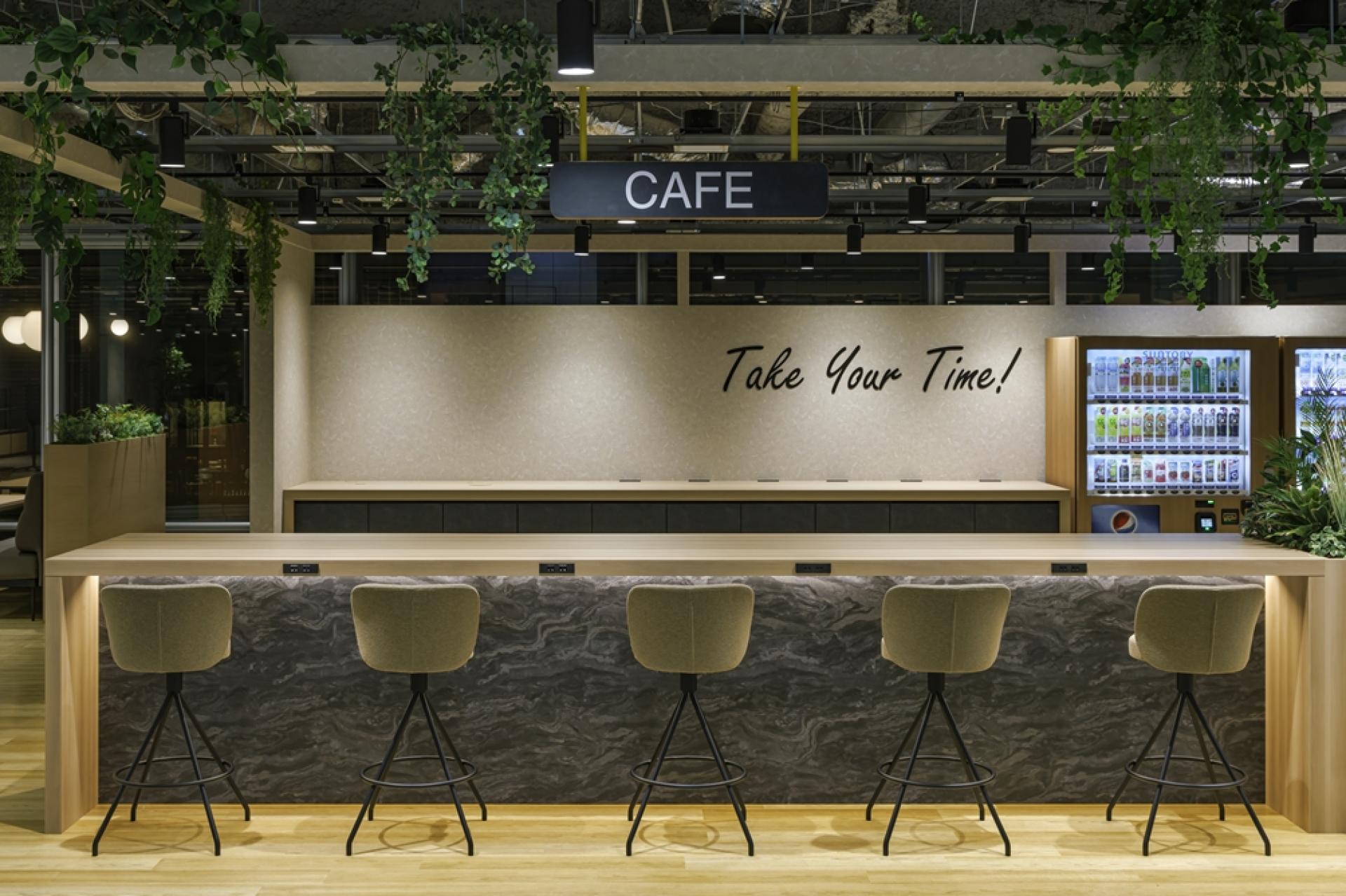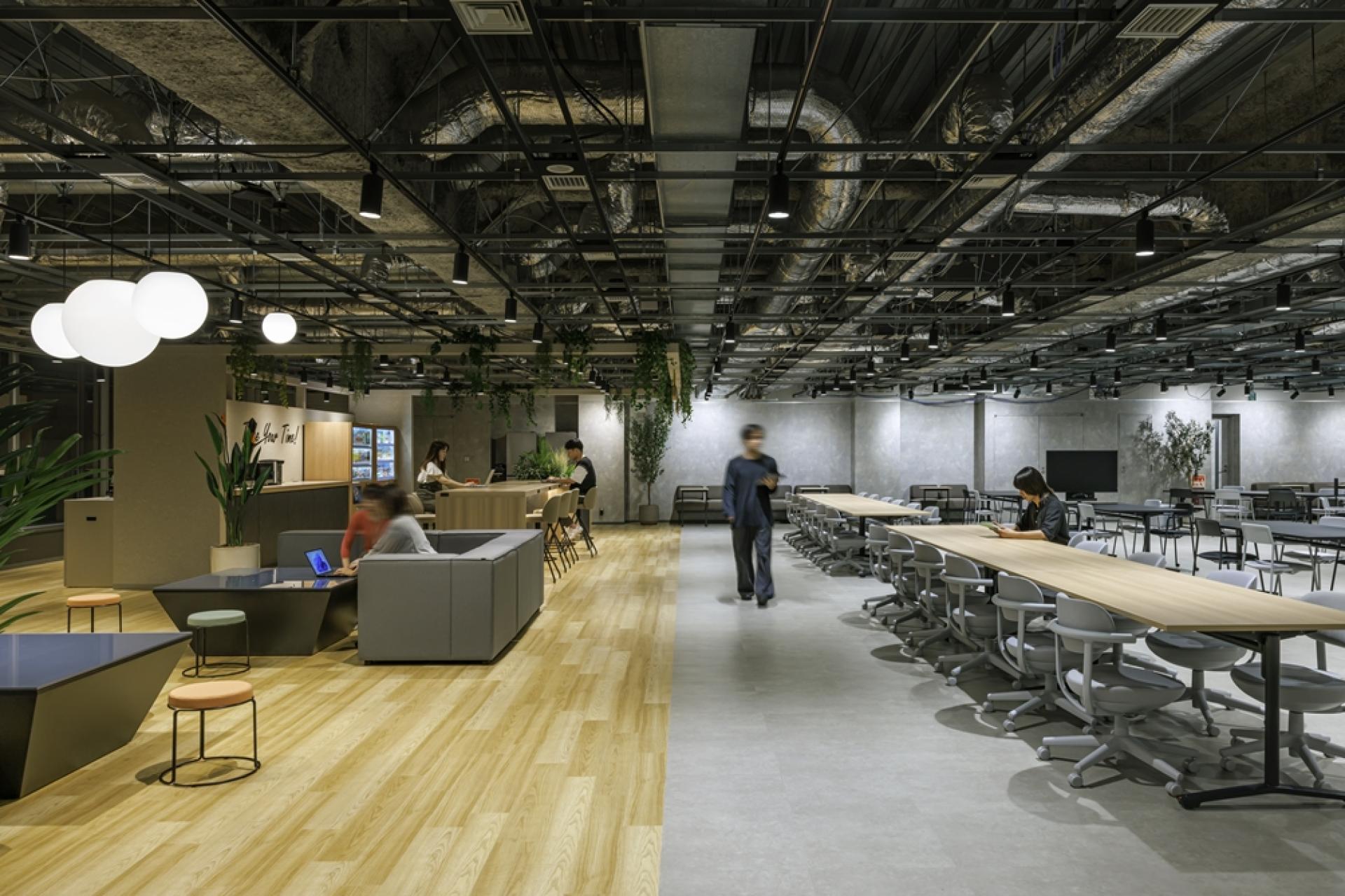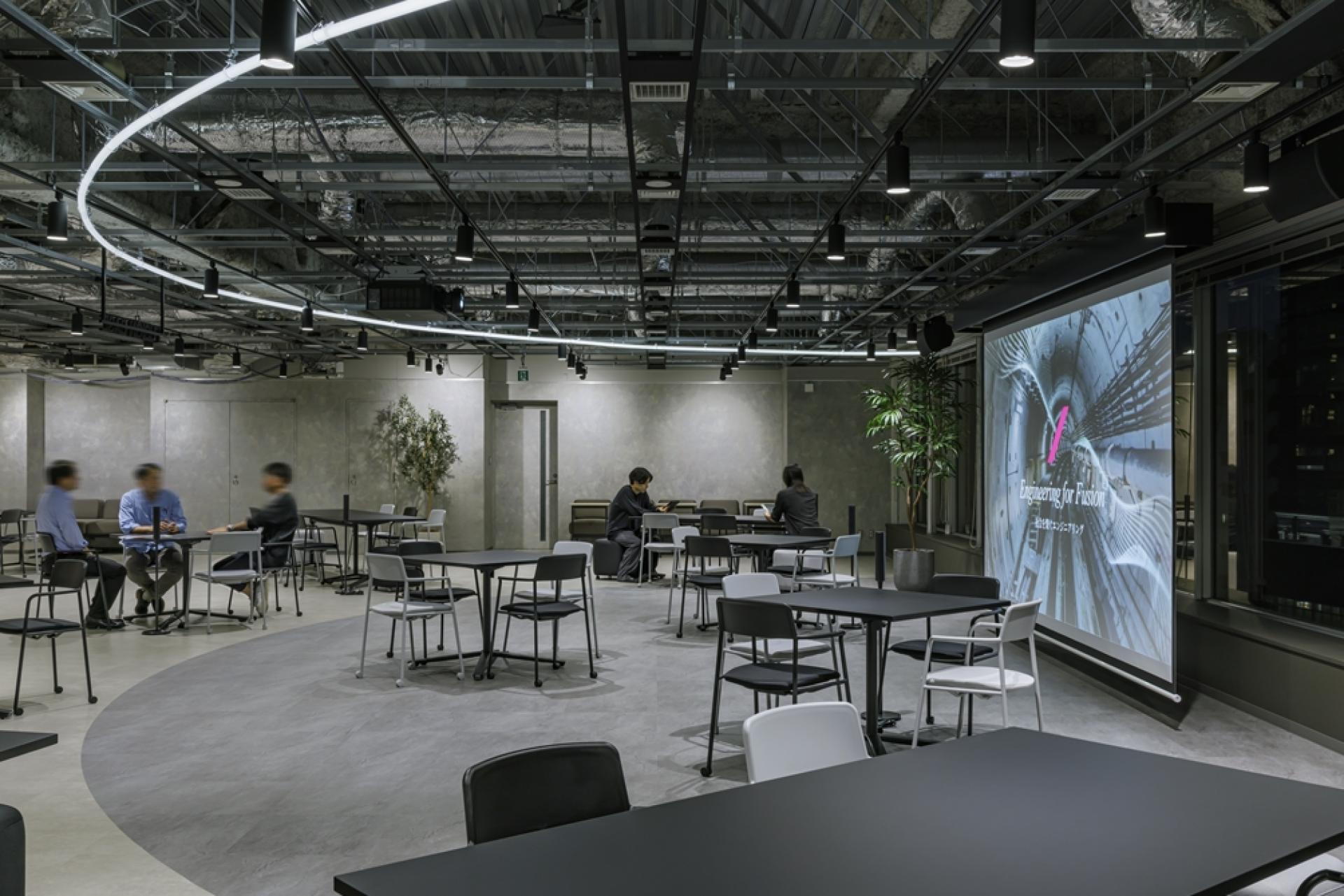 Areas for work and events feature symbolic lighting, stone-patterned flooring, and exposed ceilings to create a modern, street-inspired atmosphere characteristic of Shibuya. The cafe area, dominated by wood and greenery, offers a warm, welcoming ambiance accessible to everyone.