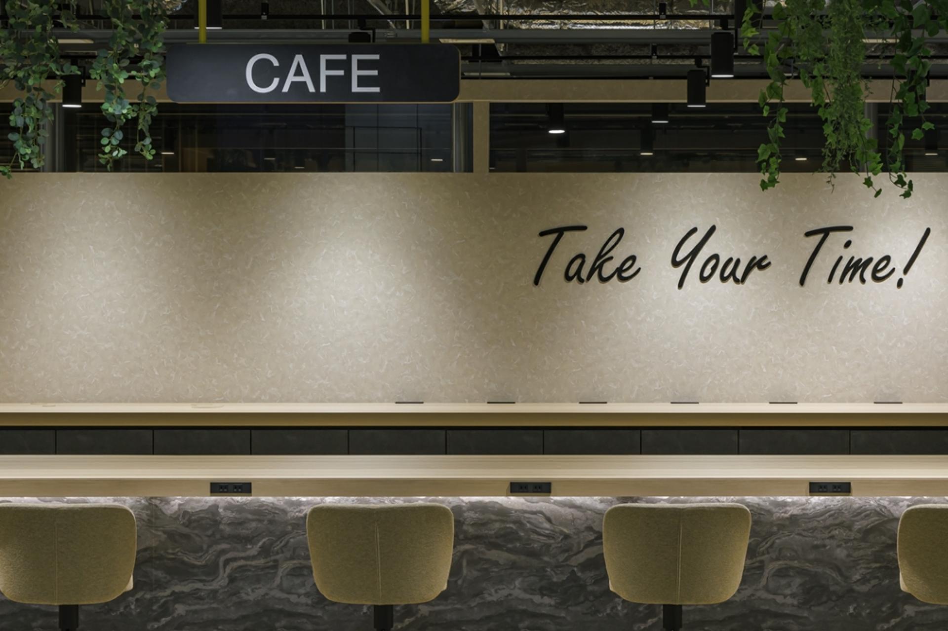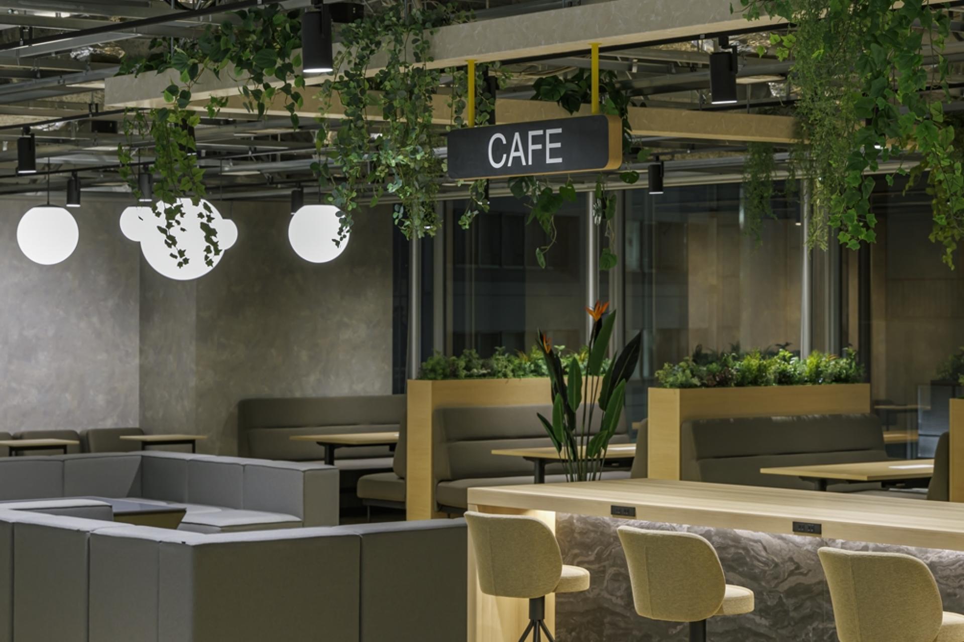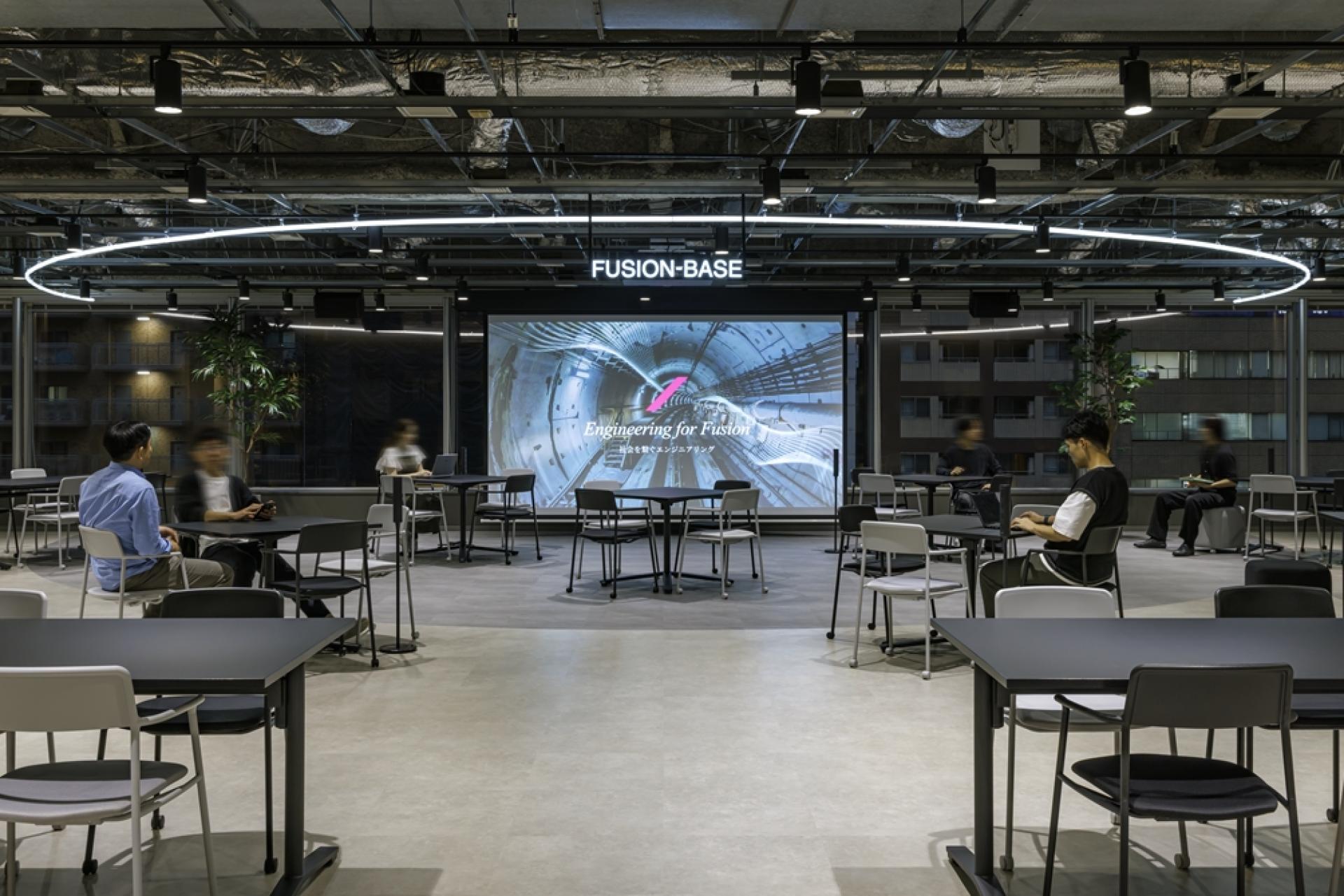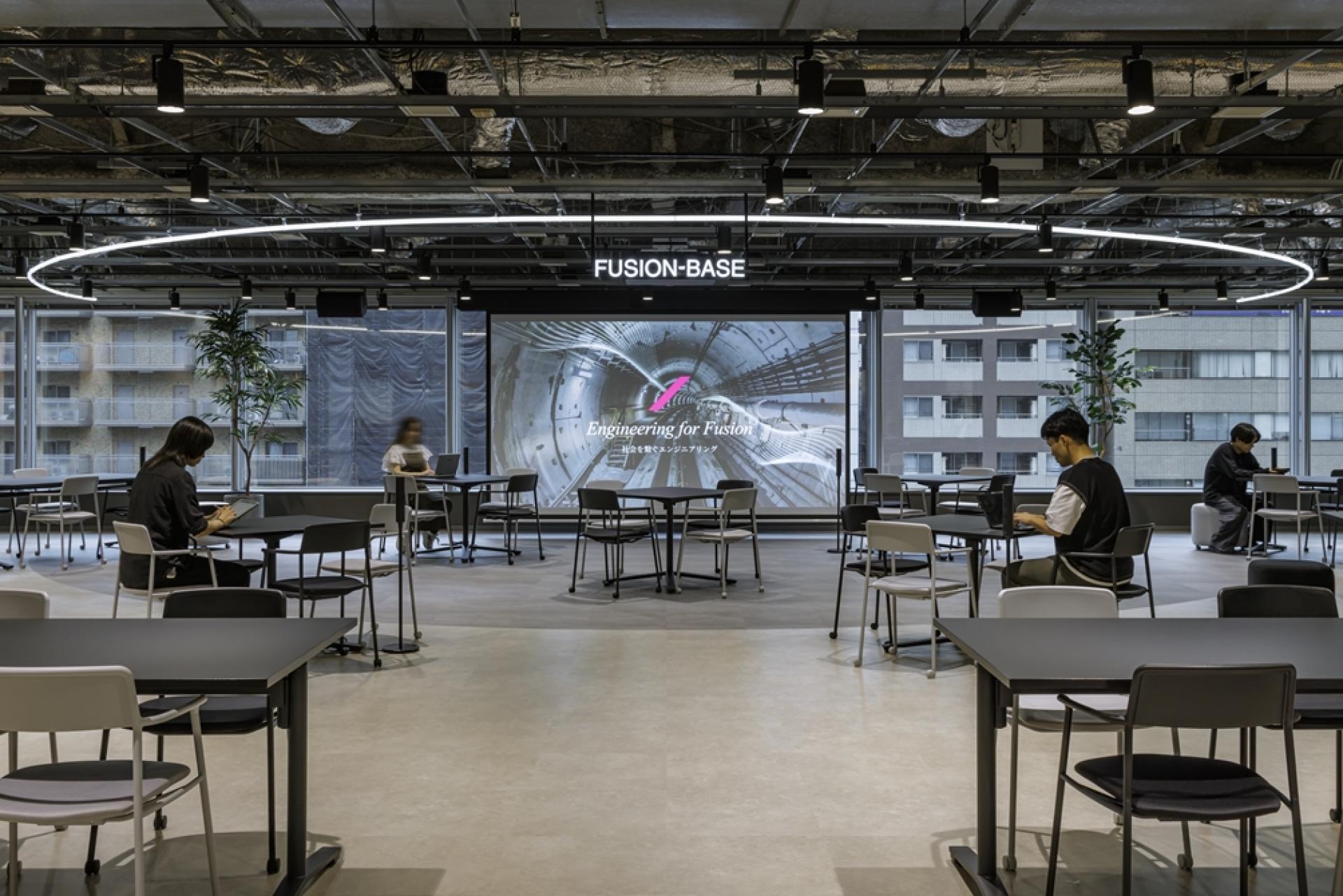 Areas for work and events feature symbolic lighting, stone-patterned flooring, and exposed ceilings to create a modern, street-inspired atmosphere characteristic of Shibuya. The cafe area, dominated by wood and greenery, offers a warm, welcoming ambiance accessible to everyone.