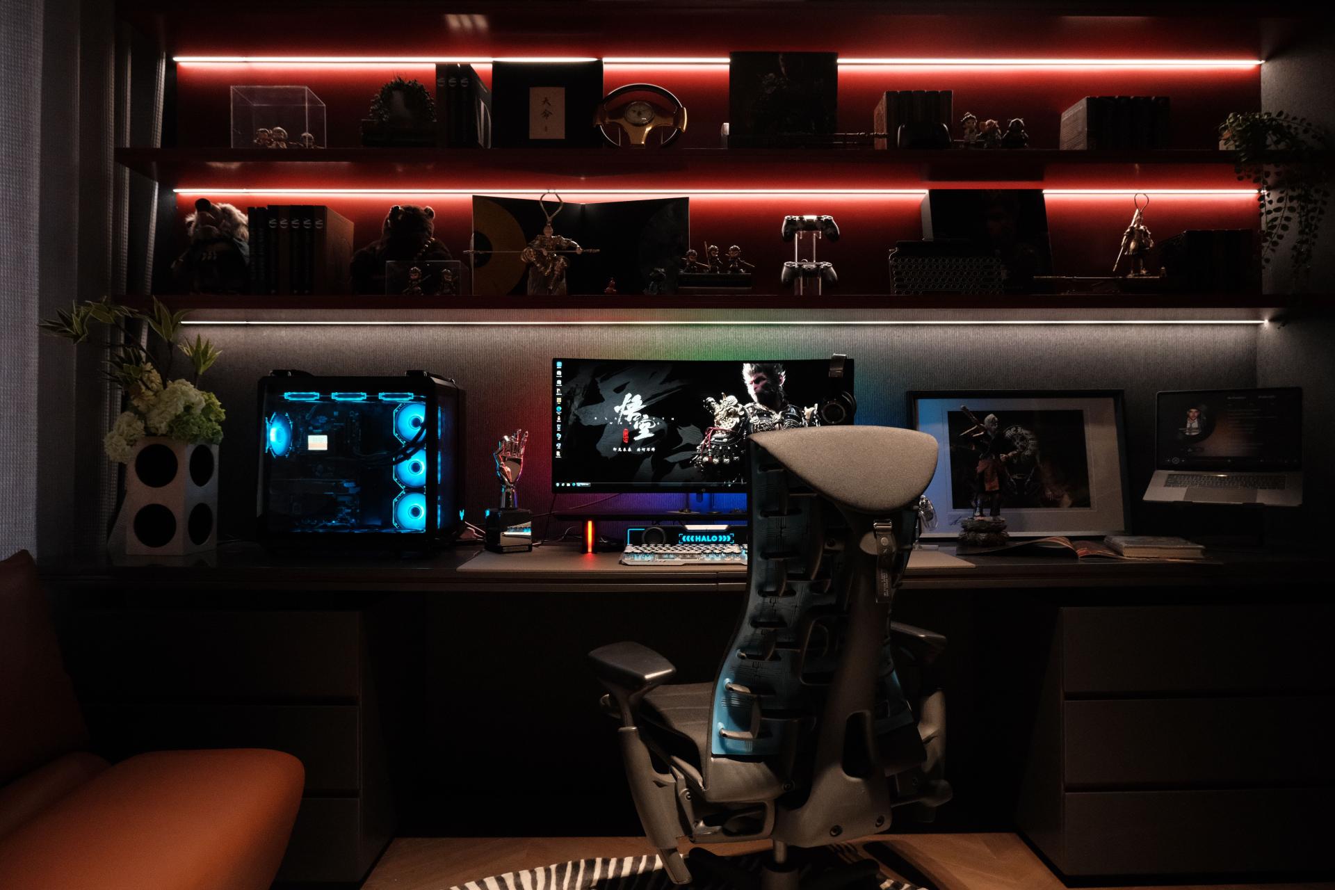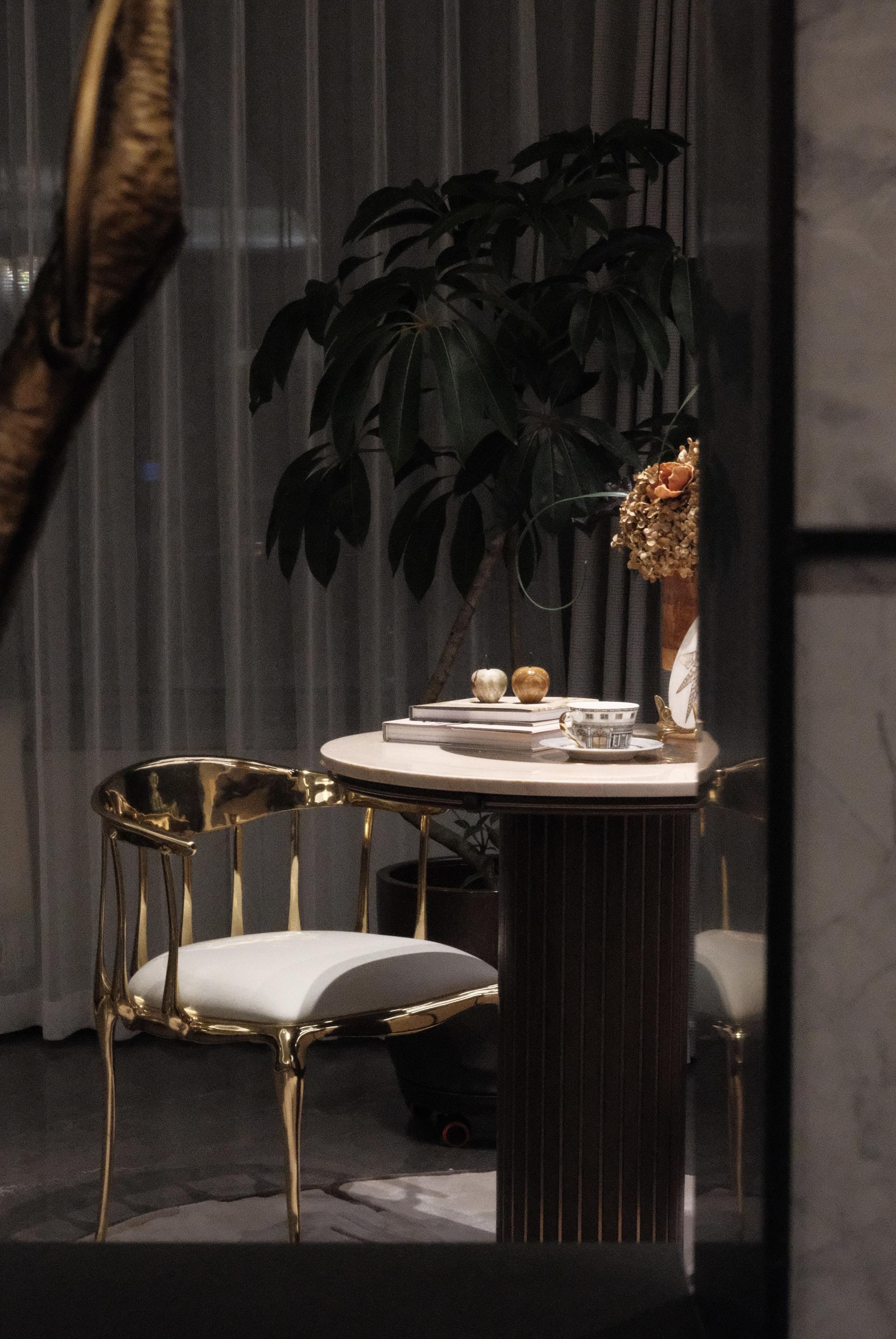 The space features a primary palette of obsidian black and egret gray, accentuated with subtle touches of gleaming gold to create an ambience of understated opulence. Soft furnishings including furniture, decor, and lighting incorporate gilded finishes, complemented by metals and luxurious stone surfaces. These elements not only enhance visual depth and sophistication but also convey a sense of wealth and prestige, perfectly aligning with the high-end positioning of Yuehai Landscapes Building No. 1.