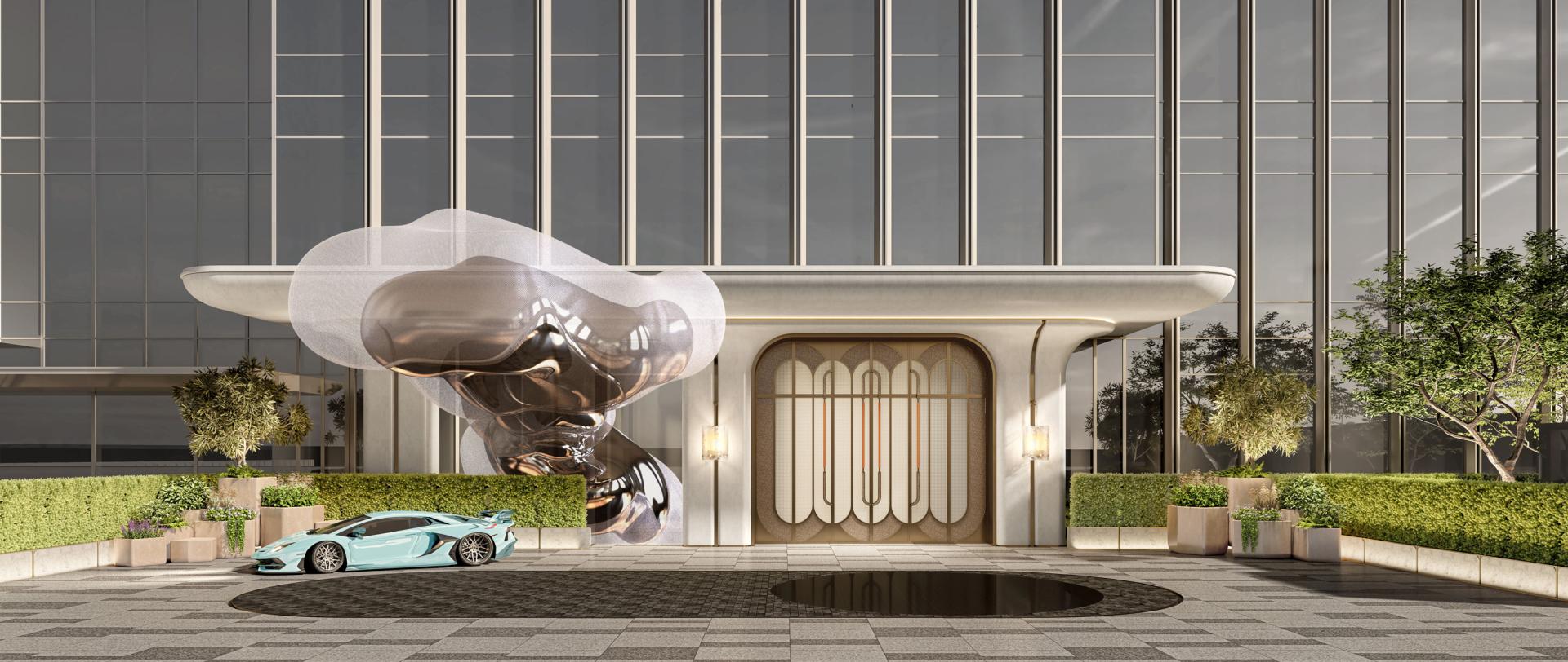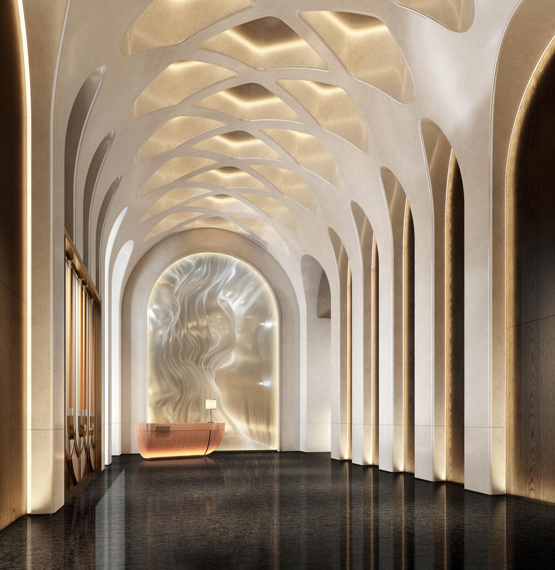 In the sky lobby, layered rippled glass and warm ambient lighting evoke the fleeting shimmer of sunlight refracted through water as a boat slips beneath a bridge—an ephemeral moment transformed into a serene yet striking centerpiece.
