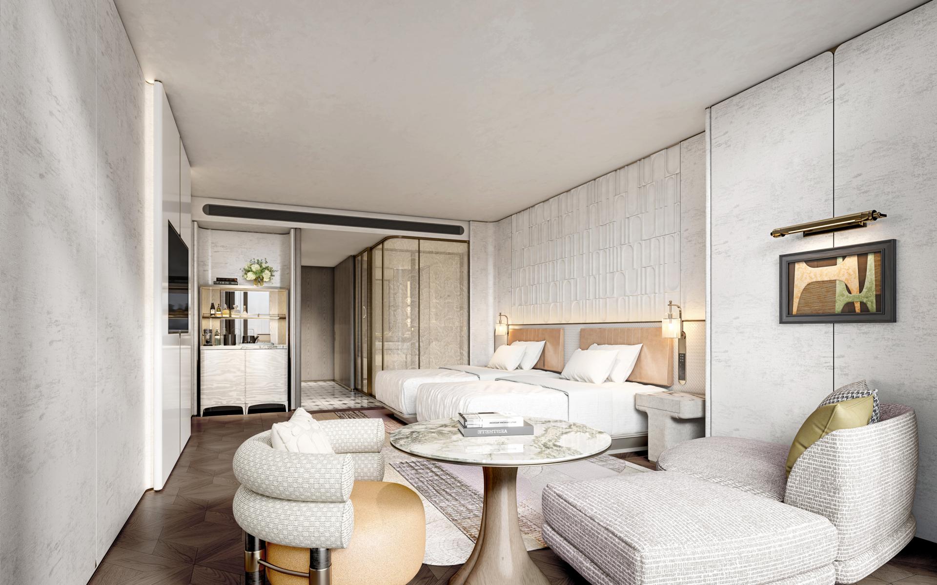 Guestrooms are thoughtfully arranged within the building’s structural grid, offering a variety of layouts to suit guests’ diverse needs. Soft cream-toned wood and warm wall fabrics create a bright, calming modern atmosphere, turning each room into a “living gallery.”